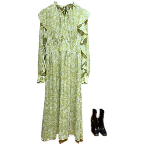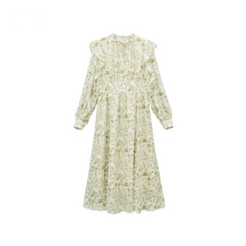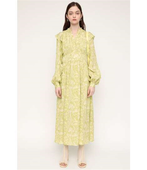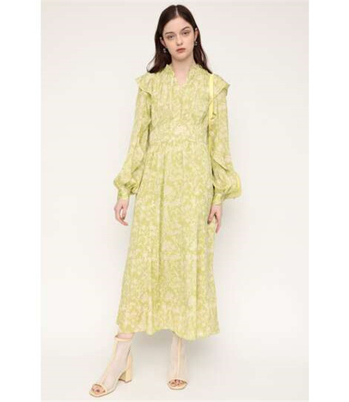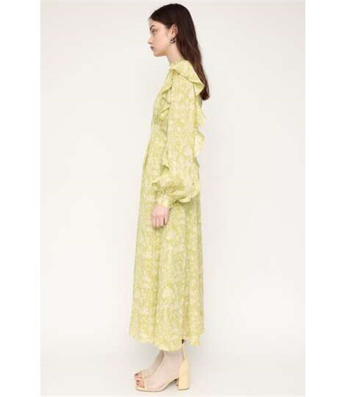 繊細な線画を女性らしいシルエットのワンピースに落とし込みました。いろんな種類の花を組み合わせた春を感じられる花柄です。ゆるかなマーメードシルエットとフリル付きのスリーブが女性らしい印象に。太めのウエストベルトのデザインは、ギャザーのボリュームを抑えてウエスト周りをシャープに見せてくれるアイテム。身頃には裏地が付いています。