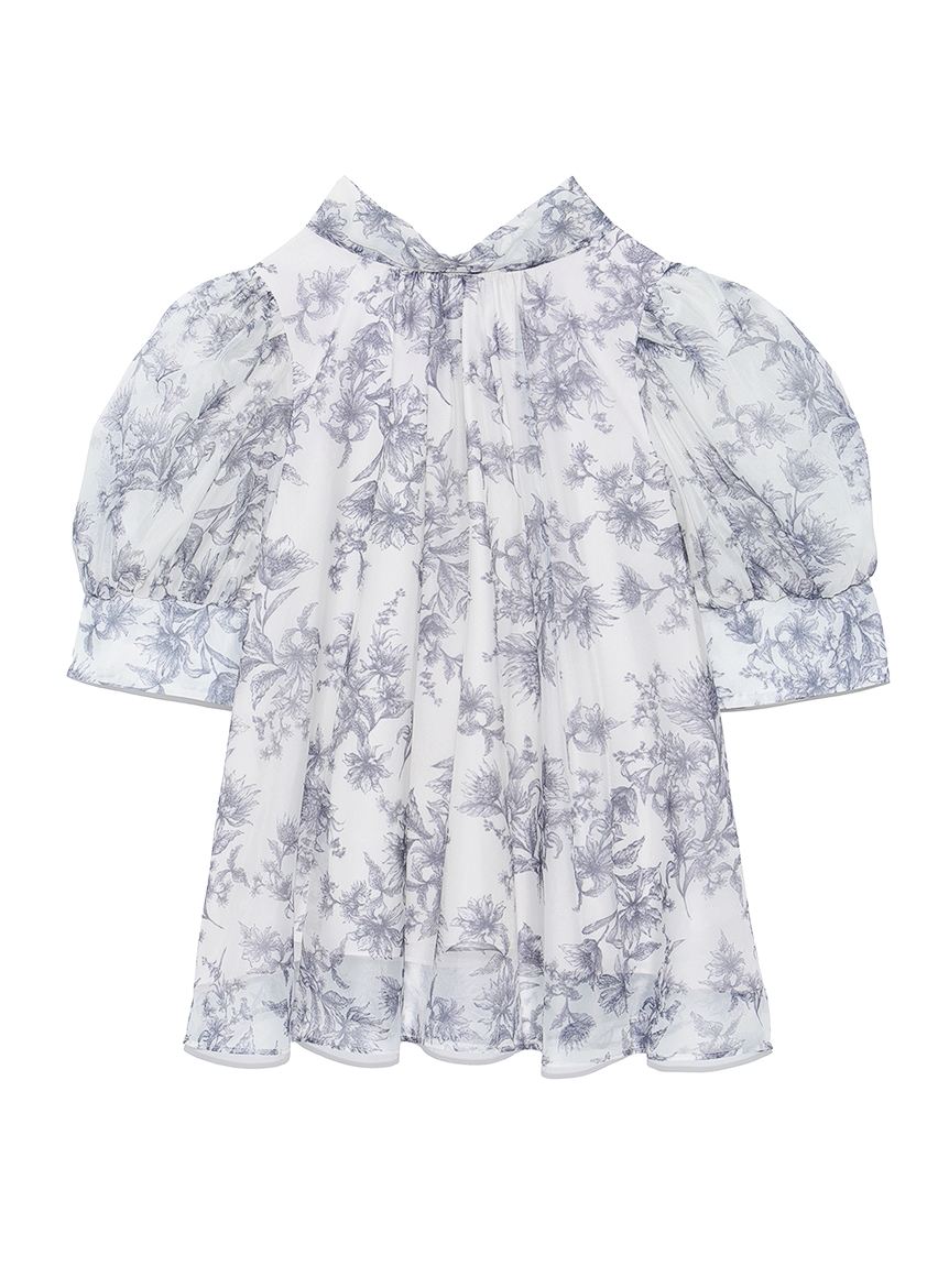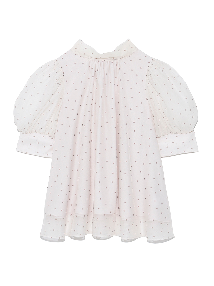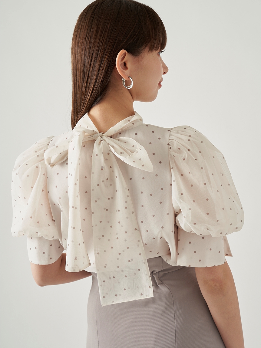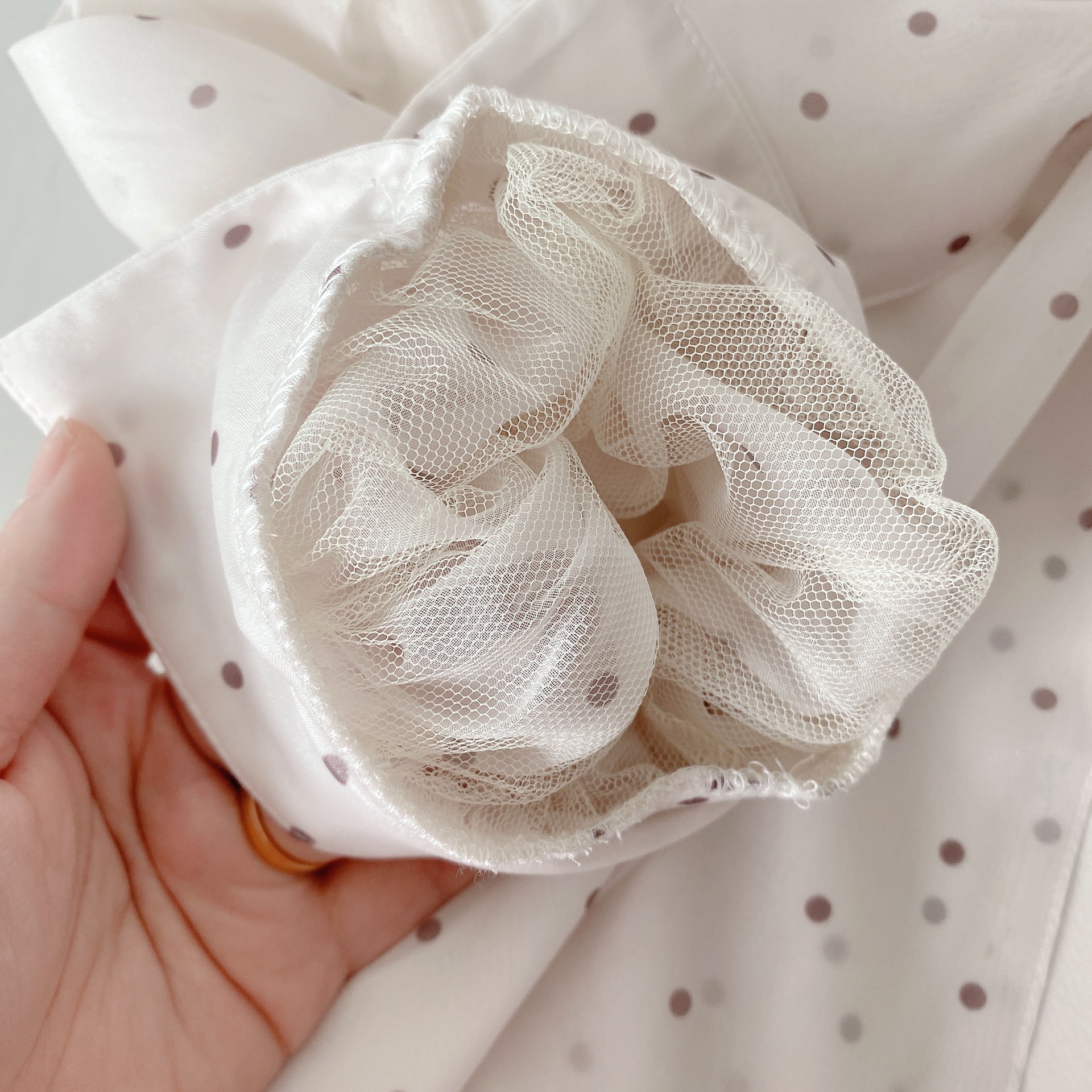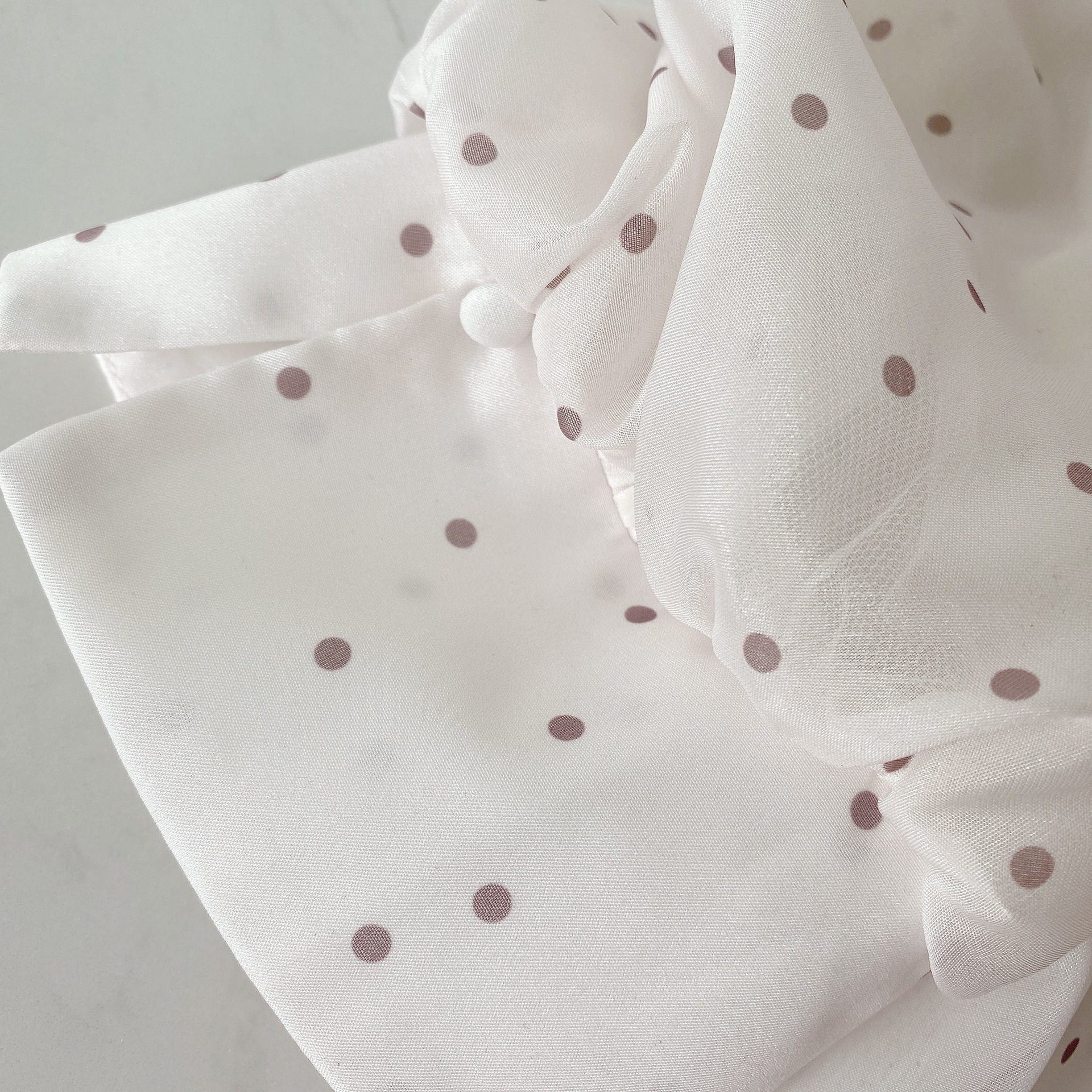 品の良いシアー感と光沢を持つオーガンジー素材を使用。合わせやすいオフホワイト、モカに、愛らしいドット柄、クラシカルなフラワー柄を加えた4色のカラー展開でお届けします。