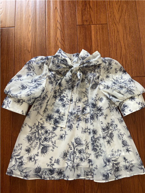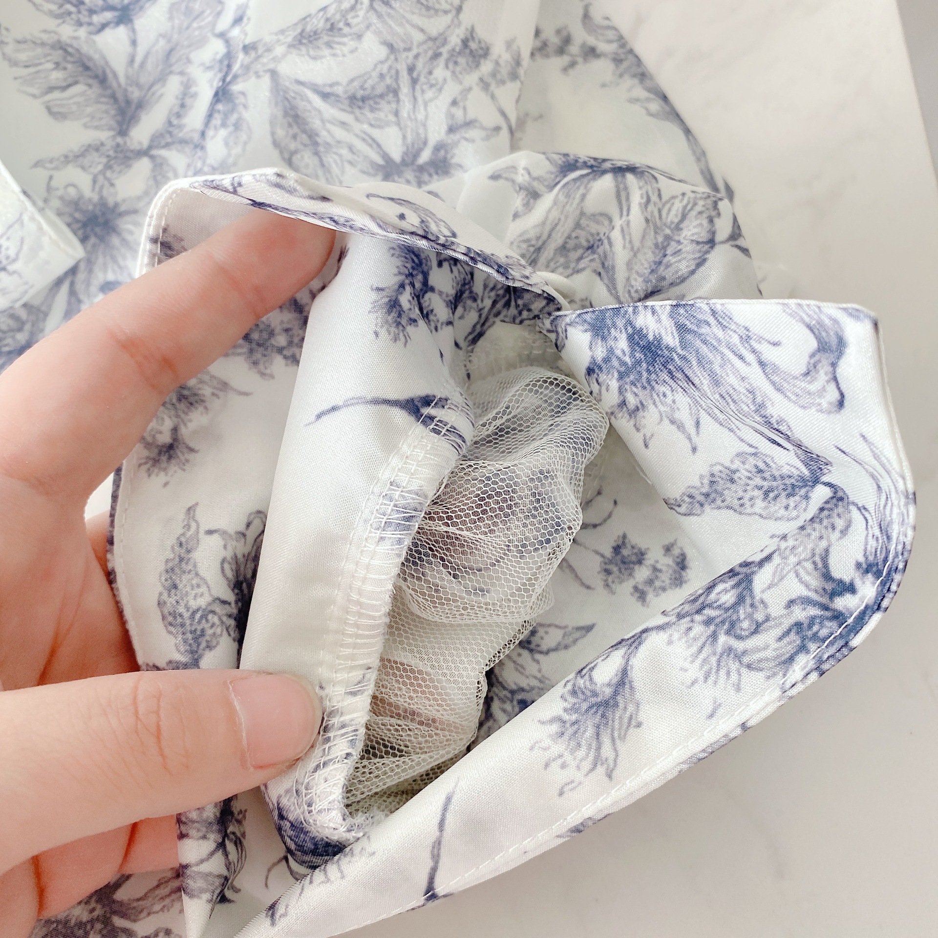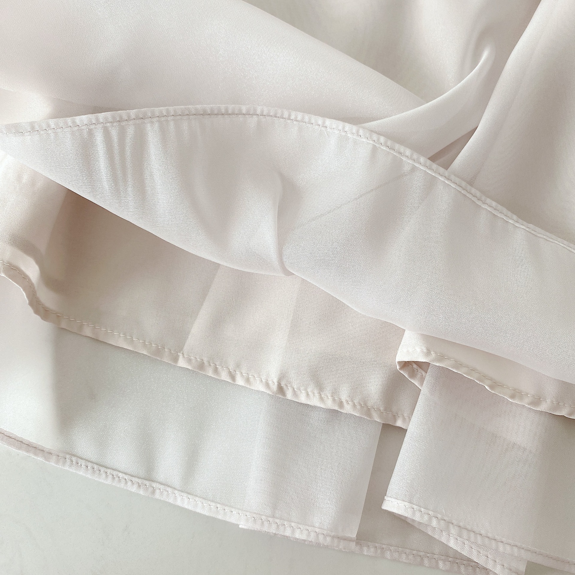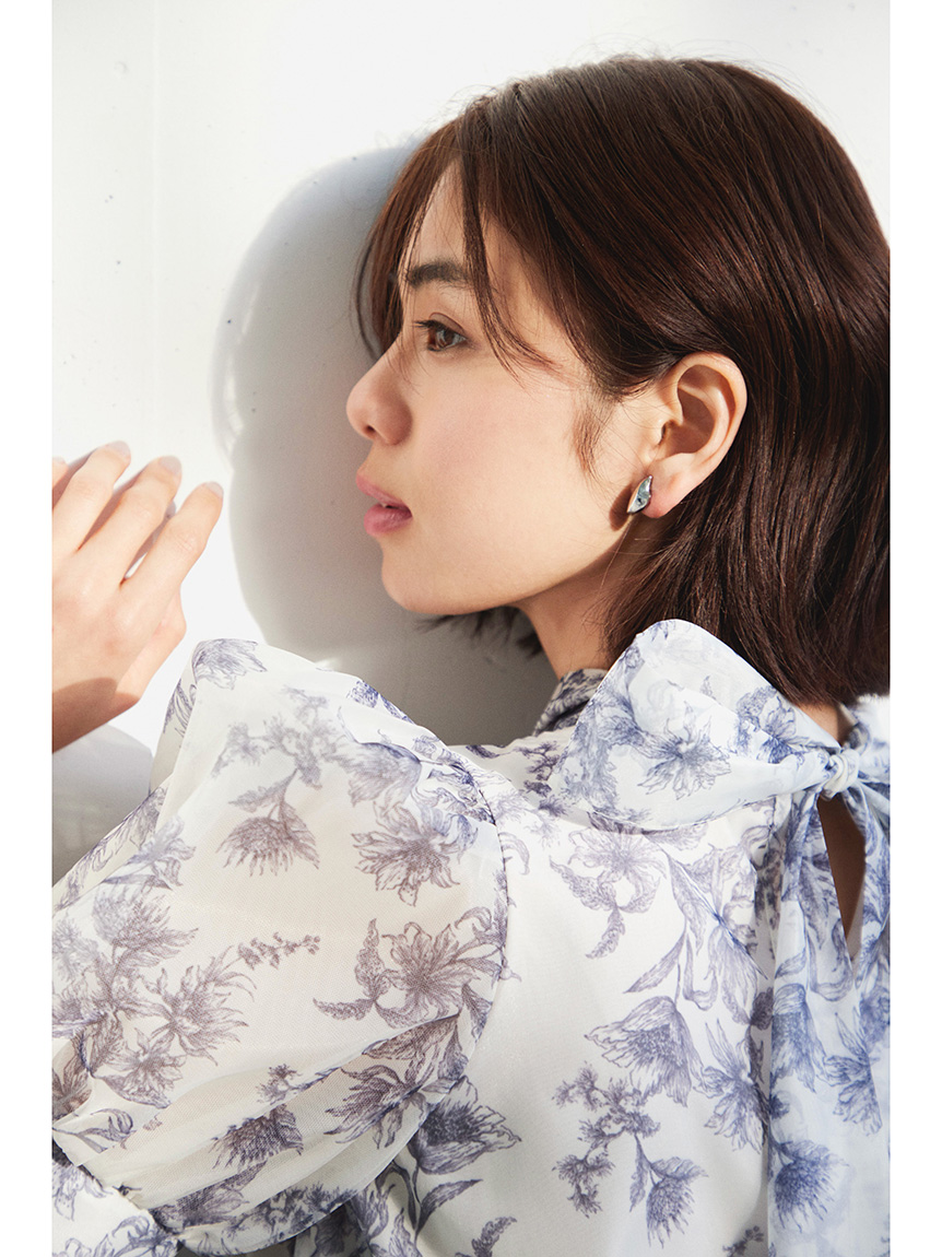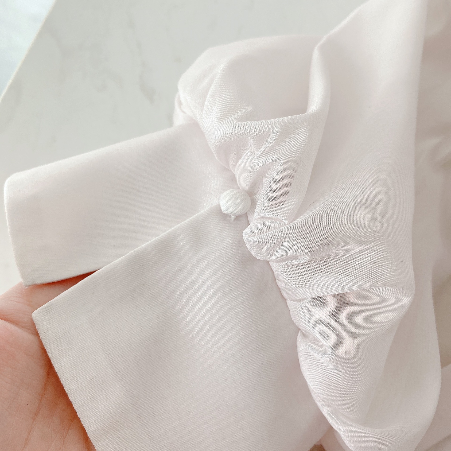 品の良いシアー感と光沢を持つオーガンジー素材を使用。合わせやすいオフホワイト、モカに、愛らしいドット柄、クラシカルなフラワー柄を加えた4色のカラー展開でお届けします。