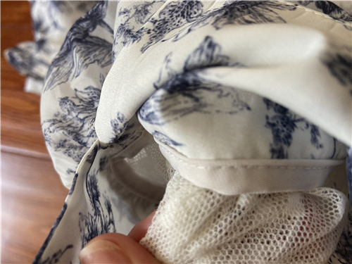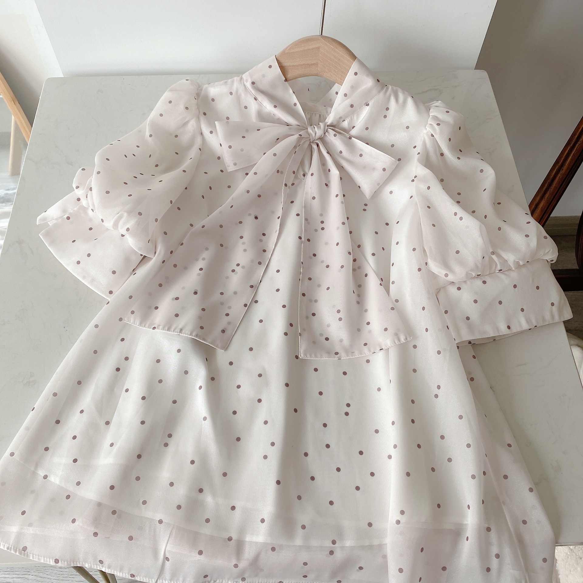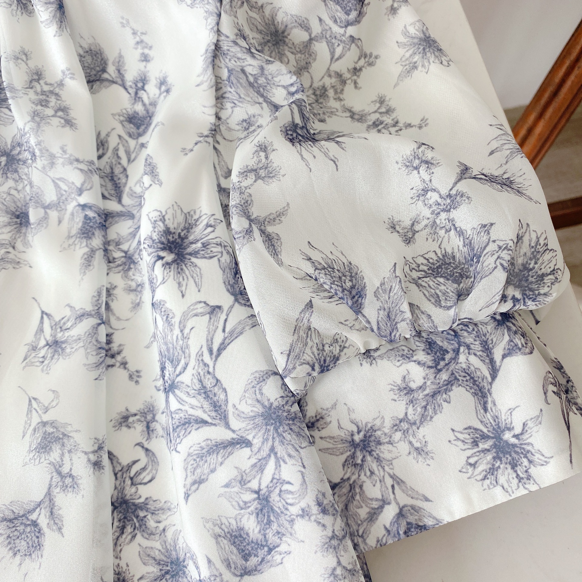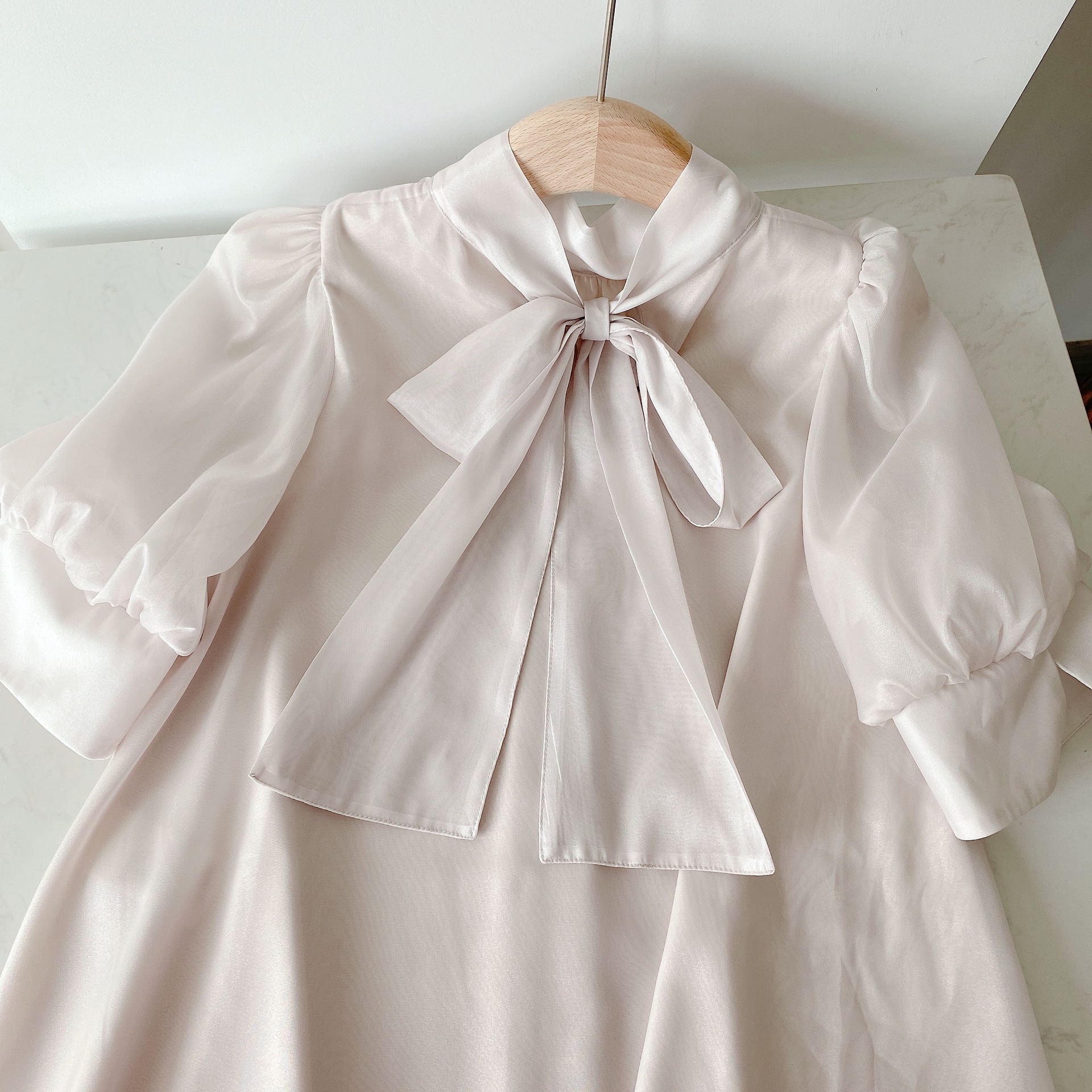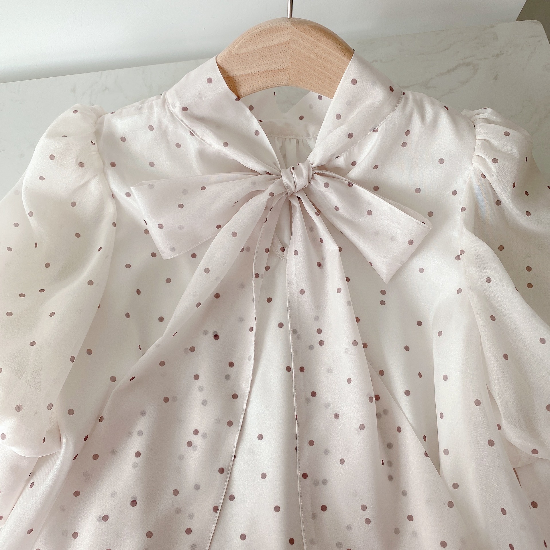 品の良いシアー感と光沢を持つオーガンジー素材を使用。合わせやすいオフホワイト、モカに、愛らしいドット柄、クラシカルなフラワー柄を加えた4色のカラー展開でお届けします。