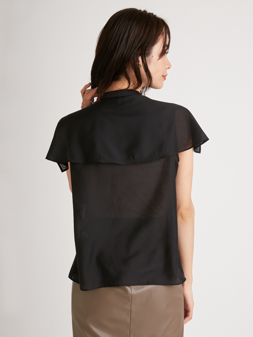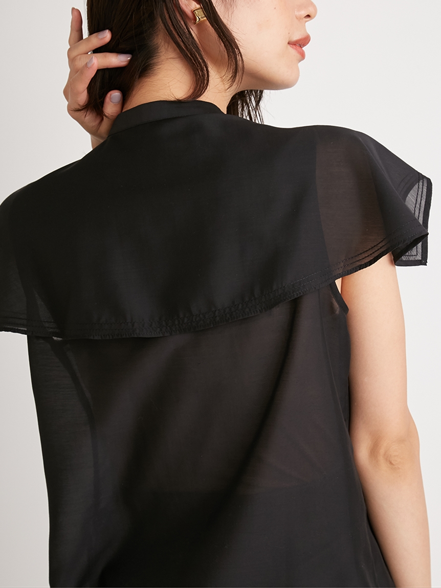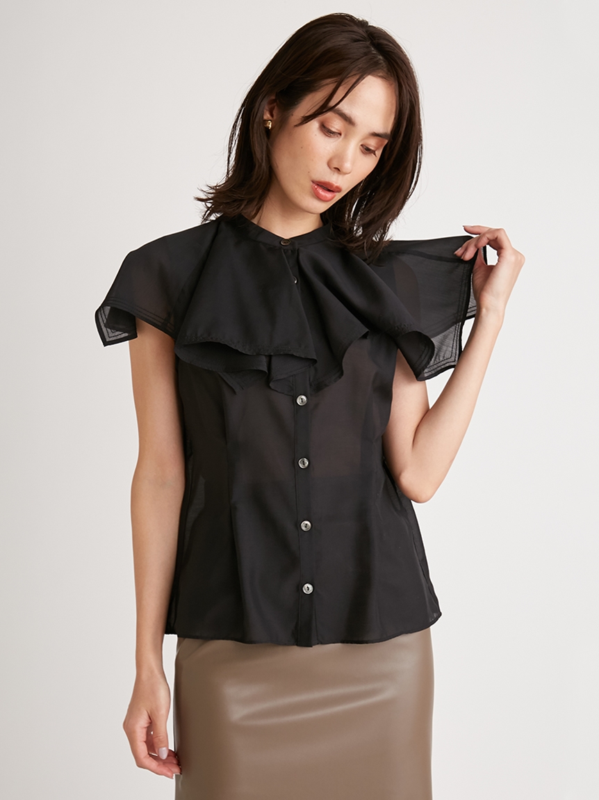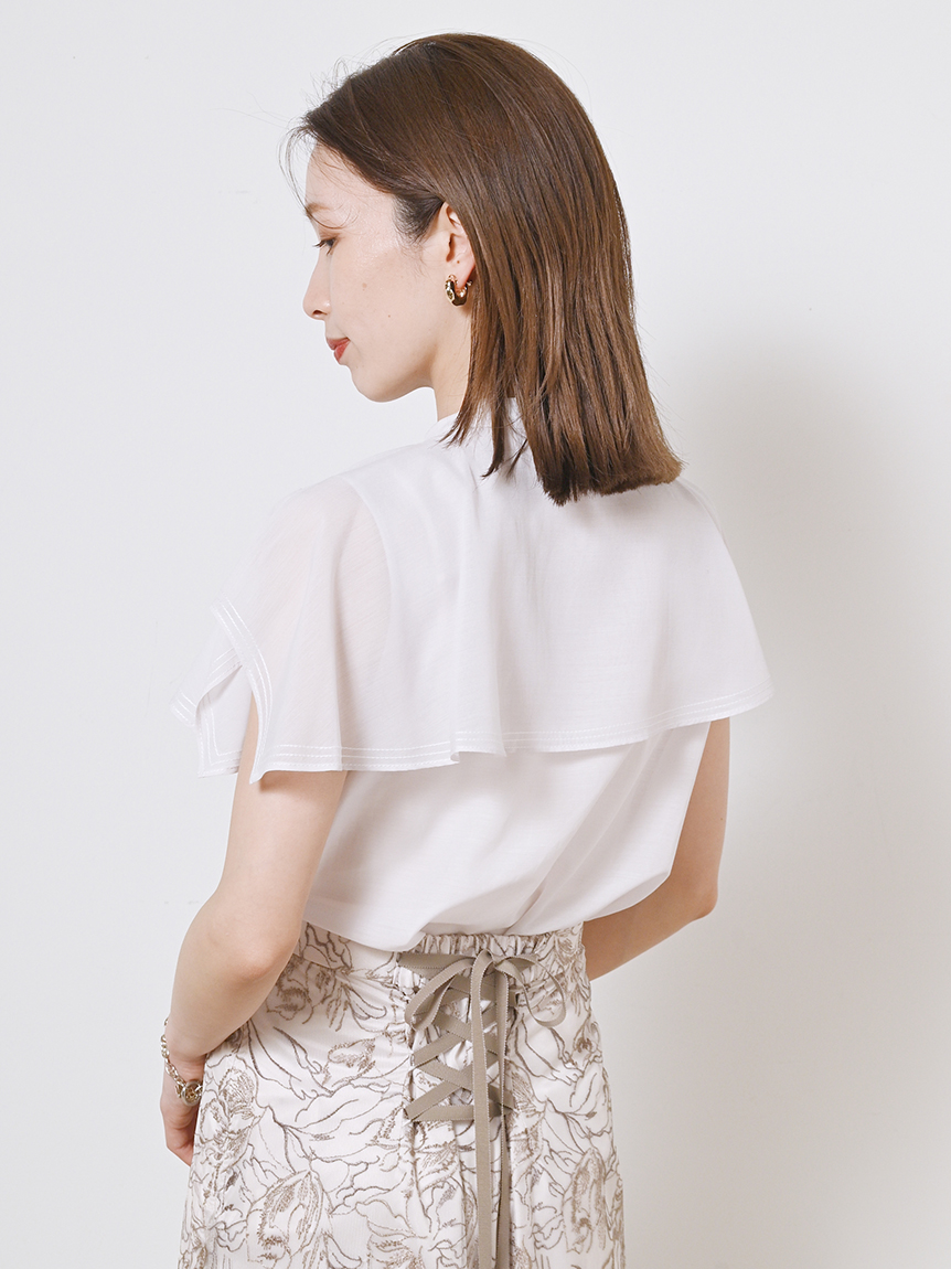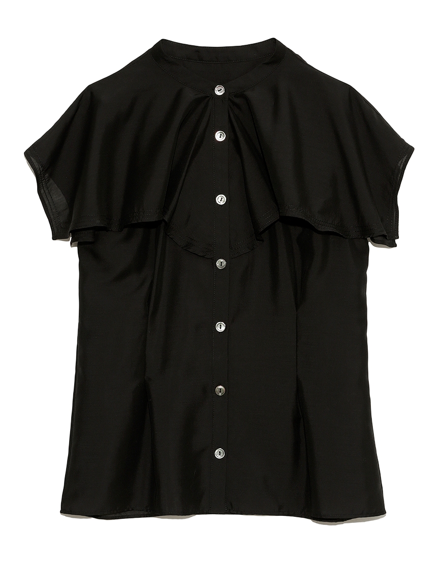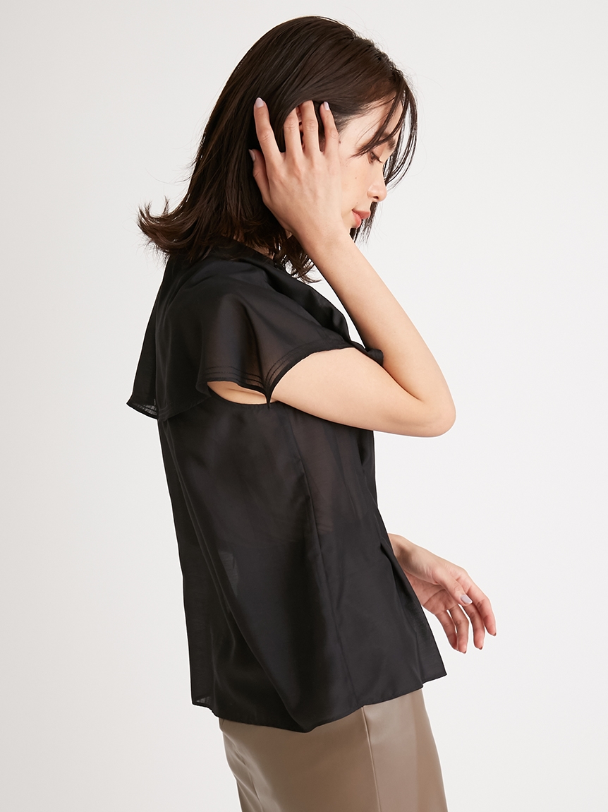 ひらりとエレガントに揺れるスクエアカラーが印象的なブラウス。生地の軽やかさも相まって、プラスワンで春ムードが一気に高まる1枚です。フロントにダーツを入れたコンパクトなシルエットが女性らしさを感じさせる秘訣。ボトムにインしてもアウトでもバランス良く決まり、様々なアイテムと好相性です。