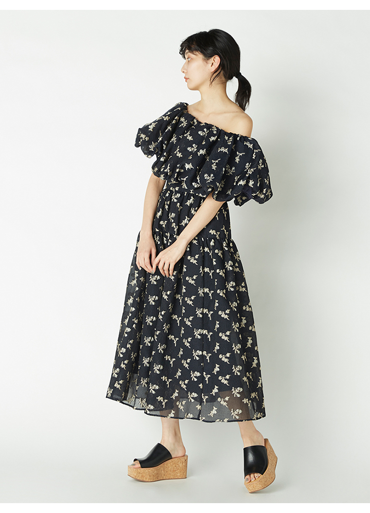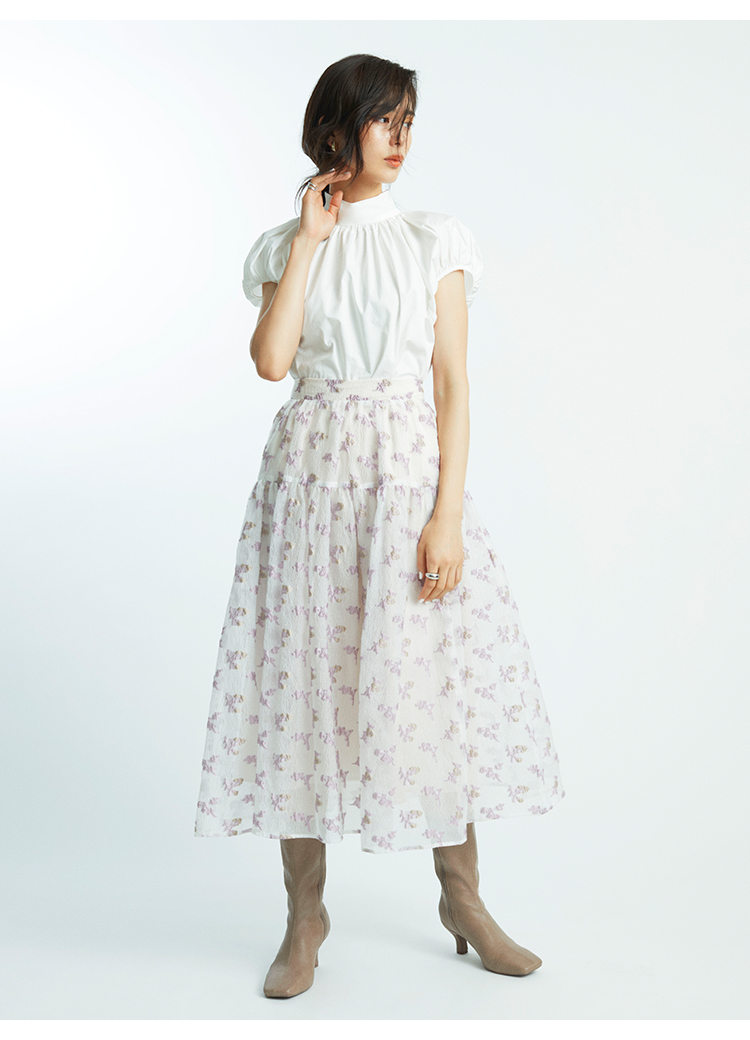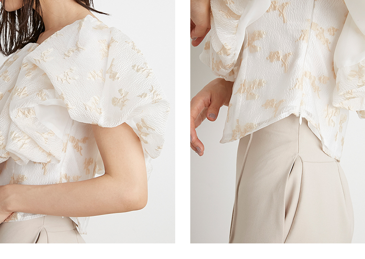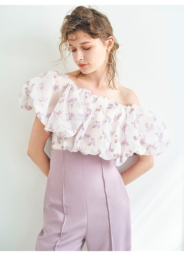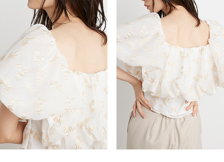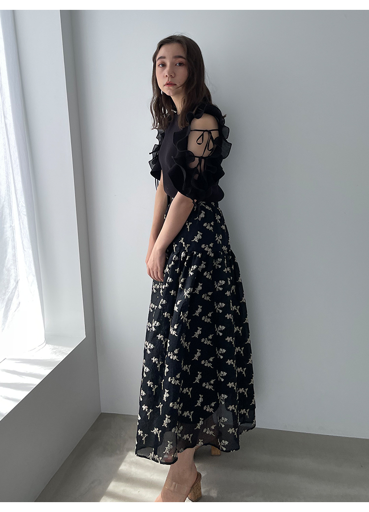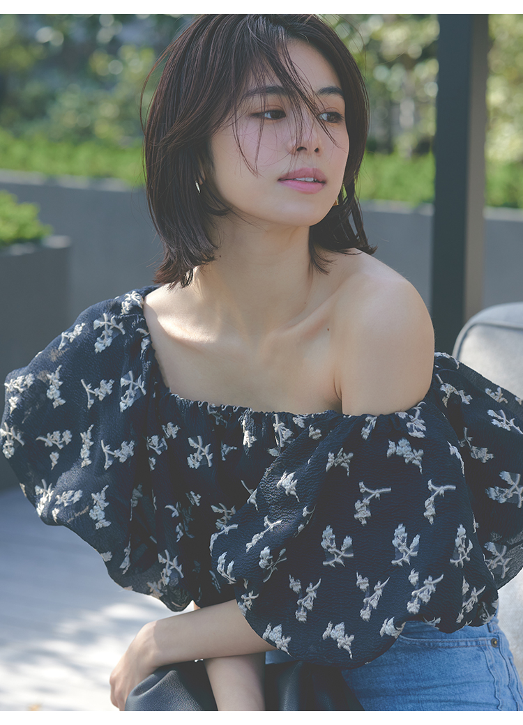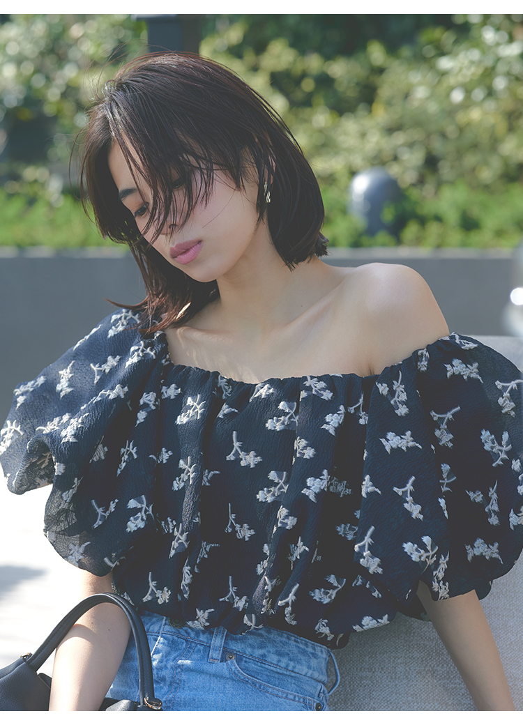 花柄のシアージャガード生地を使用し、たっぷりのギャザーでドラマティックに仕上げたブラウス。女性らしいボリューム感がレディな印象を纏い、ネックラインから肩にかけてリラックス感のあるゴム仕様にしたことで、普通のブラウスとしてだけでなく、大人の肌魅せを叶えるオフショルダーから、片肩だけ落としてでアシメ風にも、様々な雰囲気をお楽しみいただけます。大きく開いたバックスタイルも色香を纏い、カジュアルからフェミニンまでコーディネートの主役を担うアイテム。カーブのかかった裾ラインは、トップスIN/OUTどちらにも万能です。同じ花柄ジャガードで仕立てたスカートとのセットアップなら、ワンピース見えのクラス感あるスタイリングが叶います。