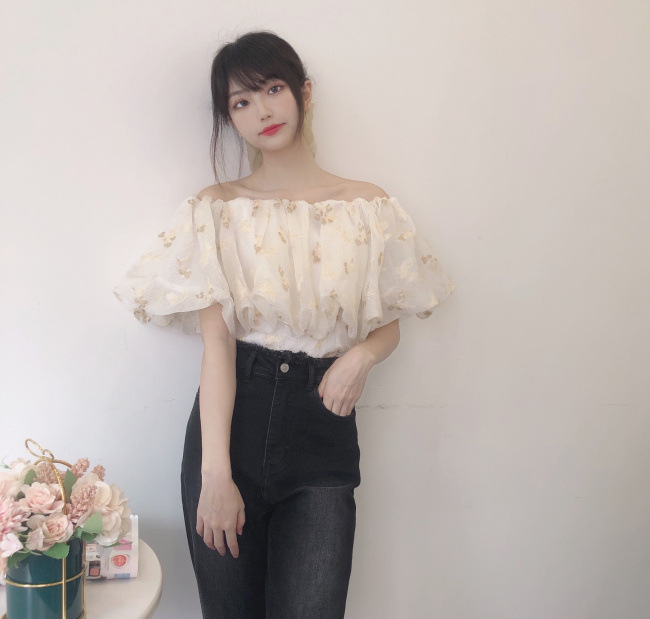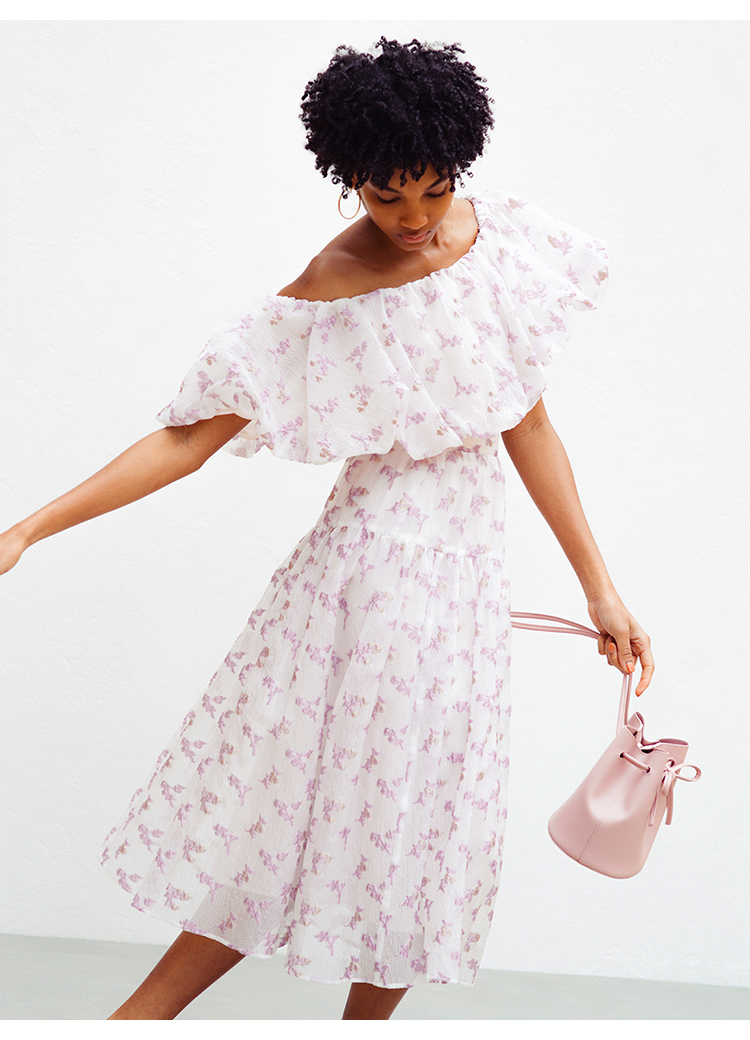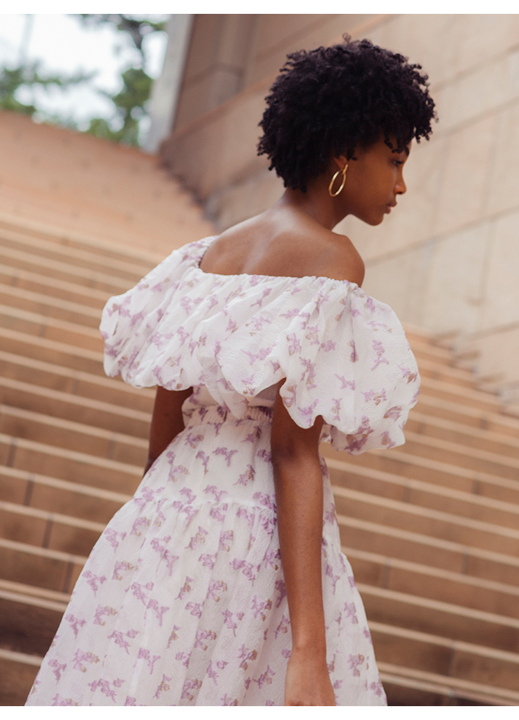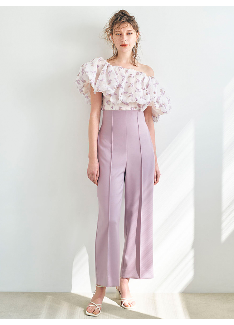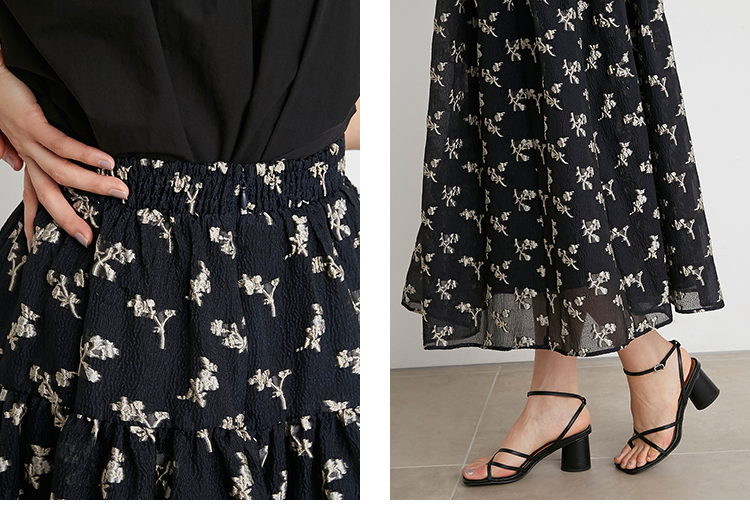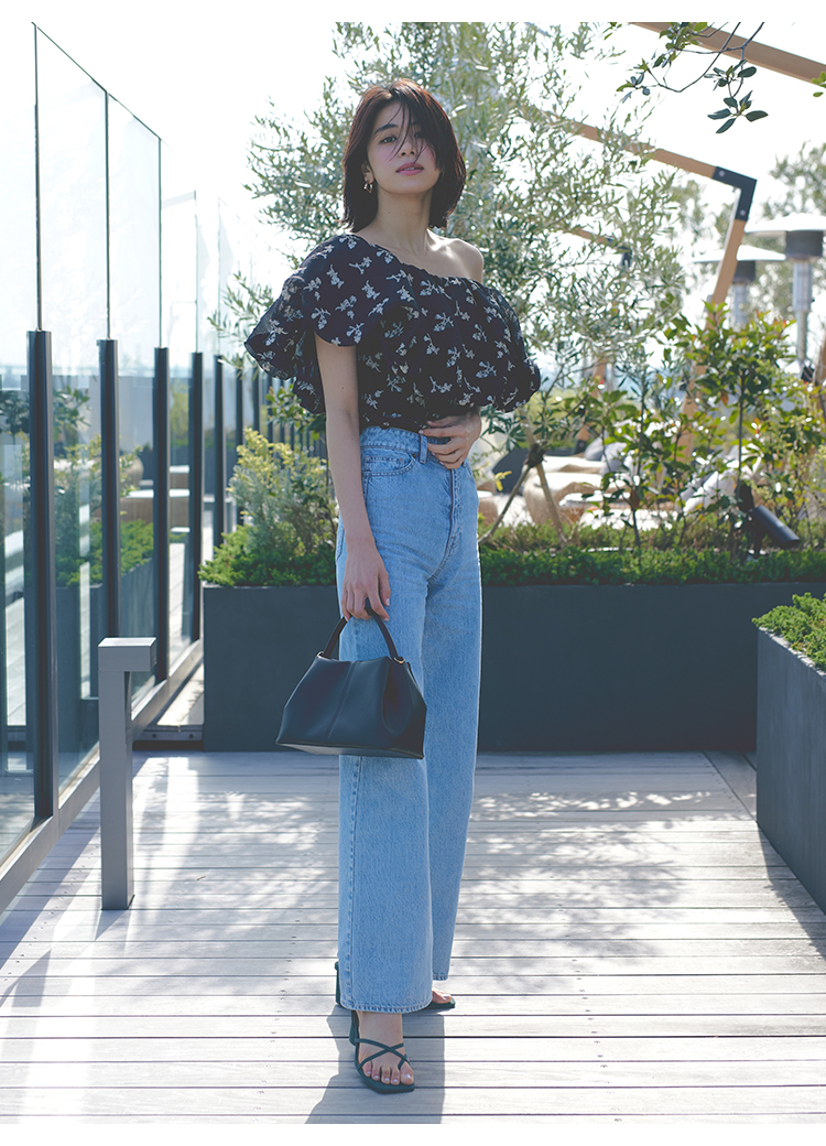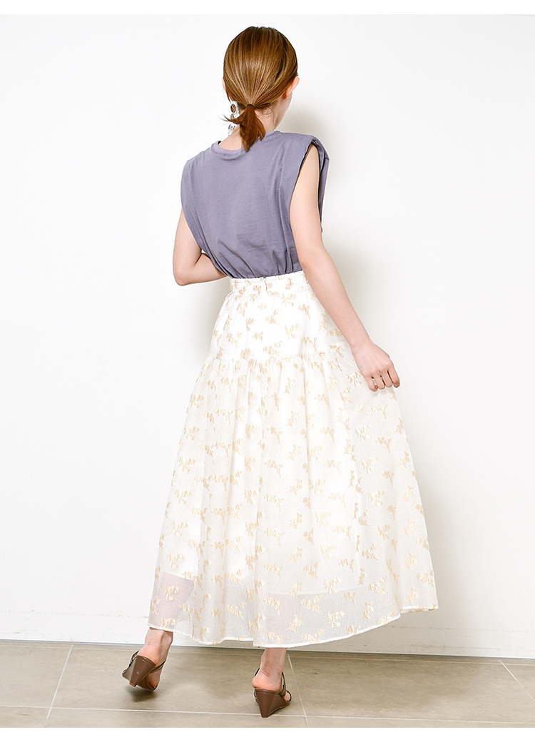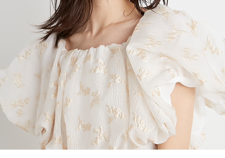 花柄のシアージャガード生地を使用し、たっぷりのギャザーでドラマティックに仕上げたブラウス。女性らしいボリューム感がレディな印象を纏い、ネックラインから肩にかけてリラックス感のあるゴム仕様にしたことで、普通のブラウスとしてだけでなく、大人の肌魅せを叶えるオフショルダーから、片肩だけ落としてでアシメ風にも、様々な雰囲気をお楽しみいただけます。大きく開いたバックスタイルも色香を纏い、カジュアルからフェミニンまでコーディネートの主役を担うアイテム。カーブのかかった裾ラインは、トップスIN/OUTどちらにも万能です。同じ花柄ジャガードで仕立てたスカートとのセットアップなら、ワンピース見えのクラス感あるスタイリングが叶います。