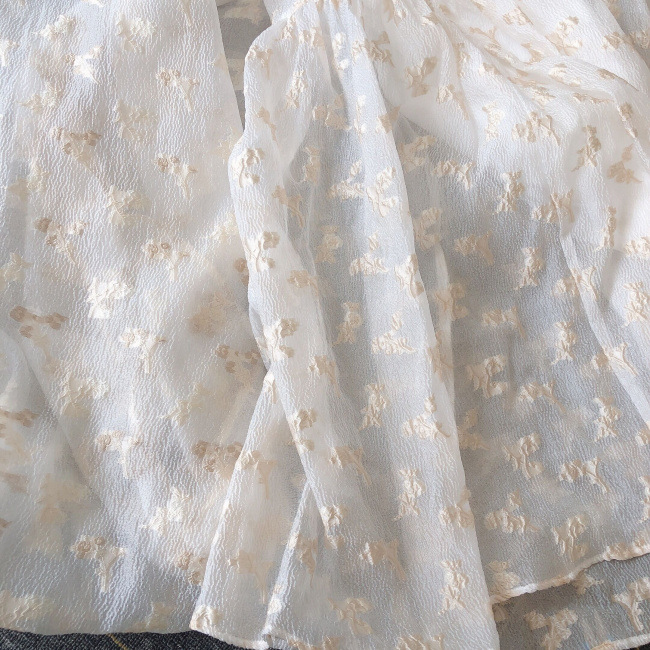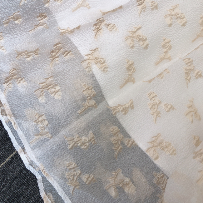 表面感のあるシアーなジャガード生地を使用しました。アイボリー、ラベンダー、ネイビーと、花刺繍の映える美しい3色をご用意しました。