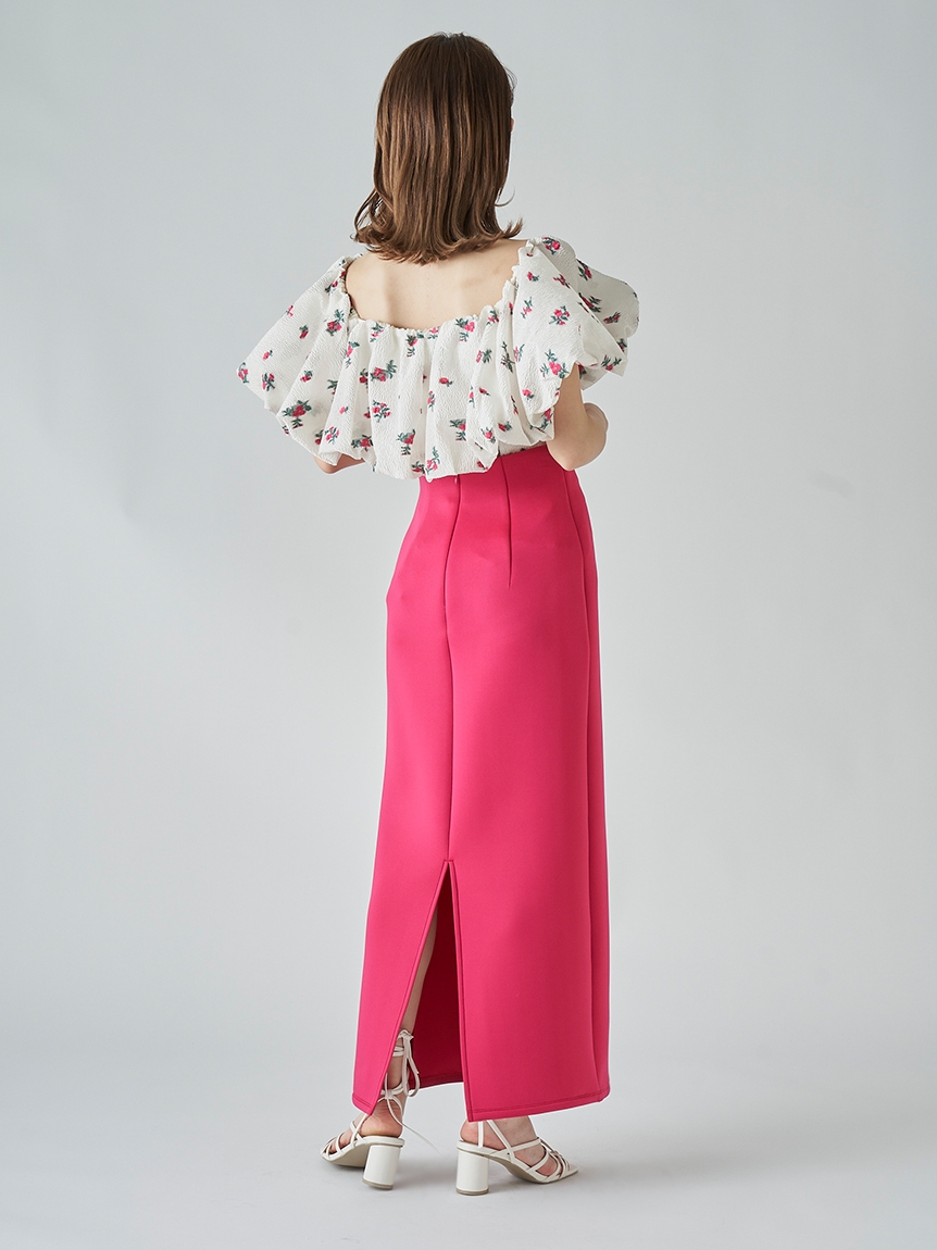 オリジナルのジャカード模様で華やかに仕上げたブラウス。肩まわりにはゴムを入れているので肩に乗せてもオフショルダーとしても着られるアレンジ上手なデザイン。トップにボリュームがあるため身頃部分はパネル切り替えで体に沿うように仕立て、メリハリ感をプラスしています。パンツに合わせてカジュアルMIXに、スカートに合わせて華やかにと様々なコーディネートが楽しめる万能な1着です。