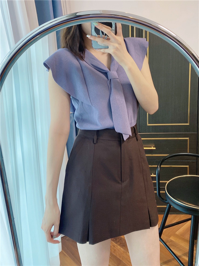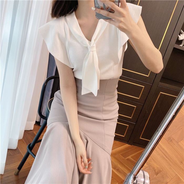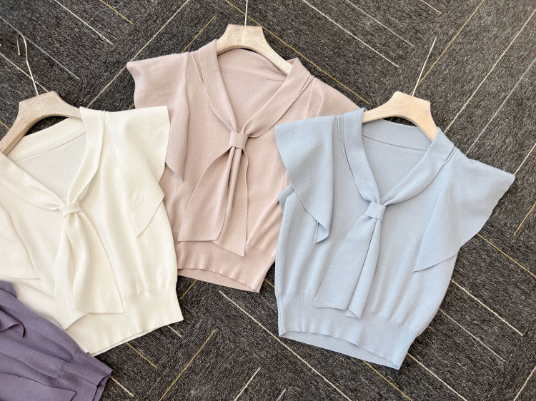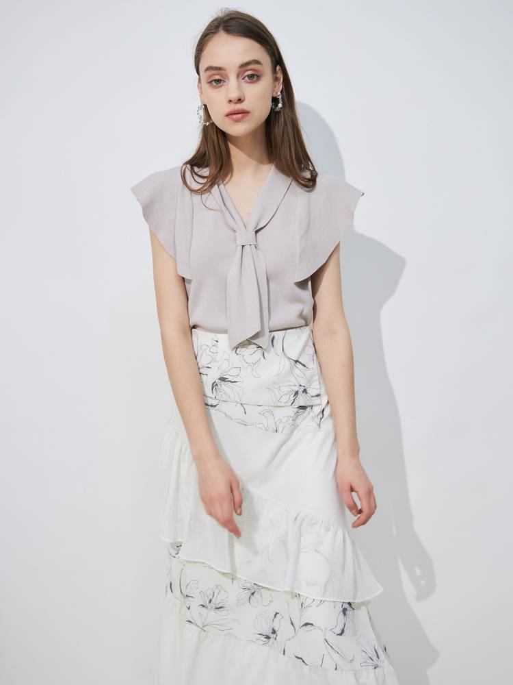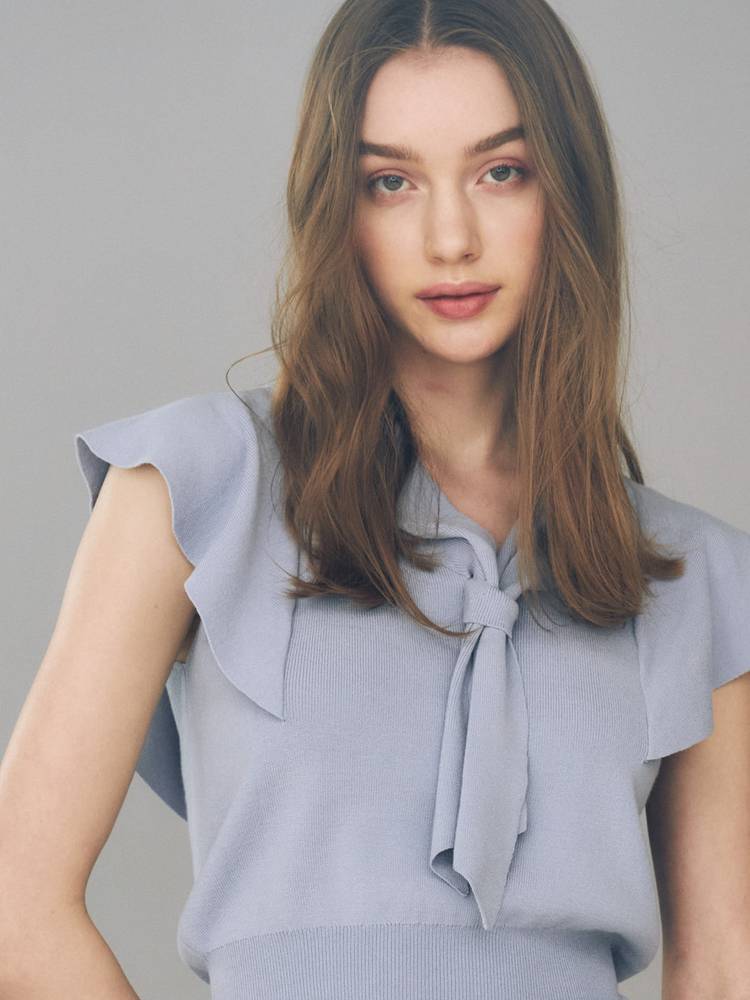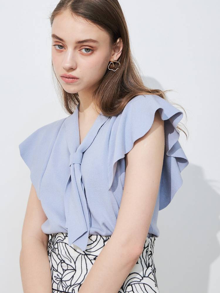 ラッフルデザインにすっきりとしたボウタイをデザインしたコンパクトニット。