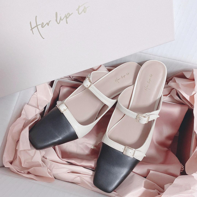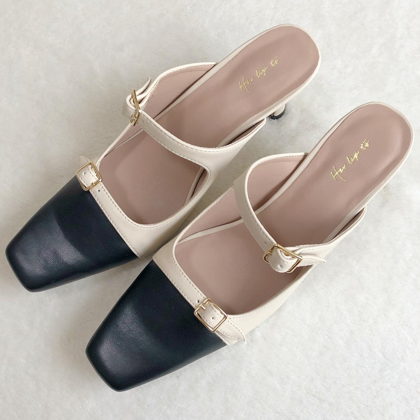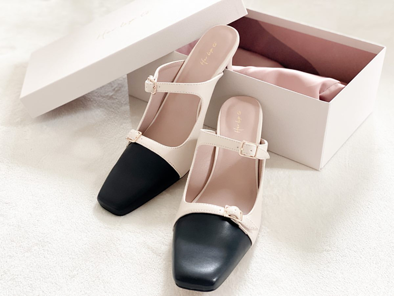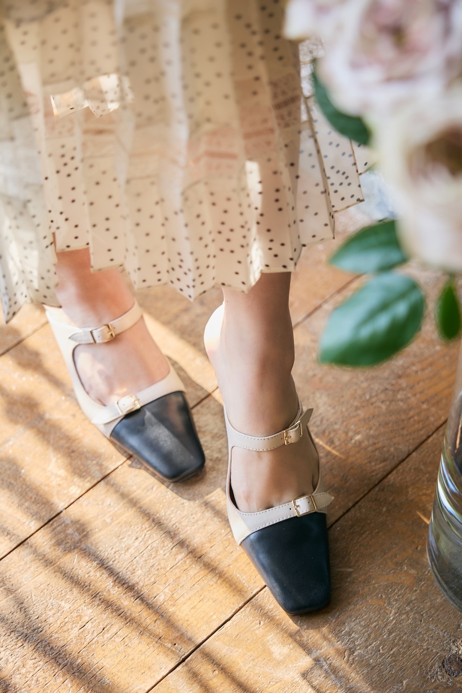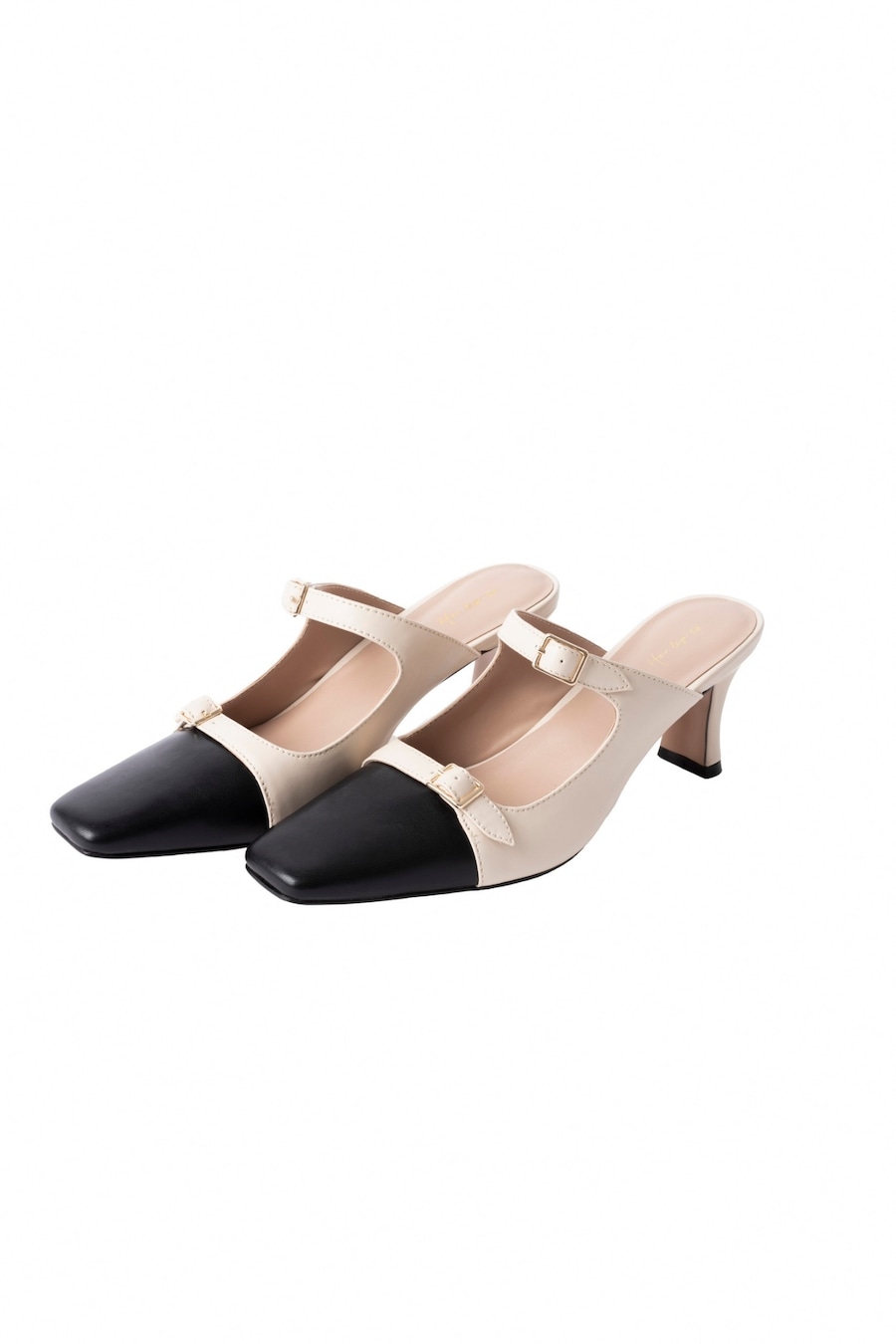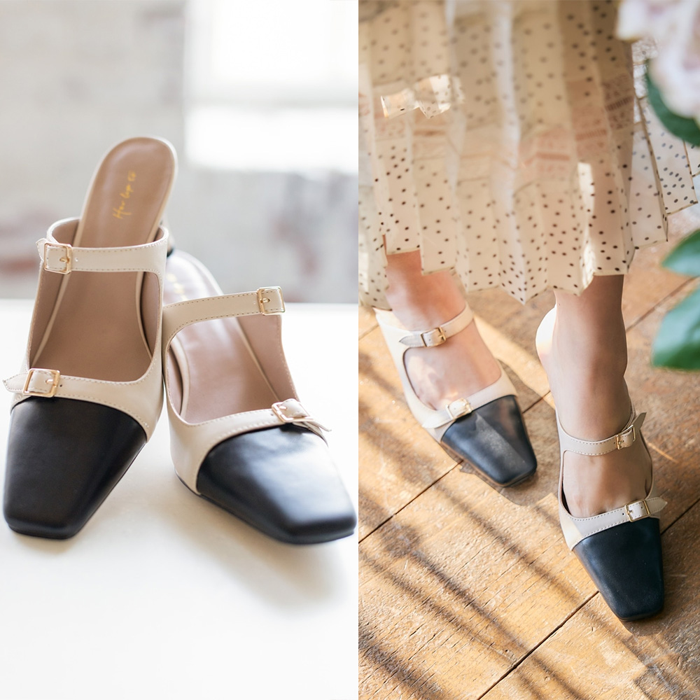 クラシカルなスクエアポインテッドトゥをバイカラーで仕上げたエレガントなミュール。