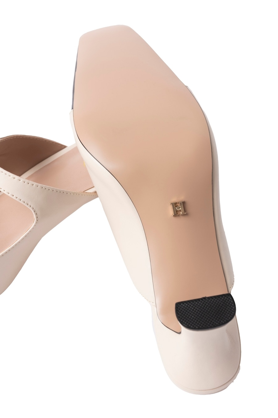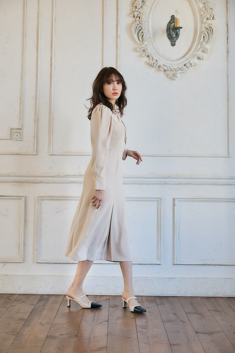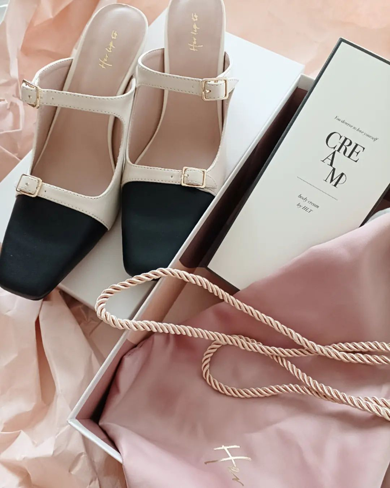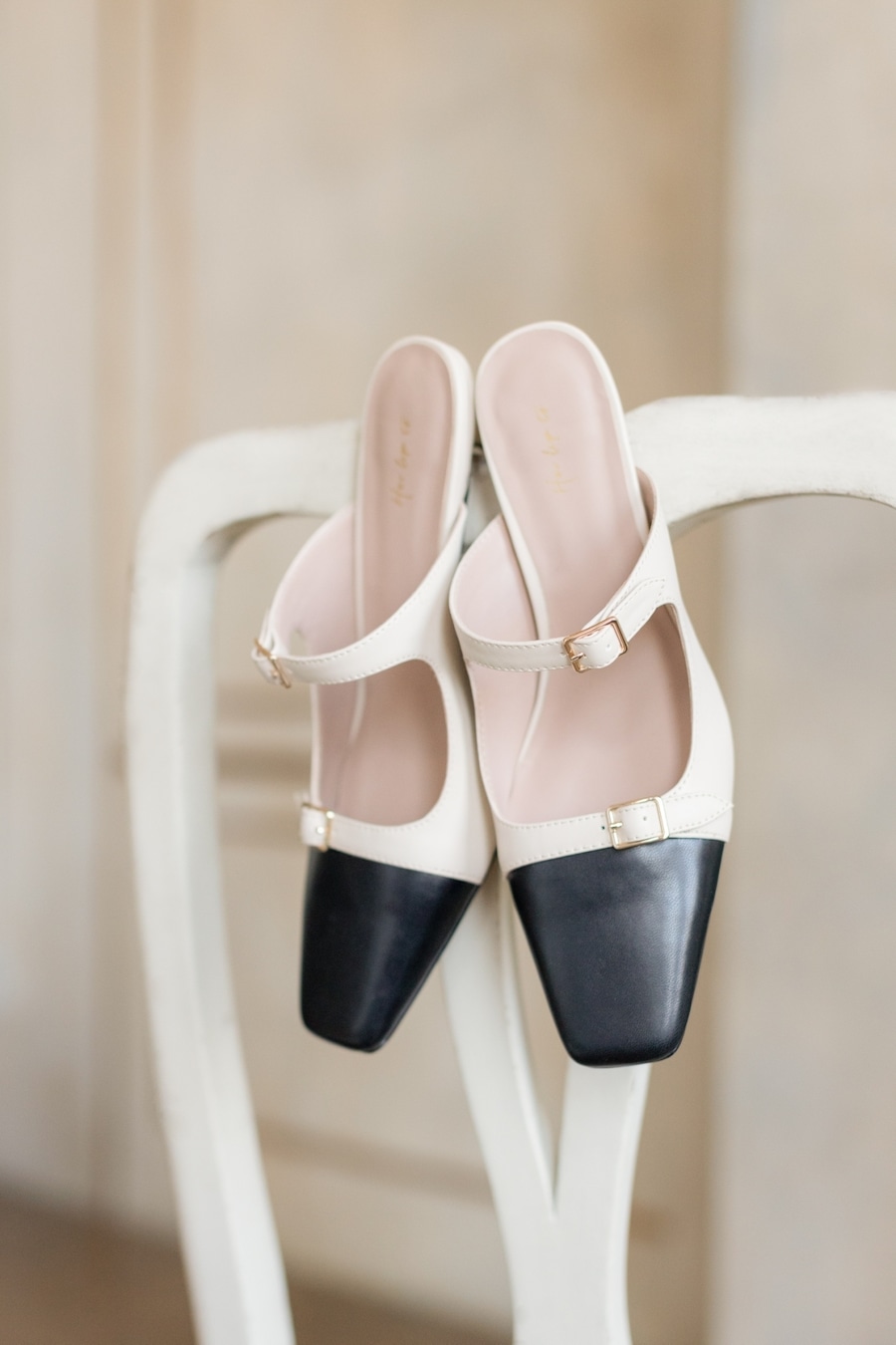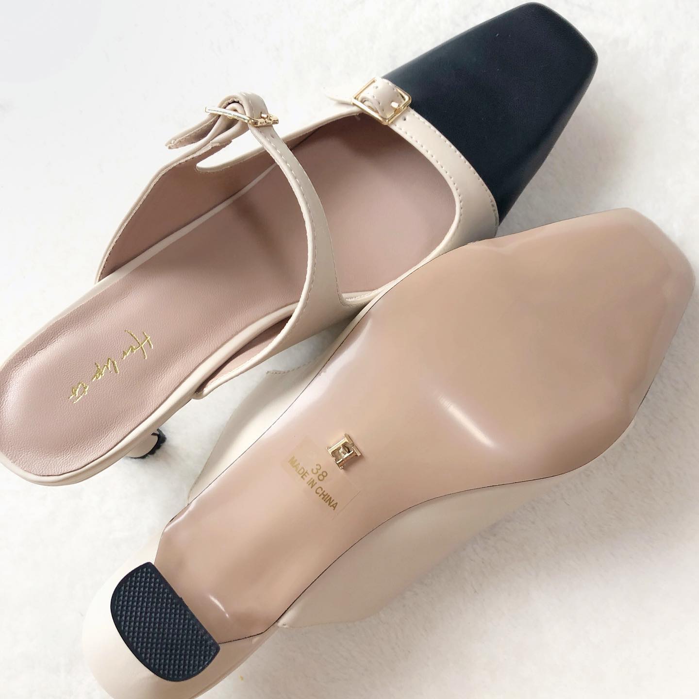 クラシカルなスクエアポインテッドトゥをバイカラーで仕上げたエレガントなミュール。