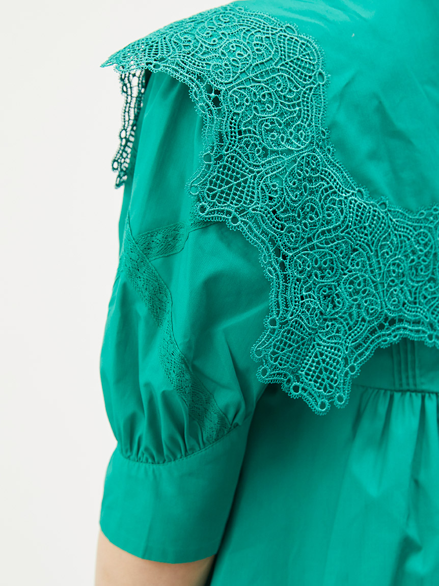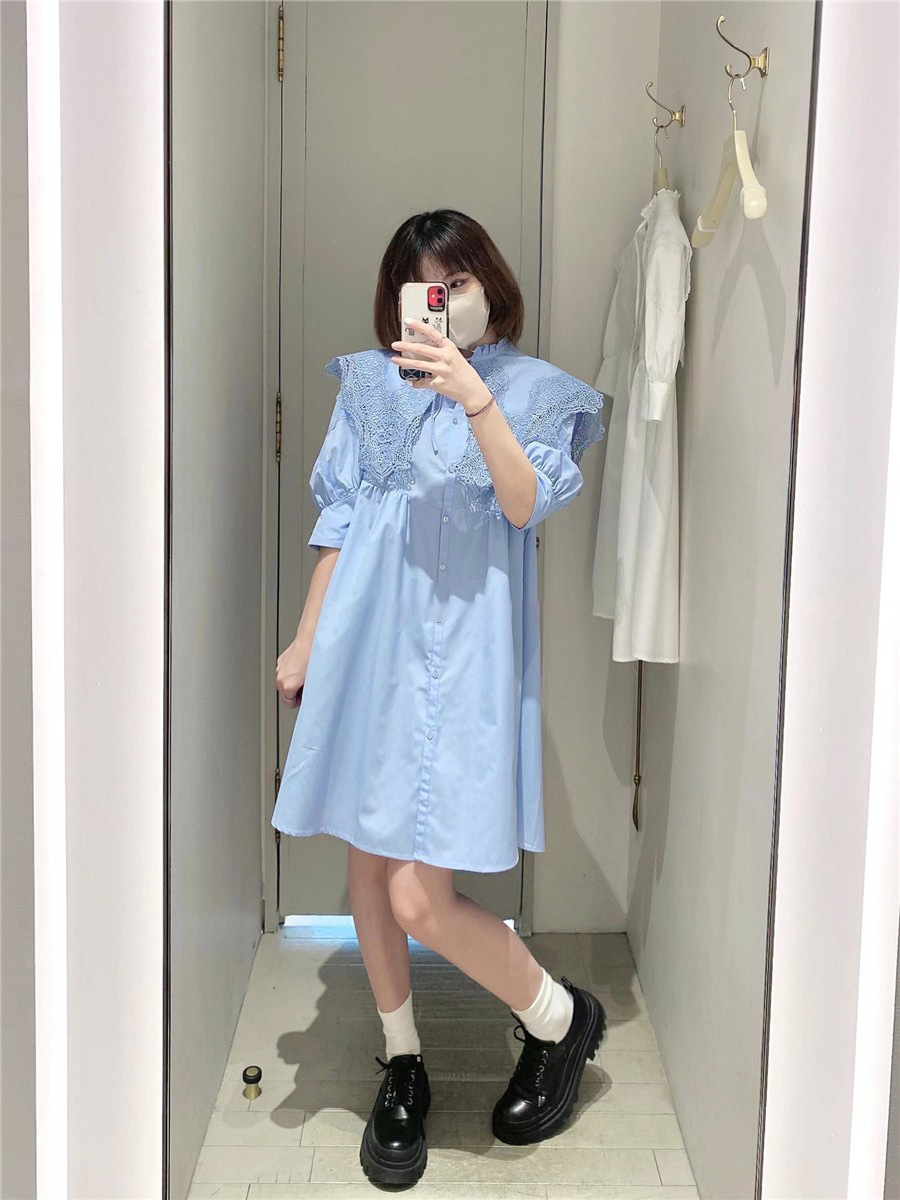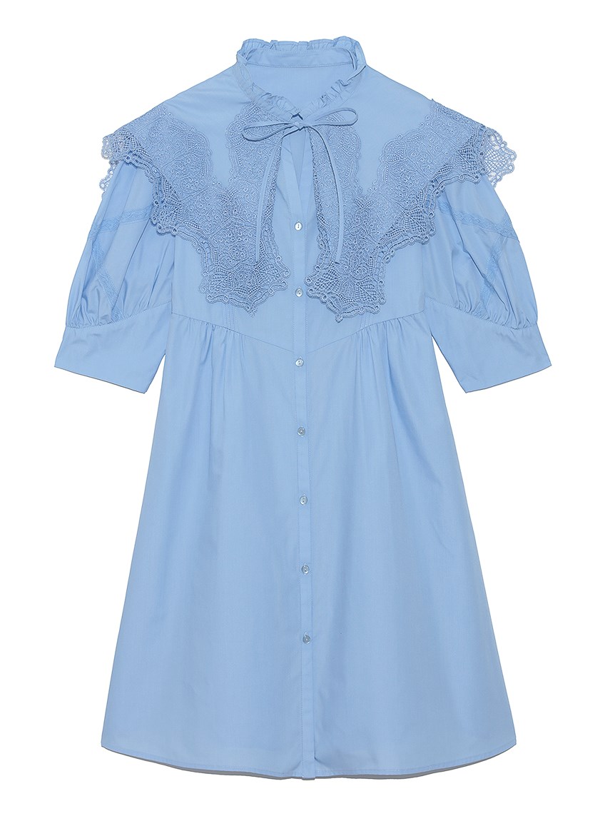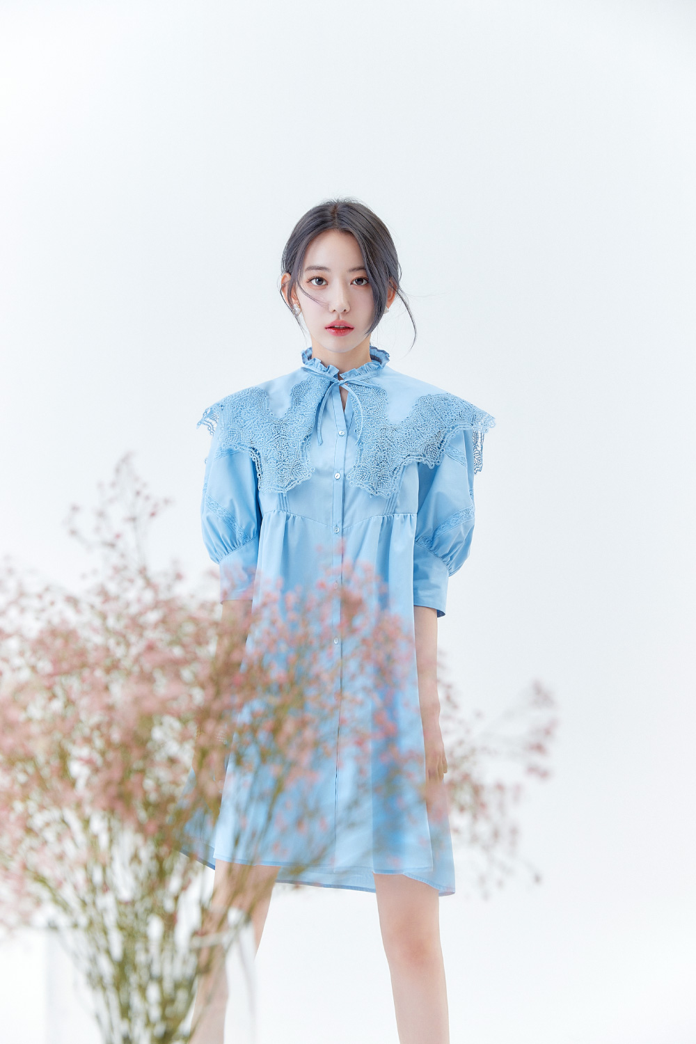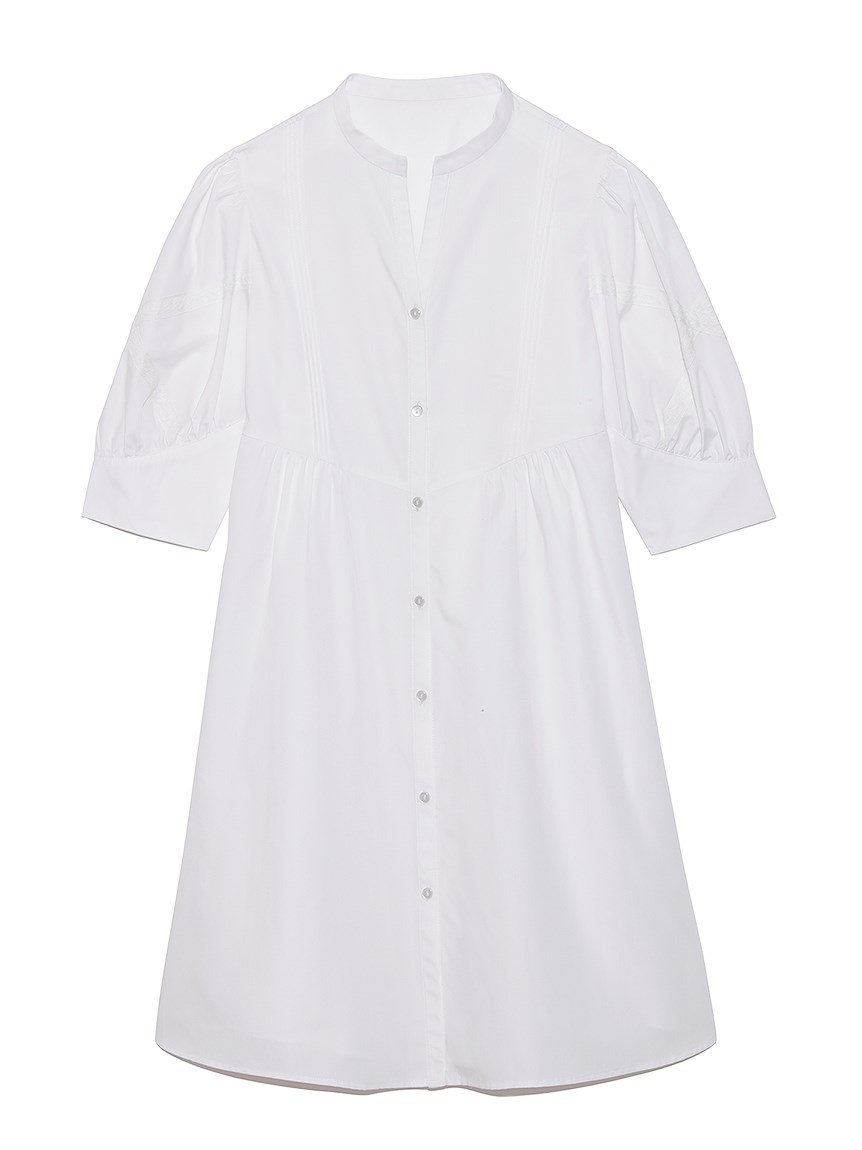 襟つきのレイヤードデザインが特徴的な、クラシカルでトレンド感が香るシャツワンピース。襟を外しても、袖にあしらわれたテープレースや切り替えなど抜かりのないディティールで単体としても着用していただきやすいデザインに仕上げました。袖の程よいパフ感と裾にかけて広がるフレアシルエットで春らしい着こなしが楽しめるアイテムです。