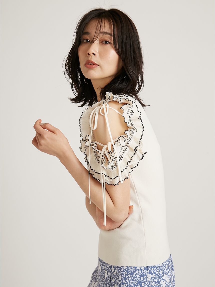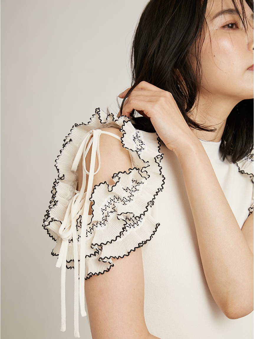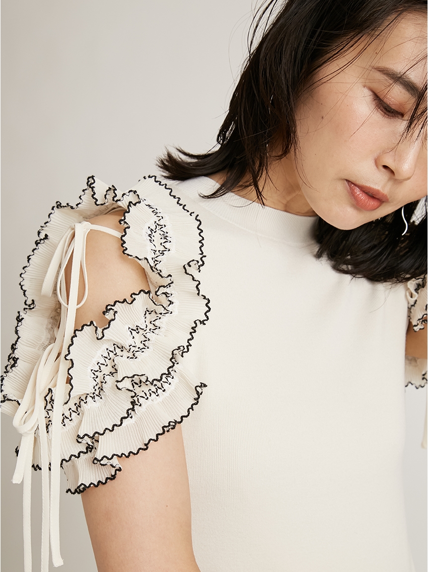 人気のダブルフリルニットプルオーバーがアップデートして登場。シャーリングにステッチを施し、色を配色にすることでトレンドライクに仕上げました。ダブルリボンは前シーズンのデザインをそのままに二の腕部分に落とし込み、愛らしさと華奢見えを演出しています。フィット感のあるタイトシルエットなので合わせるボトムを選ばず、着まわし力も抜群です。