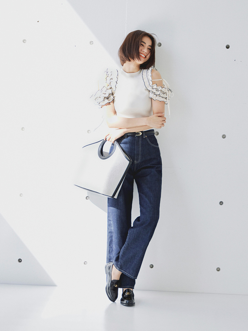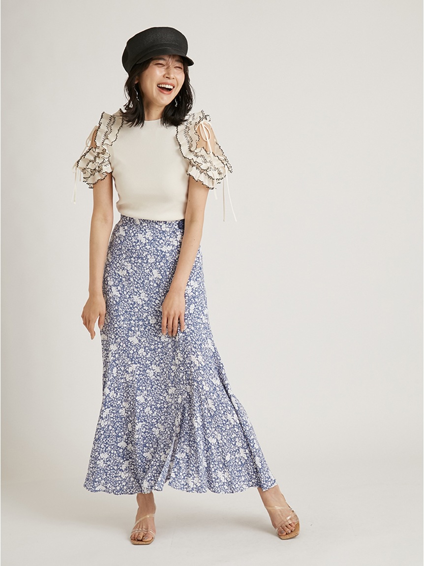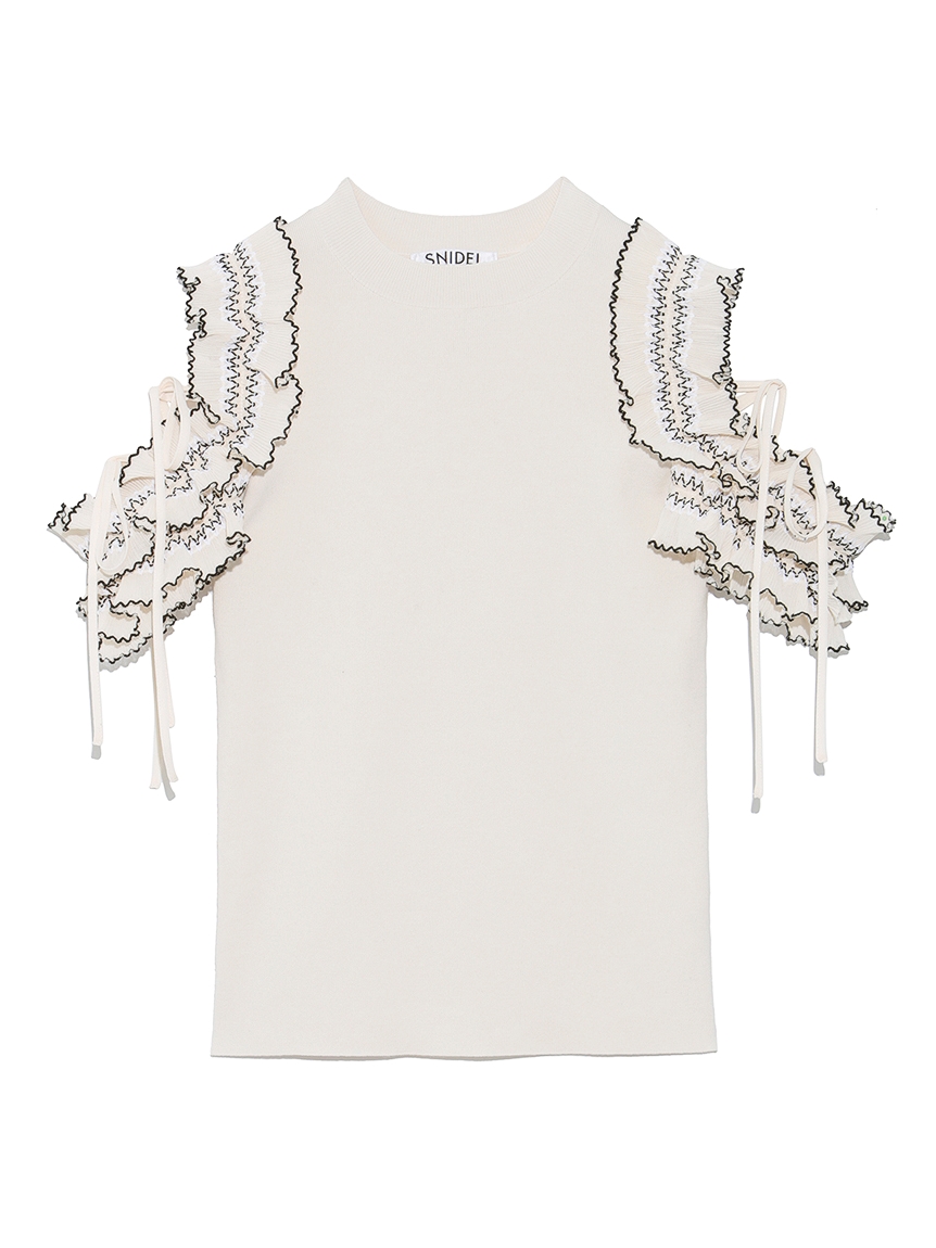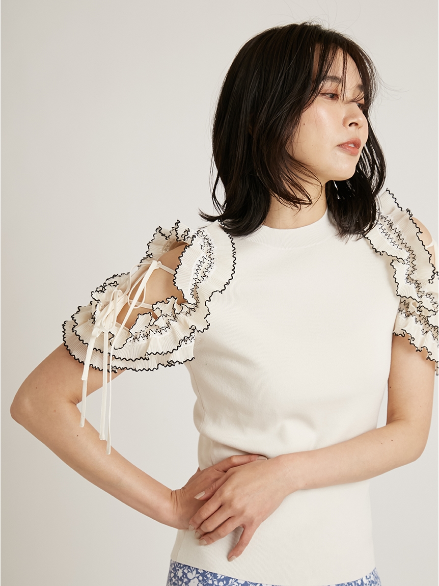 人気のダブルフリルニットプルオーバーがアップデートして登場。シャーリングにステッチを施し、色を配色にすることでトレンドライクに仕上げました。ダブルリボンは前シーズンのデザインをそのままに二の腕部分に落とし込み、愛らしさと華奢見えを演出しています。フィット感のあるタイトシルエットなので合わせるボトムを選ばず、着まわし力も抜群です。