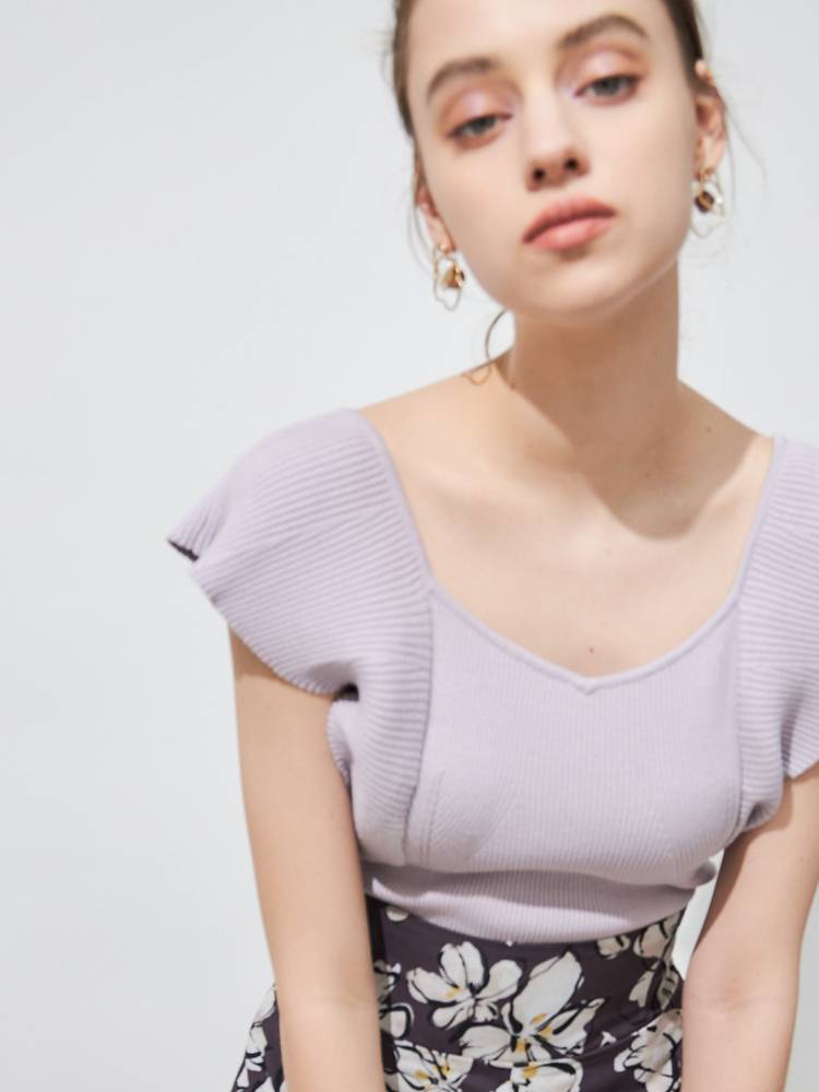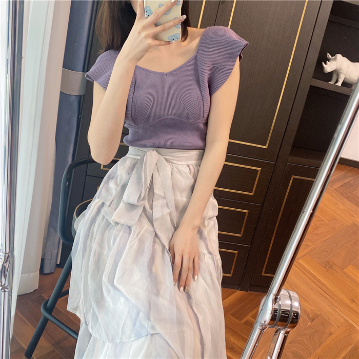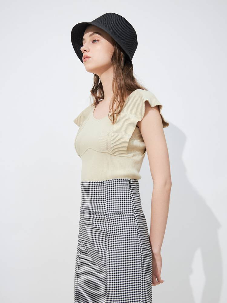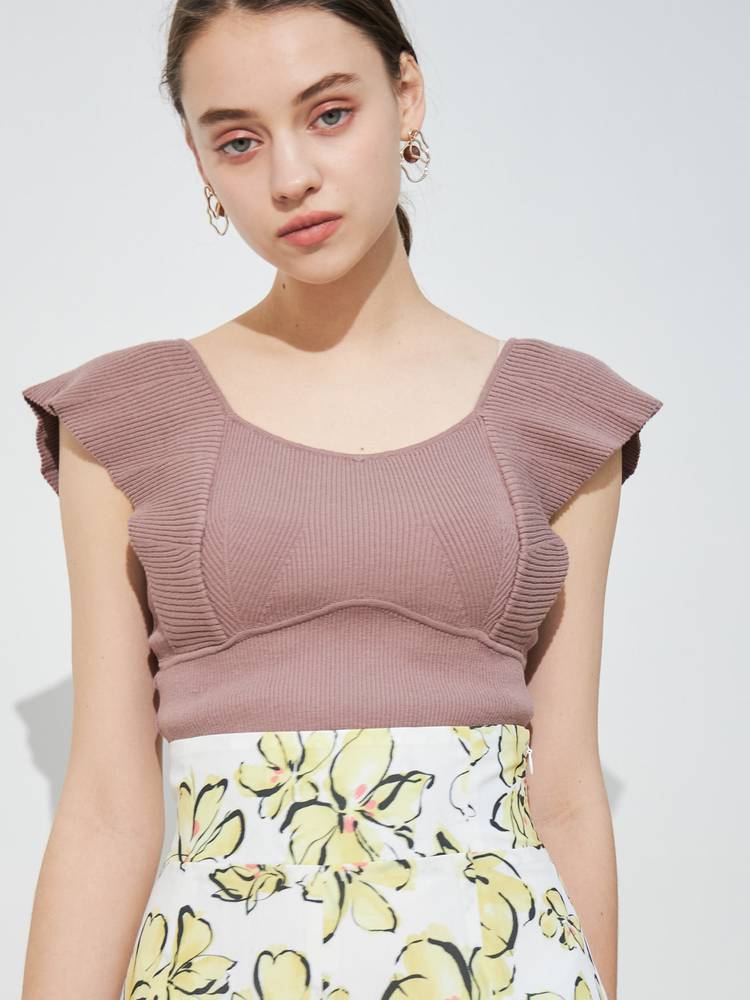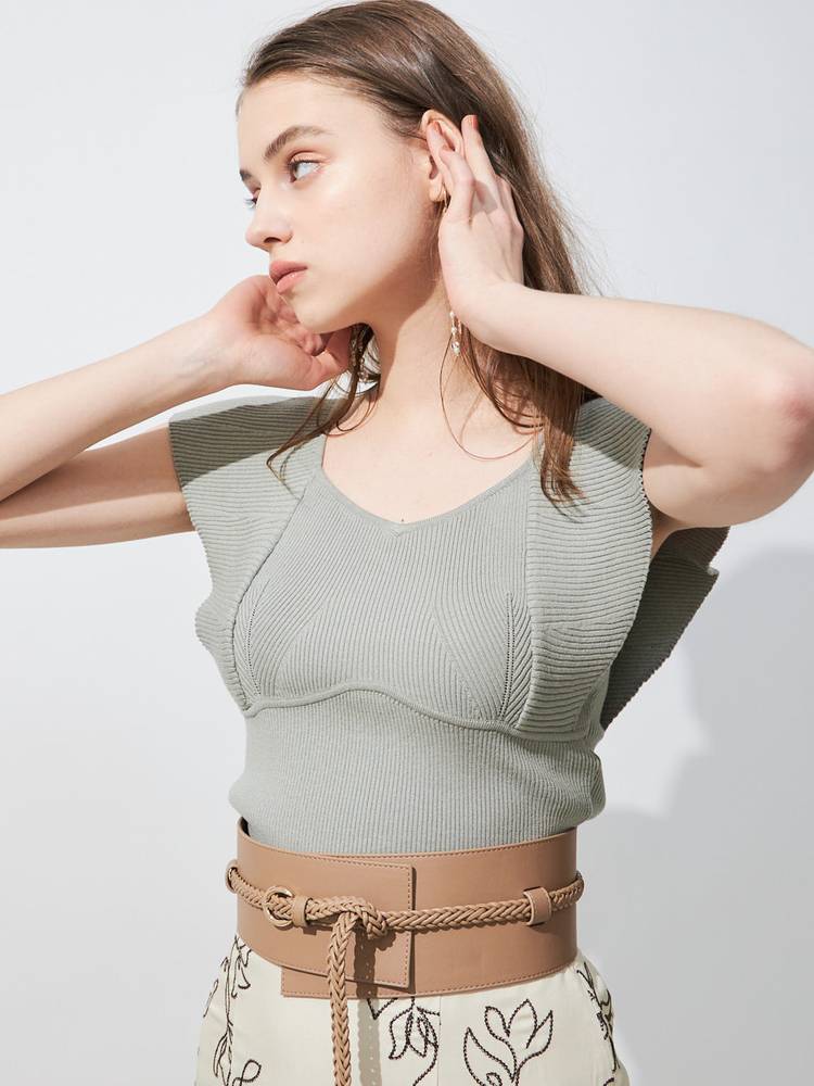 短丈でボトム合わせを迷わないサイジングはそのままに、ビスチェ風な編み柄がデザインポイントです。
