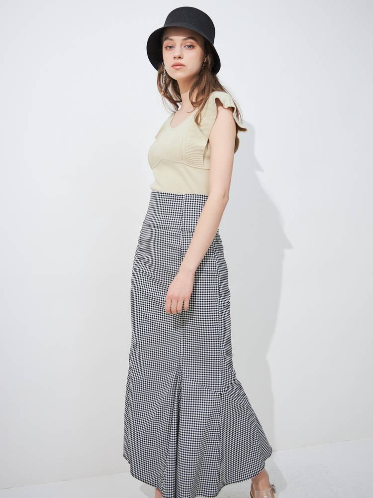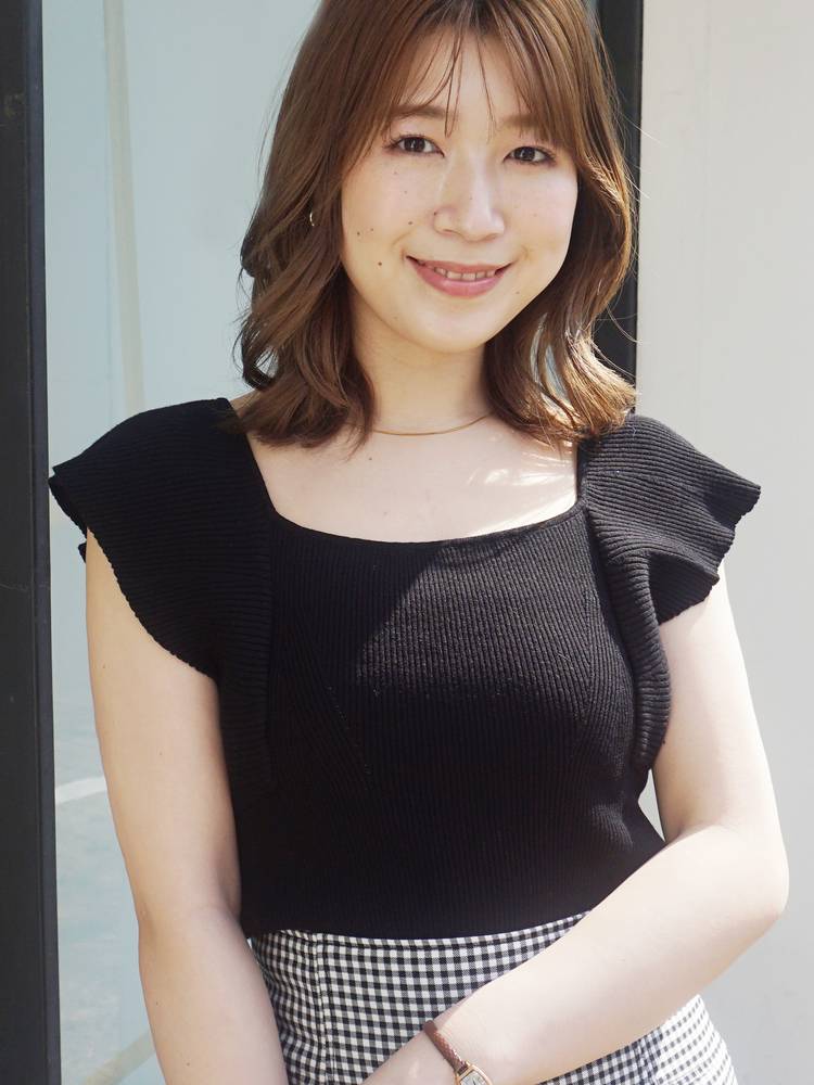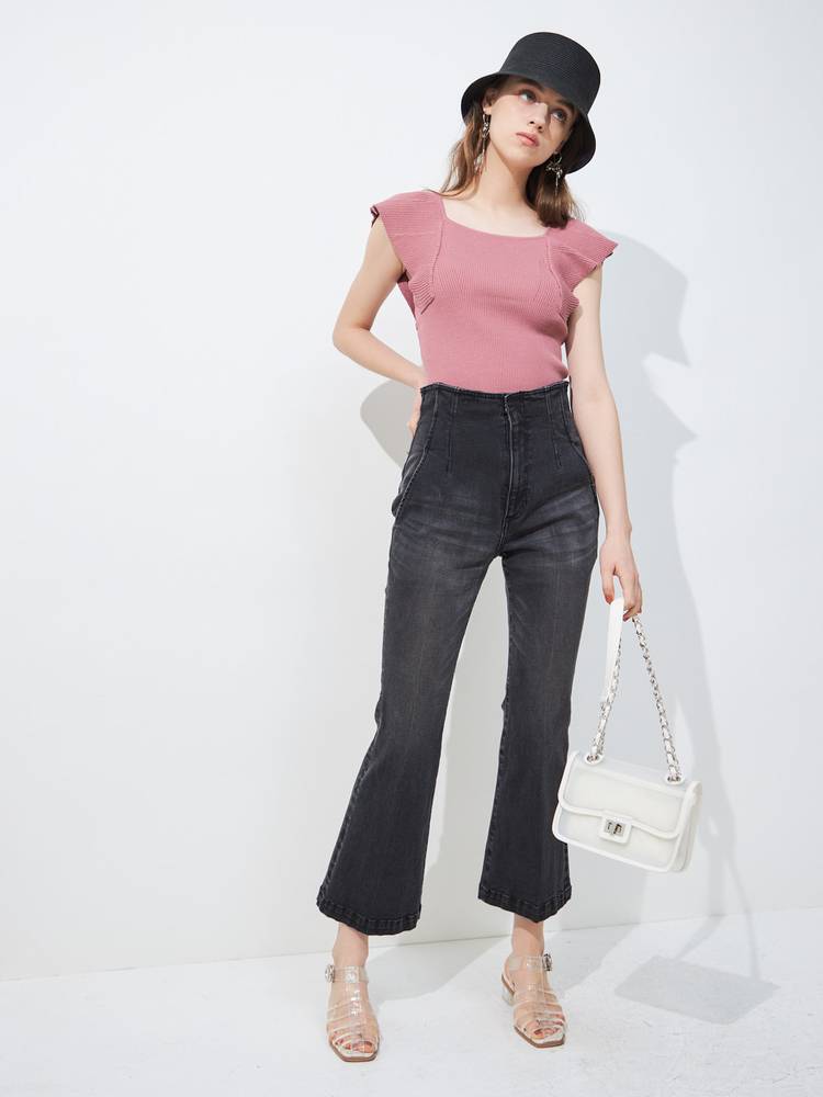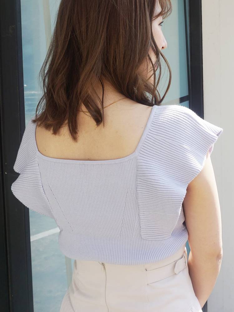 シンプルなスクエアネックをフロントで着ればスタイリングの幅が広がります!