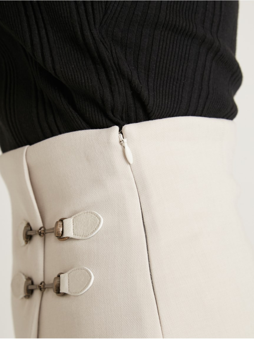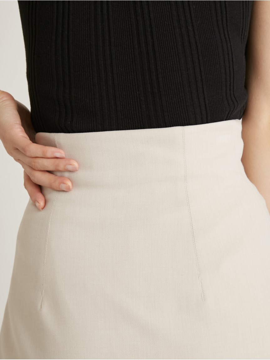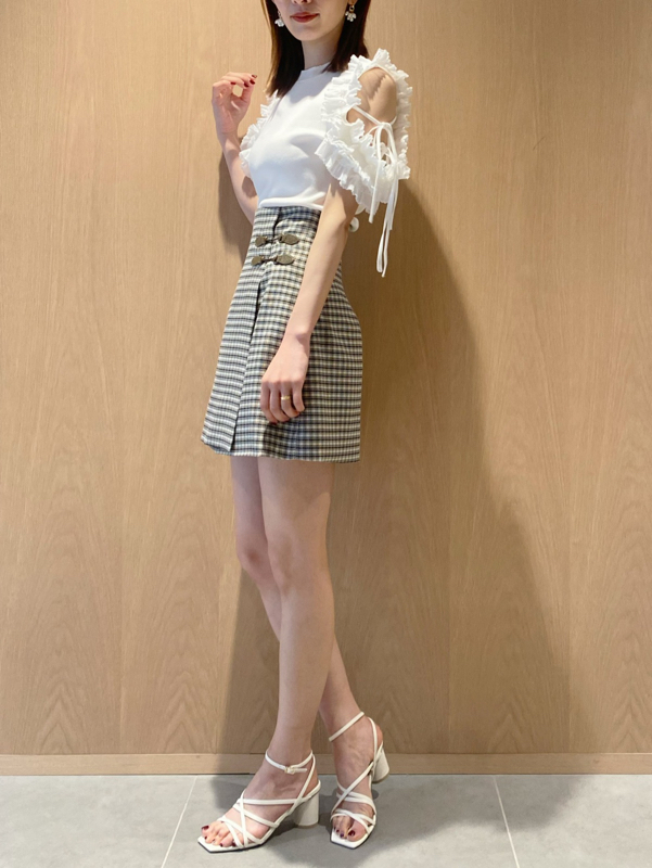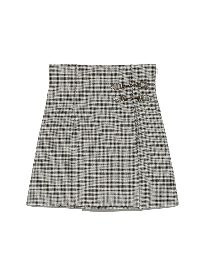 サイドにあしらわれたビットが特徴的な、クラシカルなデザインのスカショーパン。ラップスカートの中にショートパンツをドッキングし、ミニ丈でも気にせず履けるデザインです。タイトな腰回りから裾に向かってゆるやかに広がる女性らしいシルエット。トレンド感のあるハイウエストデザインは、スタイルアップ効果も絶大です。様々なトップスと合わせやすく、幅広いコーディネートに活躍してくれます。