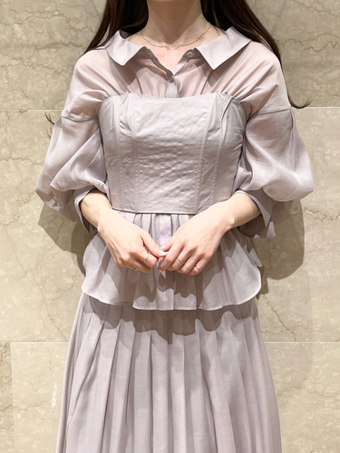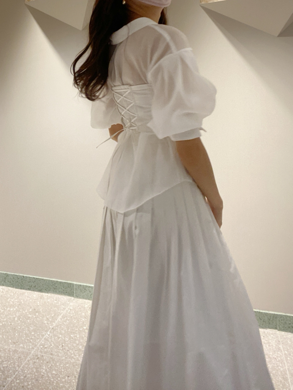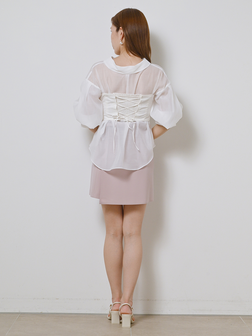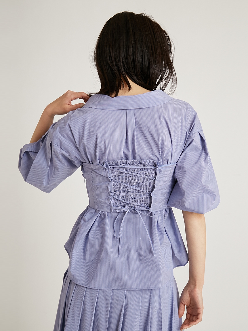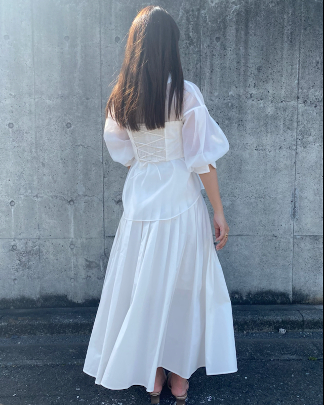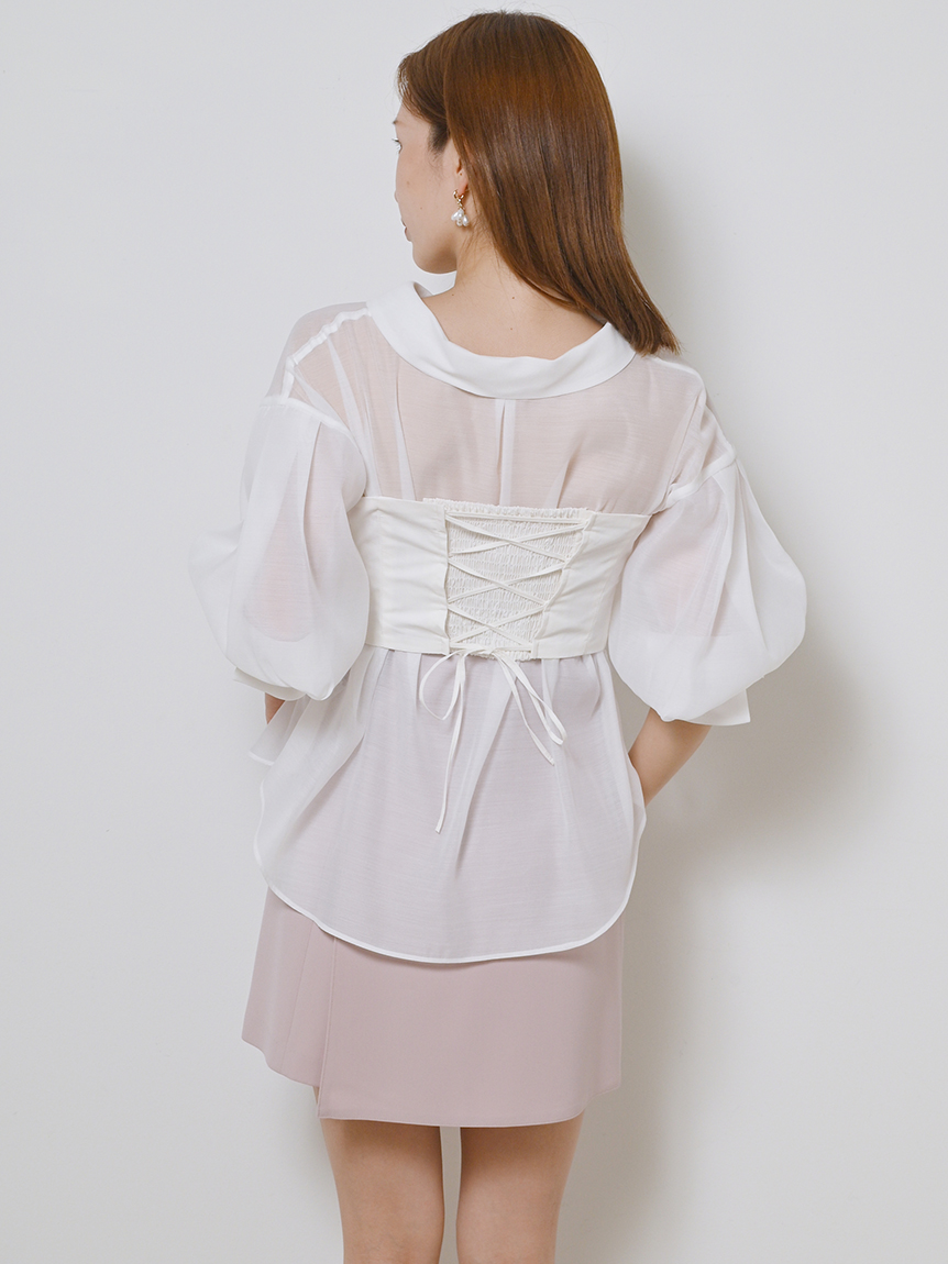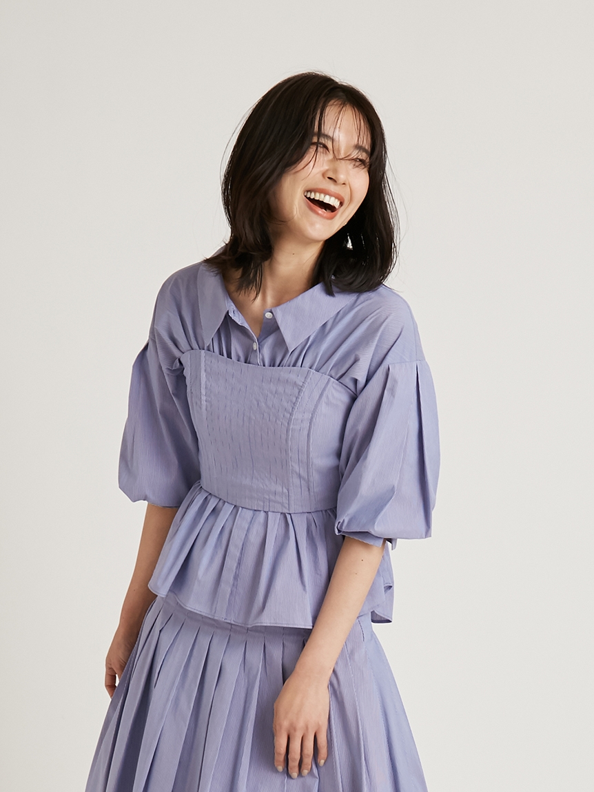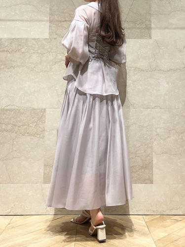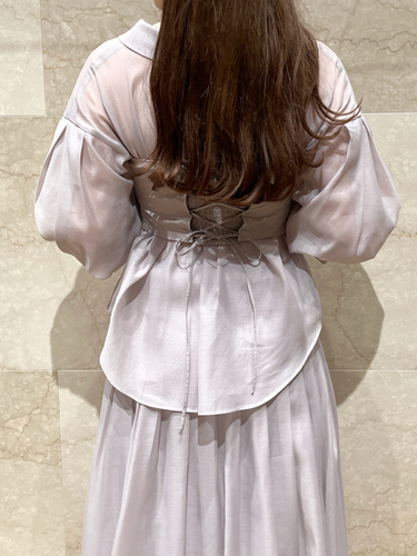 まるでコルセットをレイヤードしているかのようなドッキングデザインのブラウス。ふんわりと丸みのあるボリュームスリーブが愛らしさを高めるポイント。背中部分にはレースアップデザインを落とし込み、後ろ姿までフェミニンに仕上げています。裾部分に広がりのあるシルエットなので気になるボディラインがカバーできるのも嬉しい。同素材を使用したスカート(SWFS222095)とセットアップで着用いただけます。