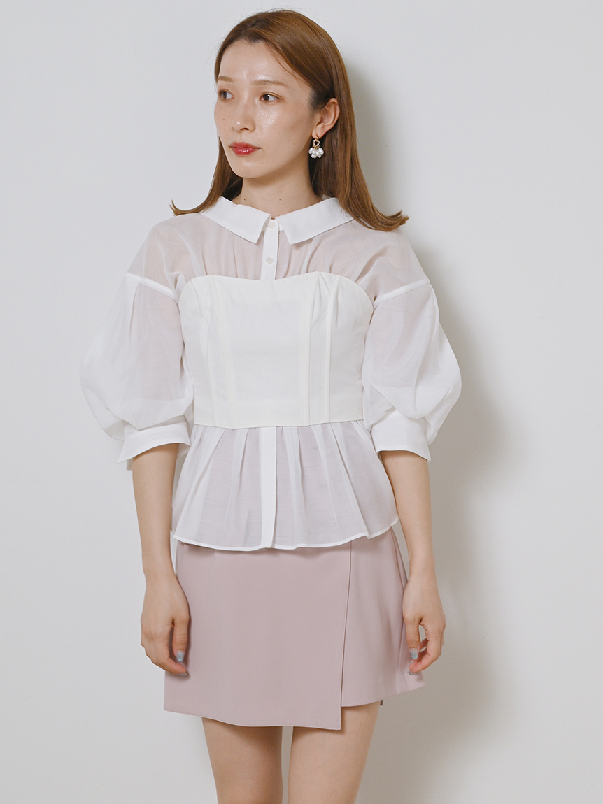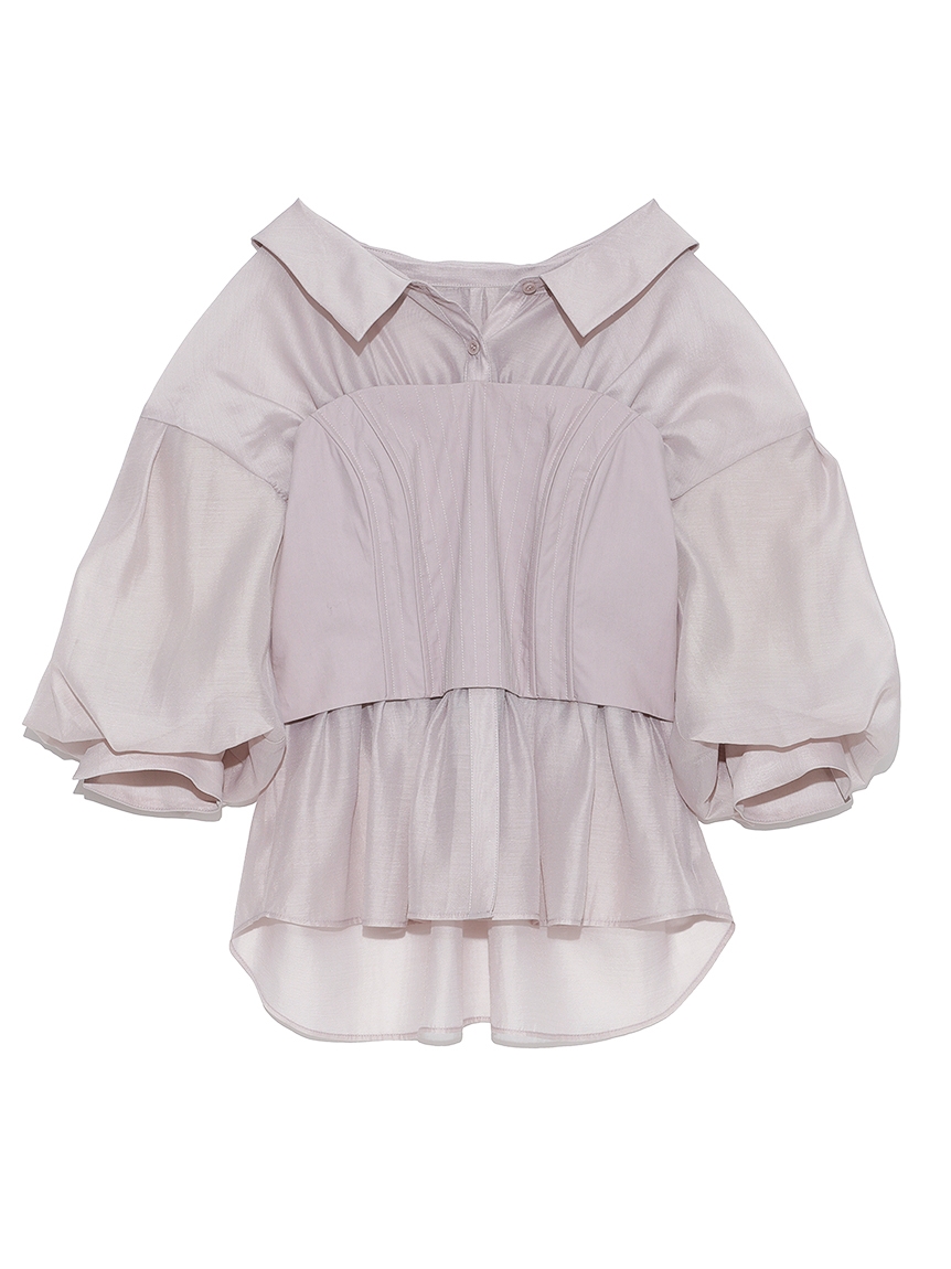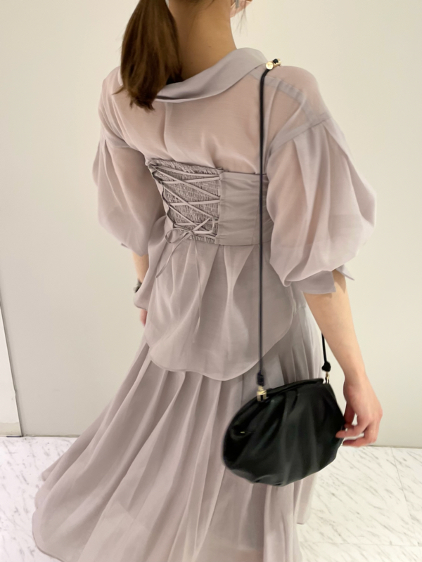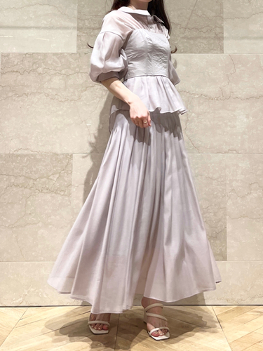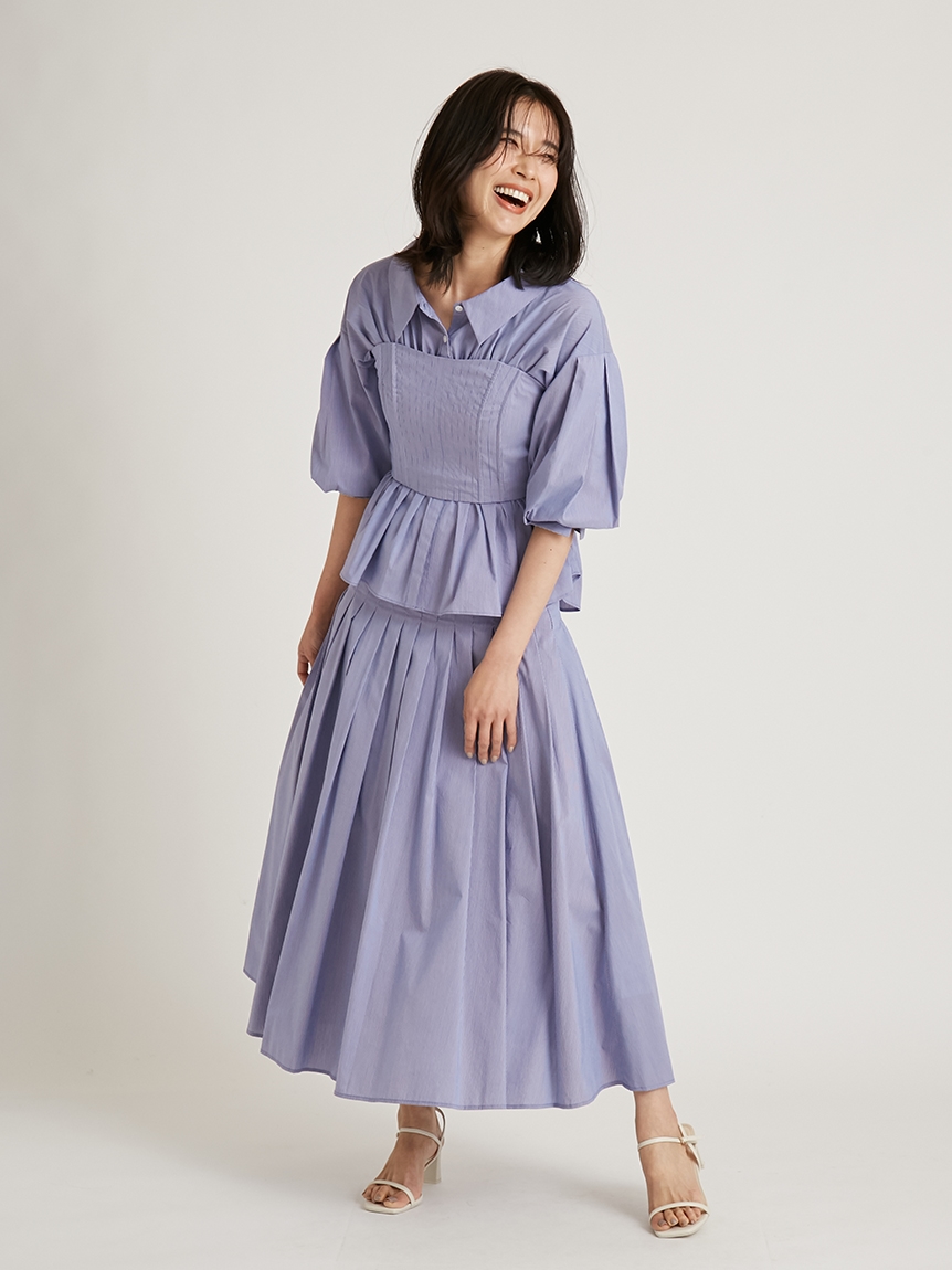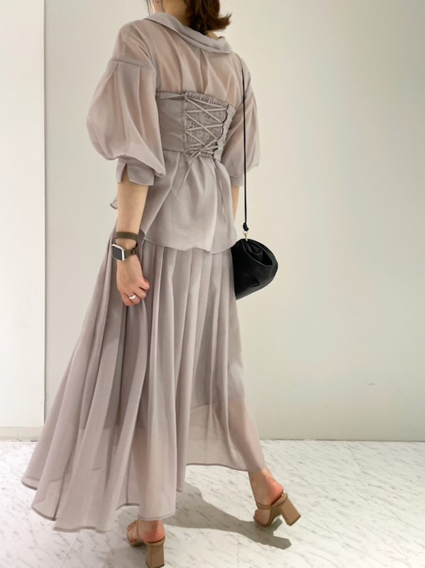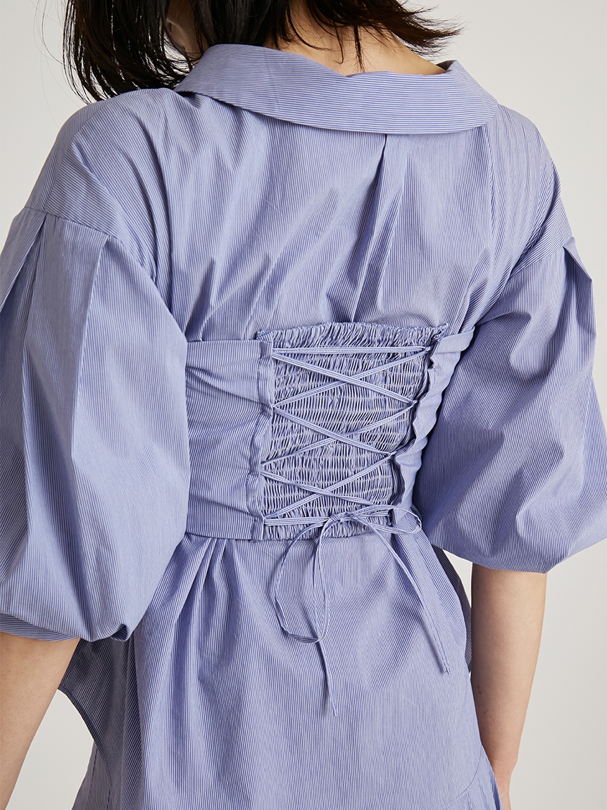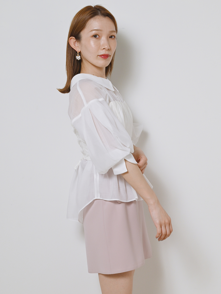 まるでコルセットをレイヤードしているかのようなドッキングデザインのブラウス。ふんわりと丸みのあるボリュームスリーブが愛らしさを高めるポイント。背中部分にはレースアップデザインを落とし込み、後ろ姿までフェミニンに仕上げています。裾部分に広がりのあるシルエットなので気になるボディラインがカバーできるのも嬉しい。同素材を使用したスカート(SWFS222095)とセットアップで着用いただけます。