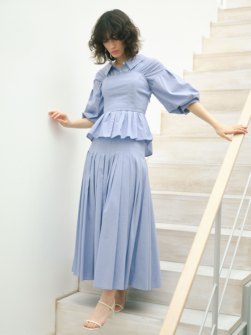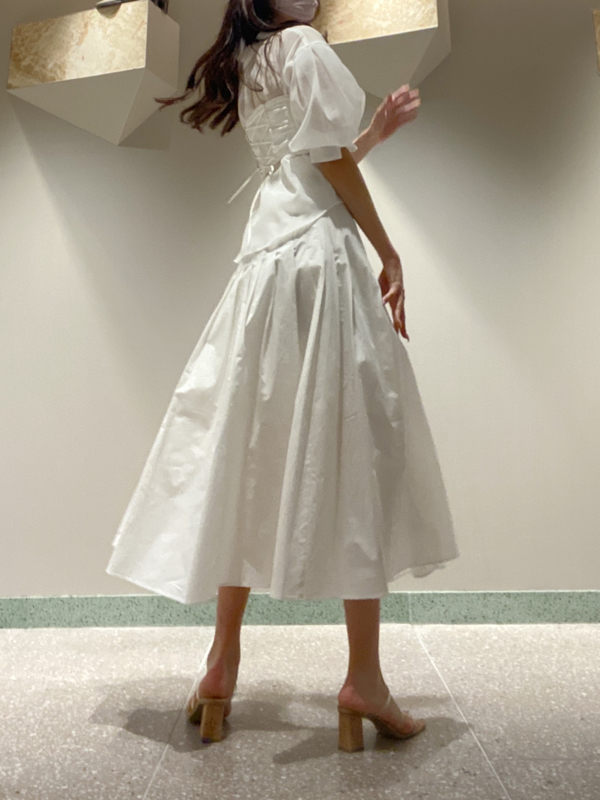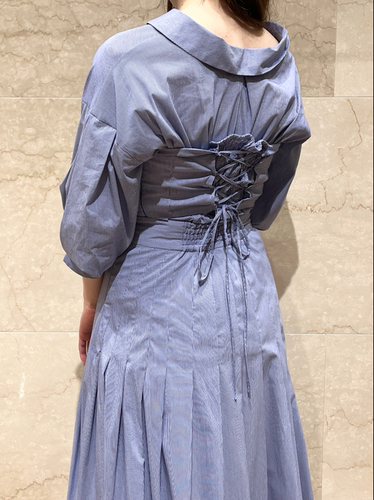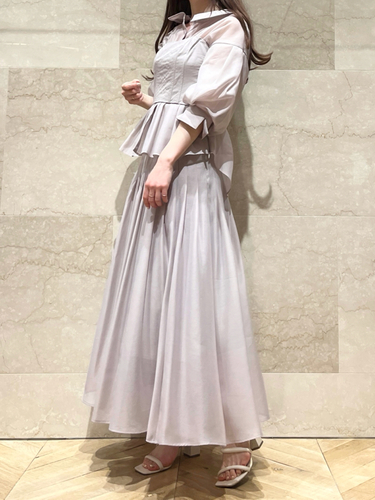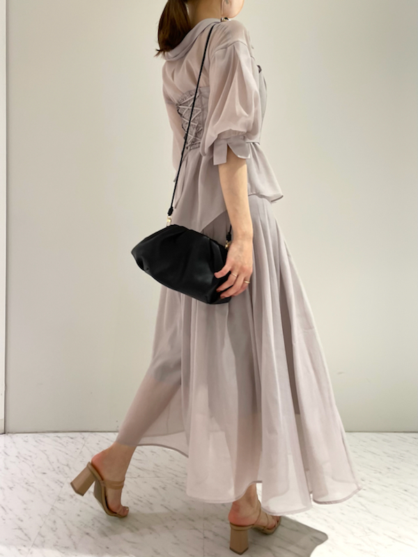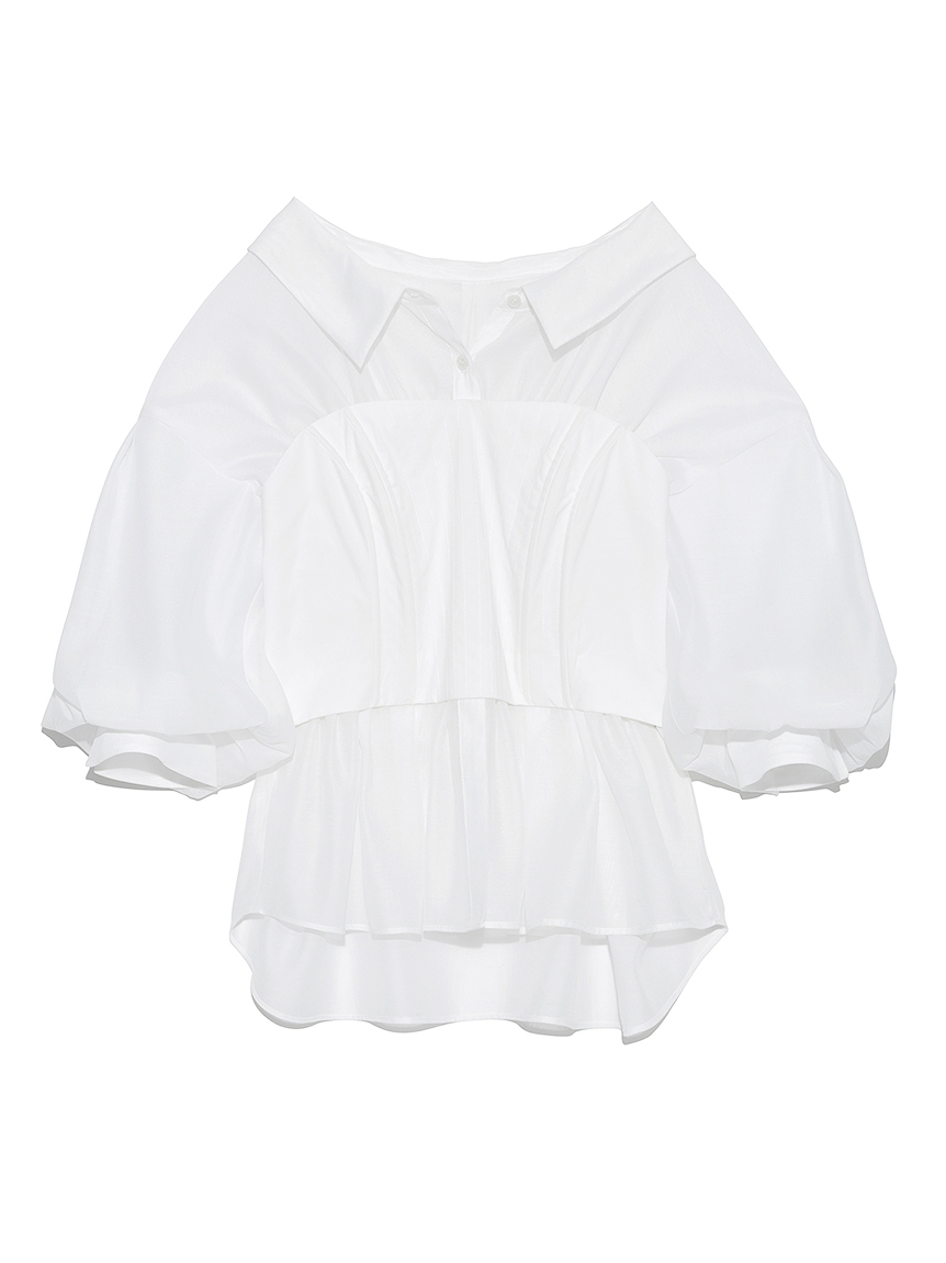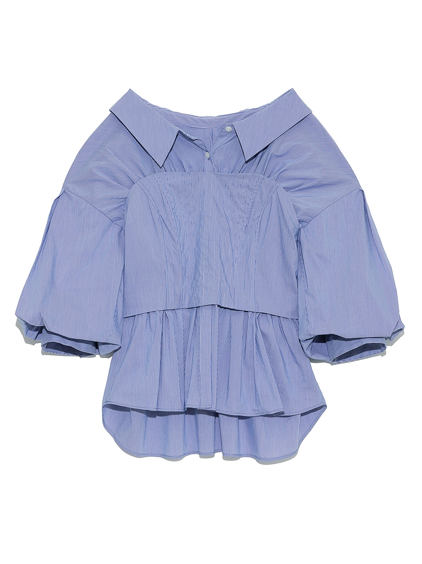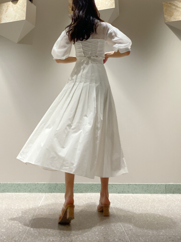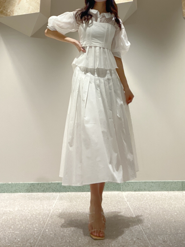 まるでコルセットをレイヤードしているかのようなドッキングデザインのブラウス。ふんわりと丸みのあるボリュームスリーブが愛らしさを高めるポイント。背中部分にはレースアップデザインを落とし込み、後ろ姿までフェミニンに仕上げています。裾部分に広がりのあるシルエットなので気になるボディラインがカバーできるのも嬉しい。同素材を使用したスカート(SWFS222095)とセットアップで着用いただけます。