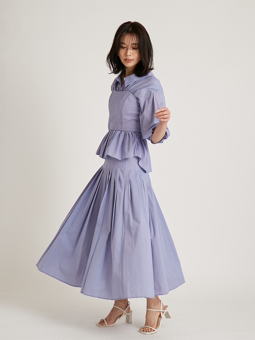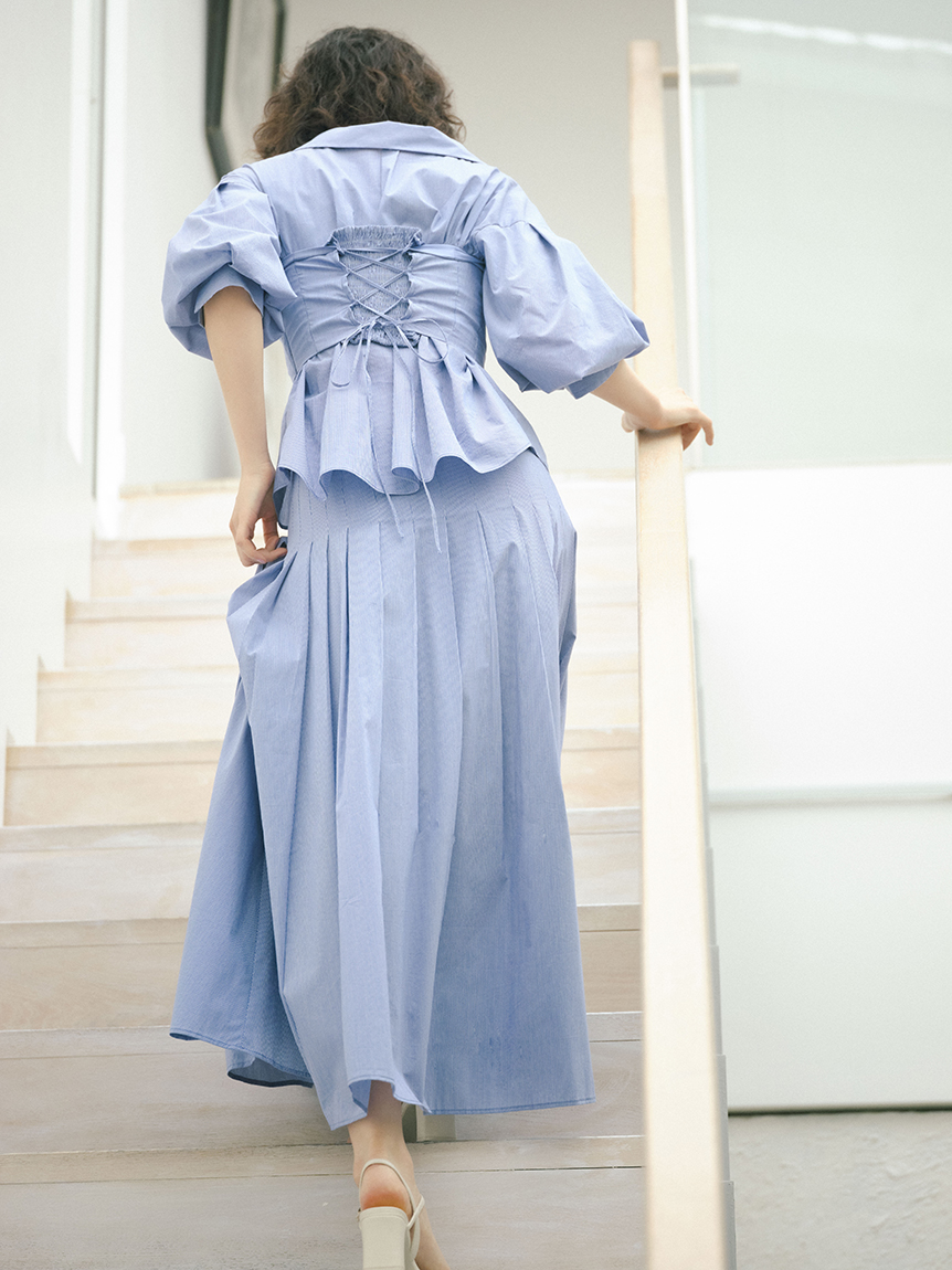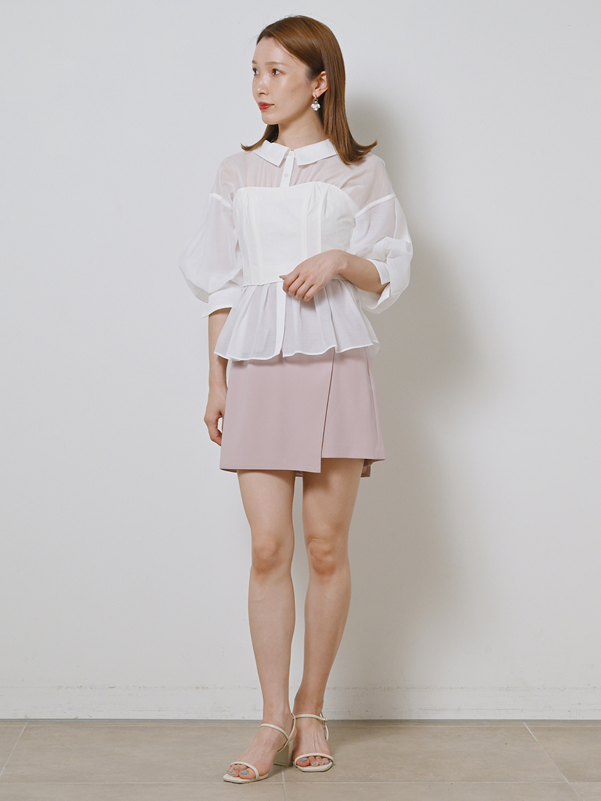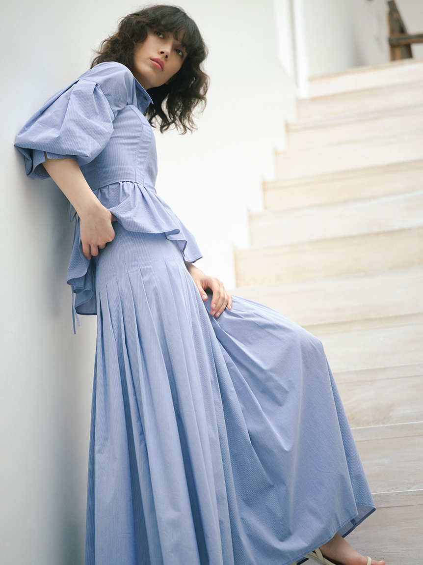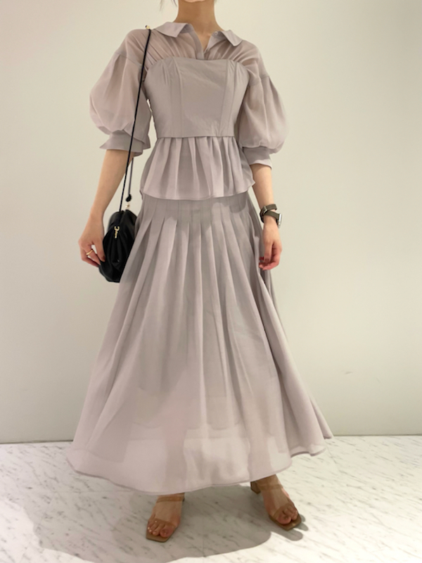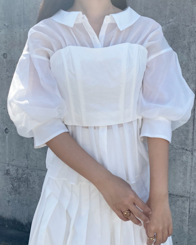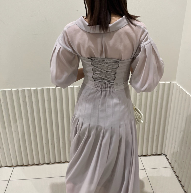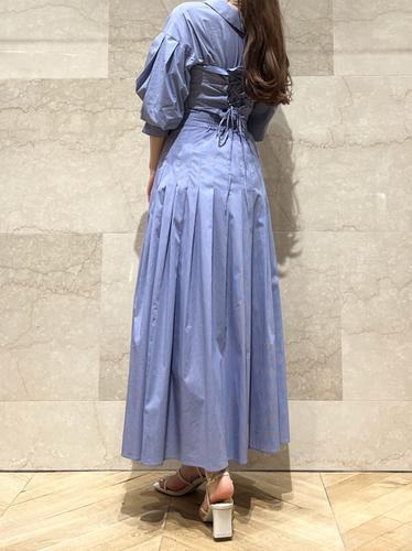 まるでコルセットをレイヤードしているかのようなドッキングデザインのブラウス。ふんわりと丸みのあるボリュームスリーブが愛らしさを高めるポイント。背中部分にはレースアップデザインを落とし込み、後ろ姿までフェミニンに仕上げています。裾部分に広がりのあるシルエットなので気になるボディラインがカバーできるのも嬉しい。同素材を使用したスカート(SWFS222095)とセットアップで着用いただけます。