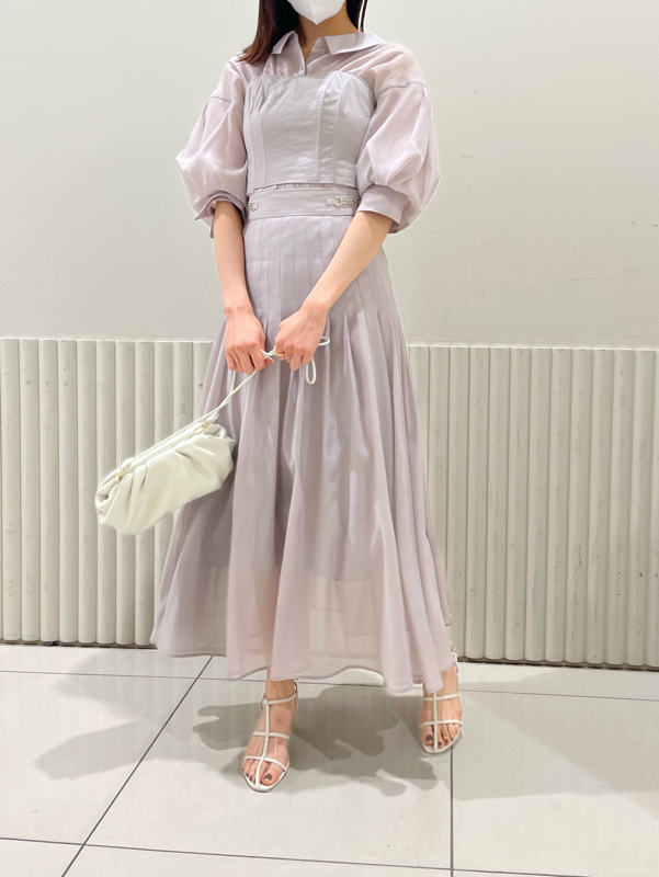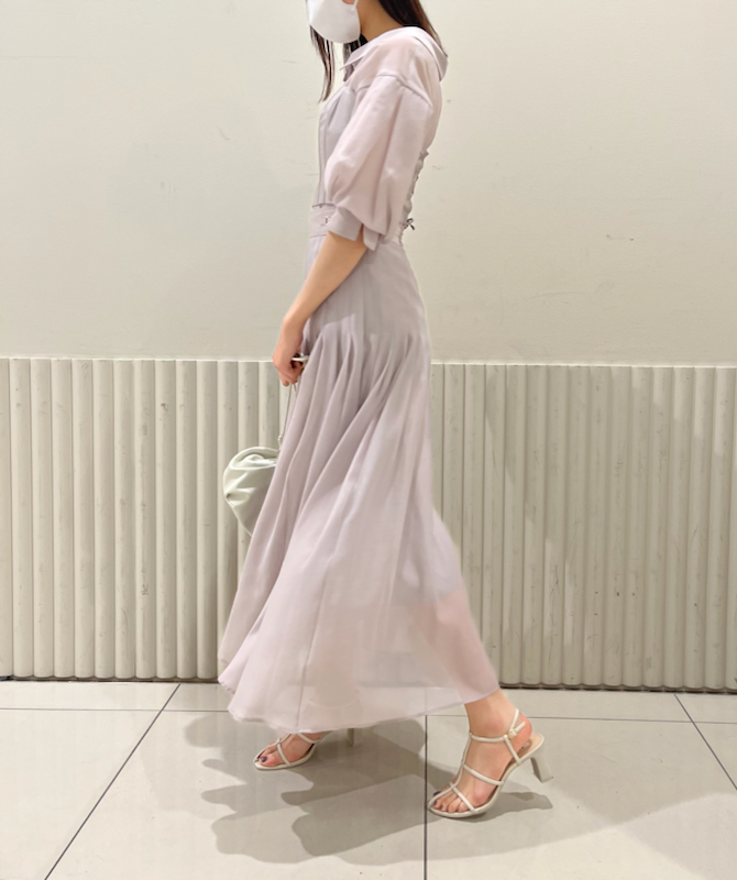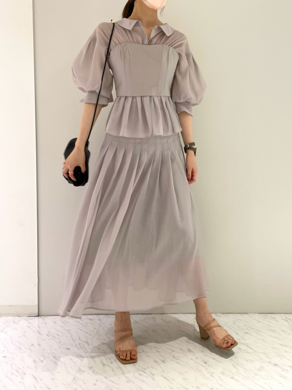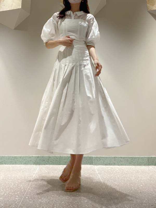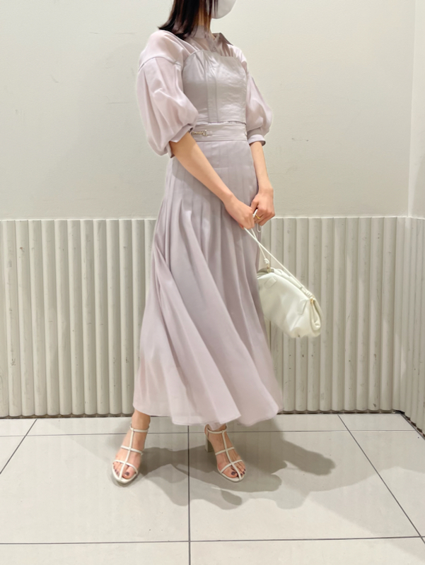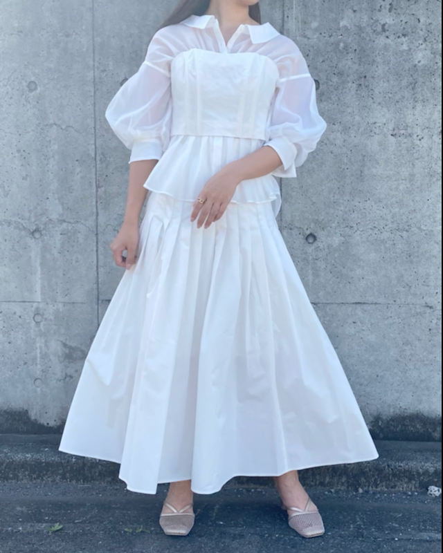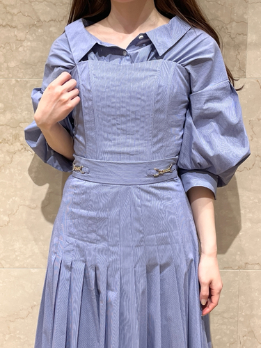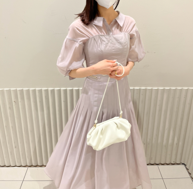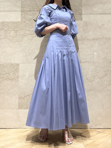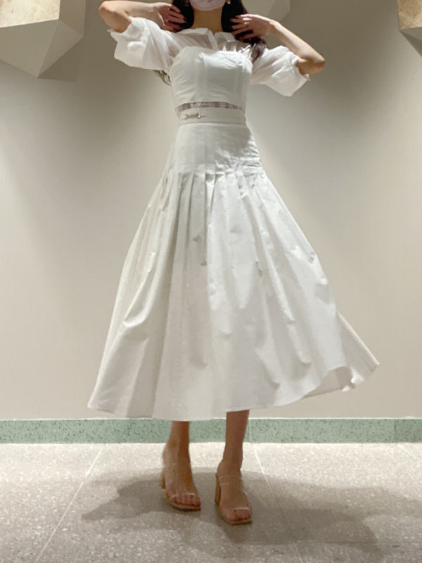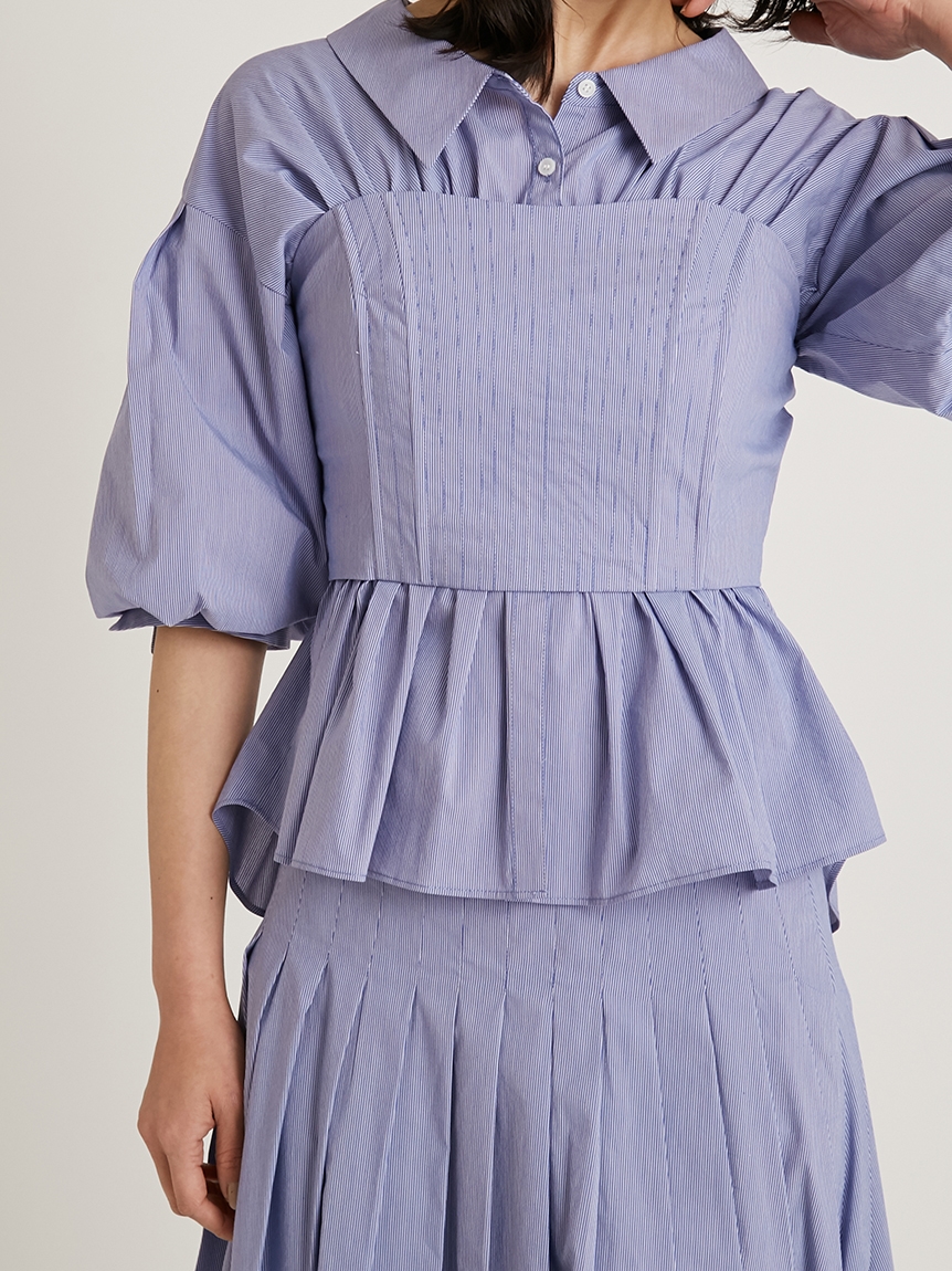 まるでコルセットをレイヤードしているかのようなドッキングデザインのブラウス。ふんわりと丸みのあるボリュームスリーブが愛らしさを高めるポイント。背中部分にはレースアップデザインを落とし込み、後ろ姿までフェミニンに仕上げています。裾部分に広がりのあるシルエットなので気になるボディラインがカバーできるのも嬉しい。同素材を使用したスカート(SWFS222095)とセットアップで着用いただけます。