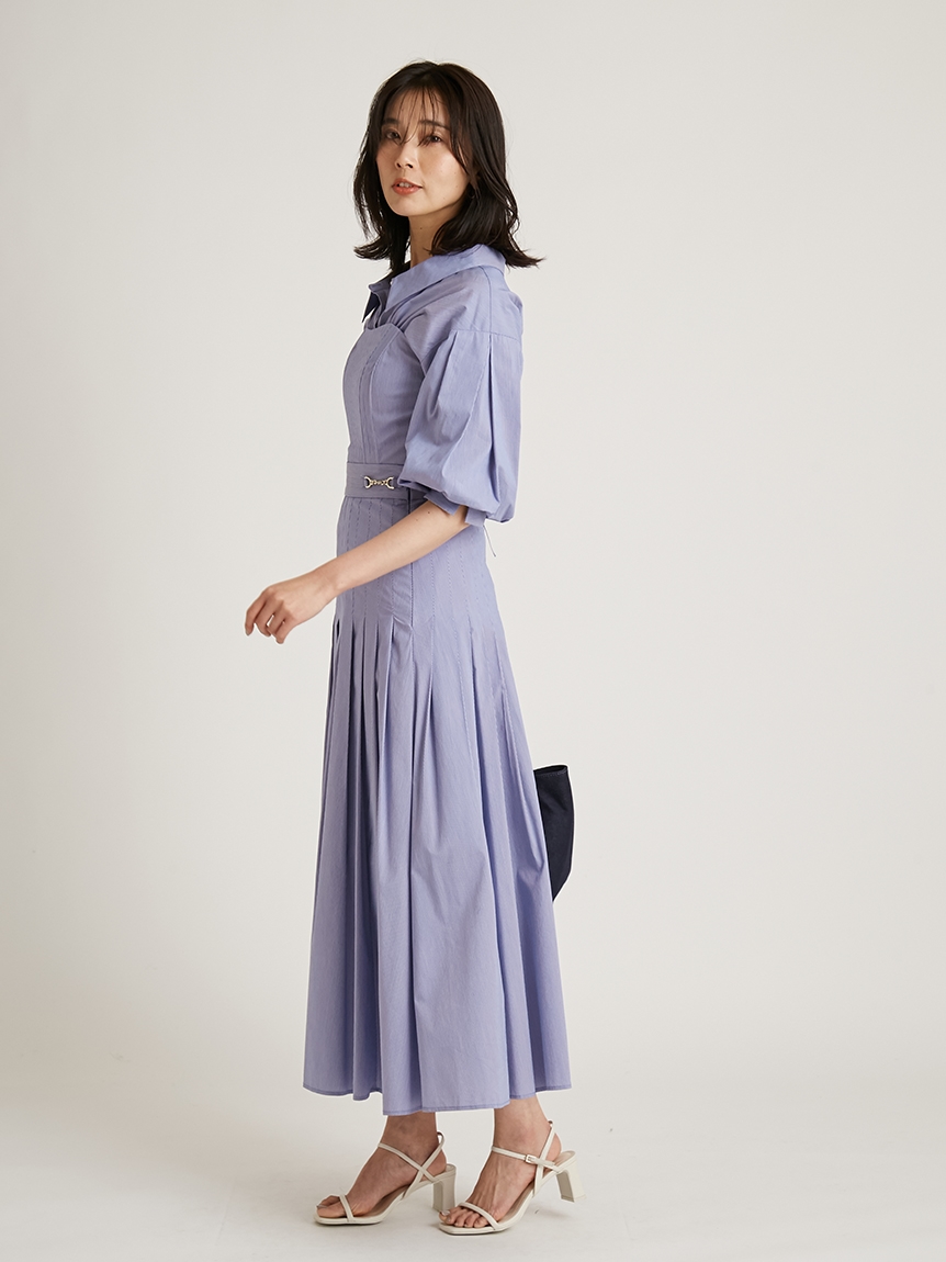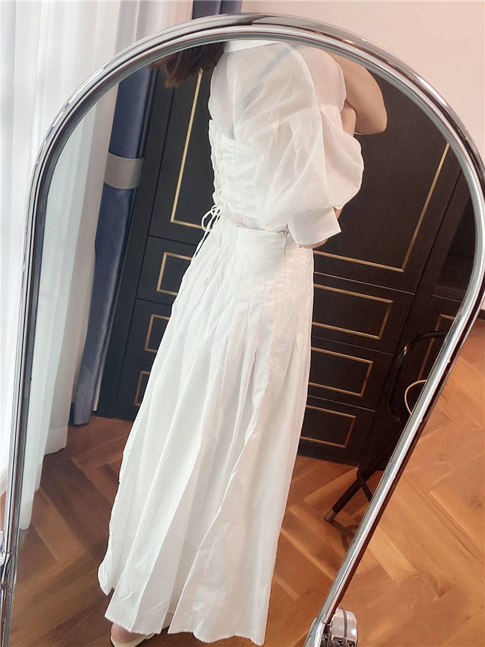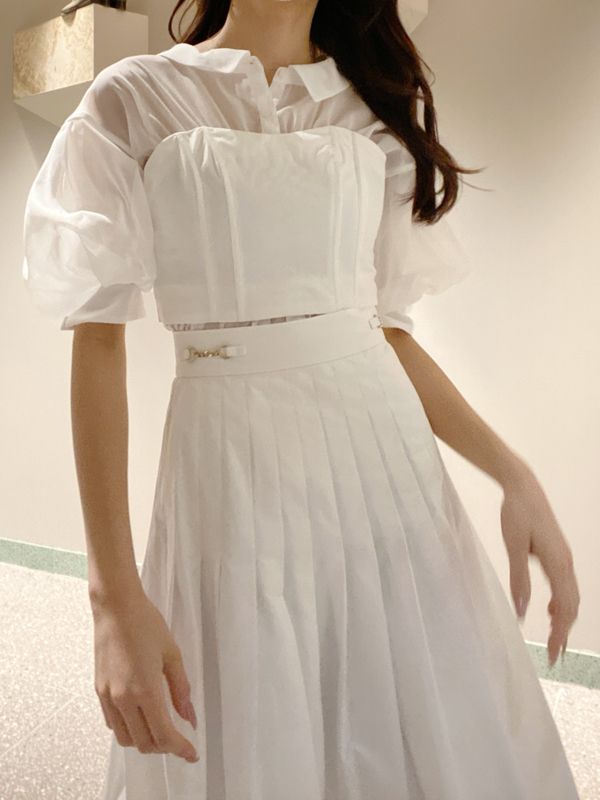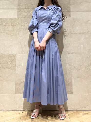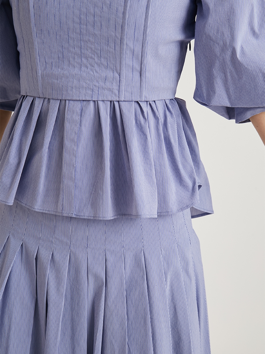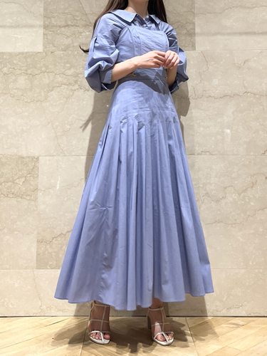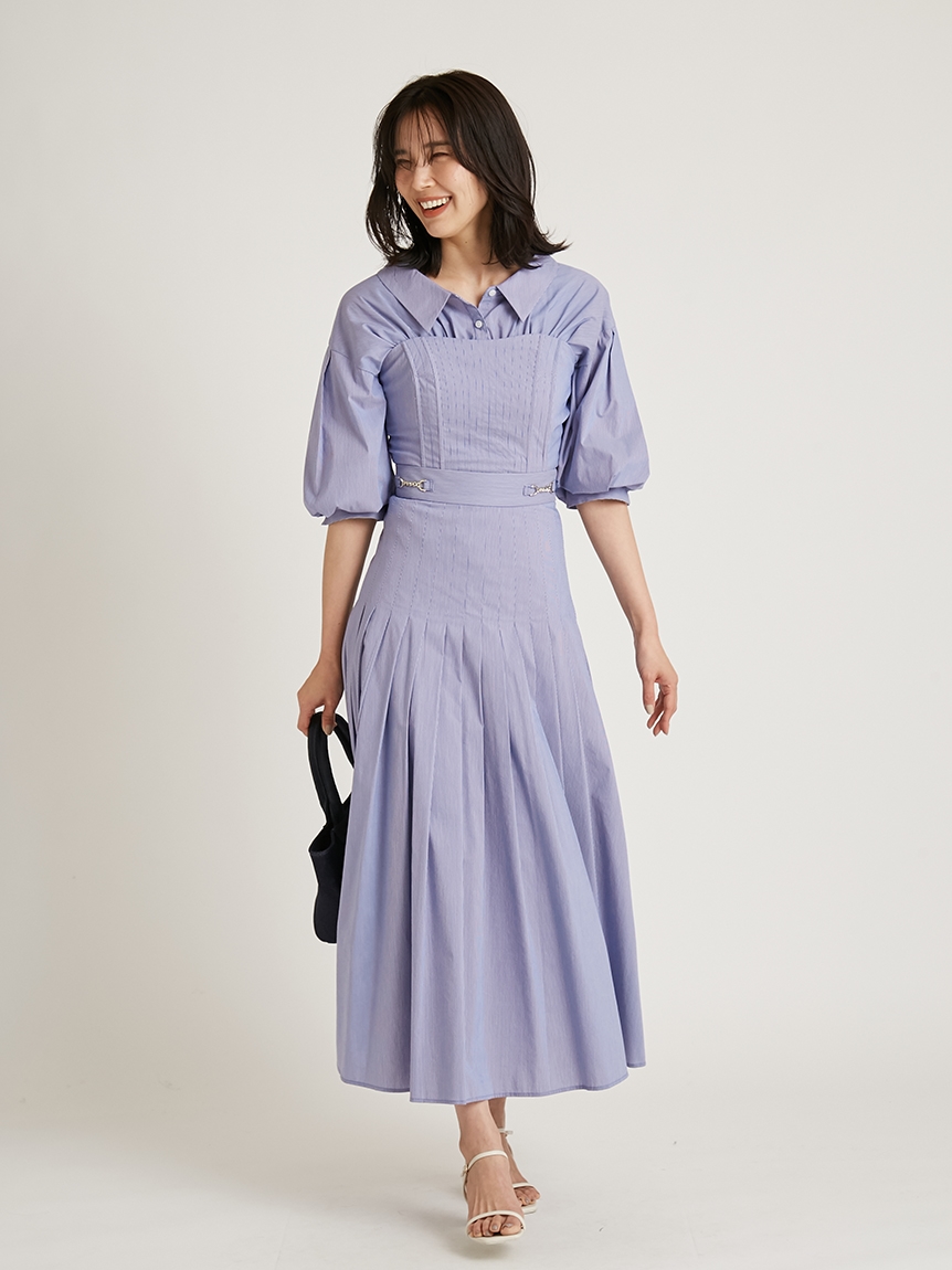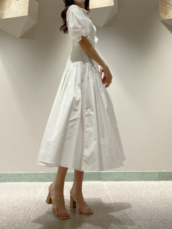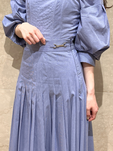 まるでコルセットをレイヤードしているかのようなドッキングデザインのブラウス。ふんわりと丸みのあるボリュームスリーブが愛らしさを高めるポイント。背中部分にはレースアップデザインを落とし込み、後ろ姿までフェミニンに仕上げています。裾部分に広がりのあるシルエットなので気になるボディラインがカバーできるのも嬉しい。同素材を使用したスカート(SWFS222095)とセットアップで着用いただけます。