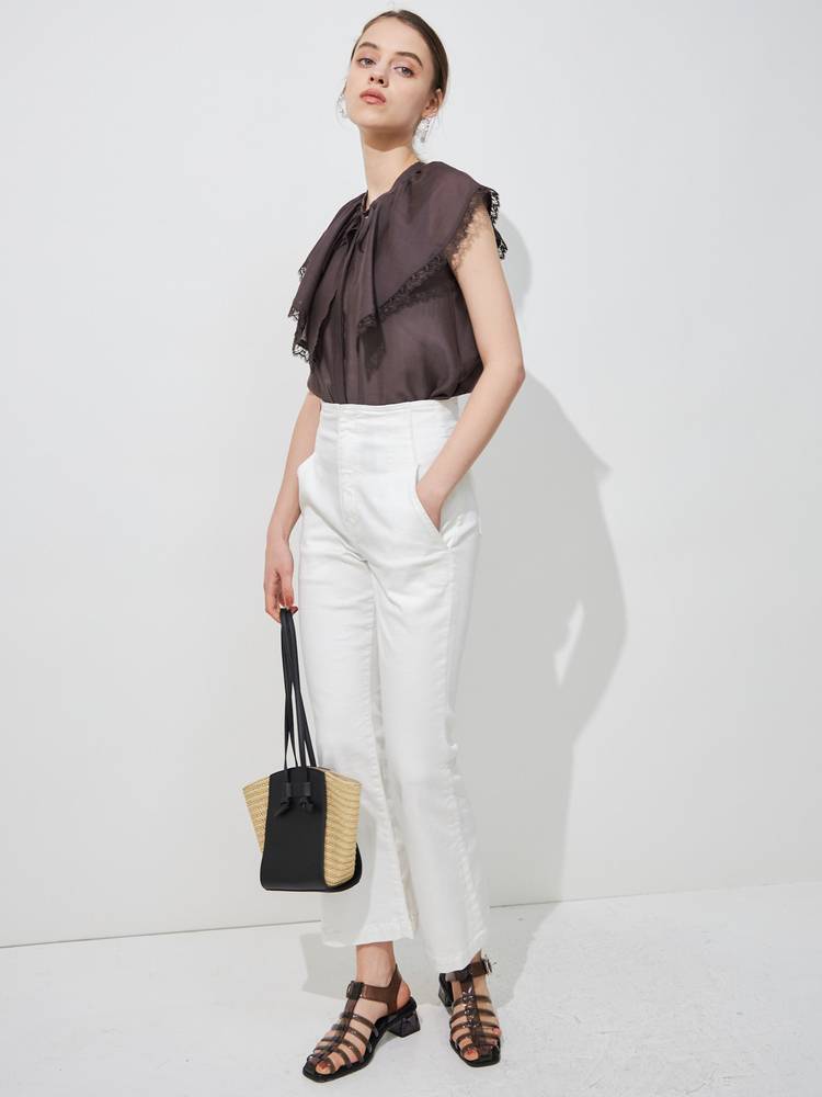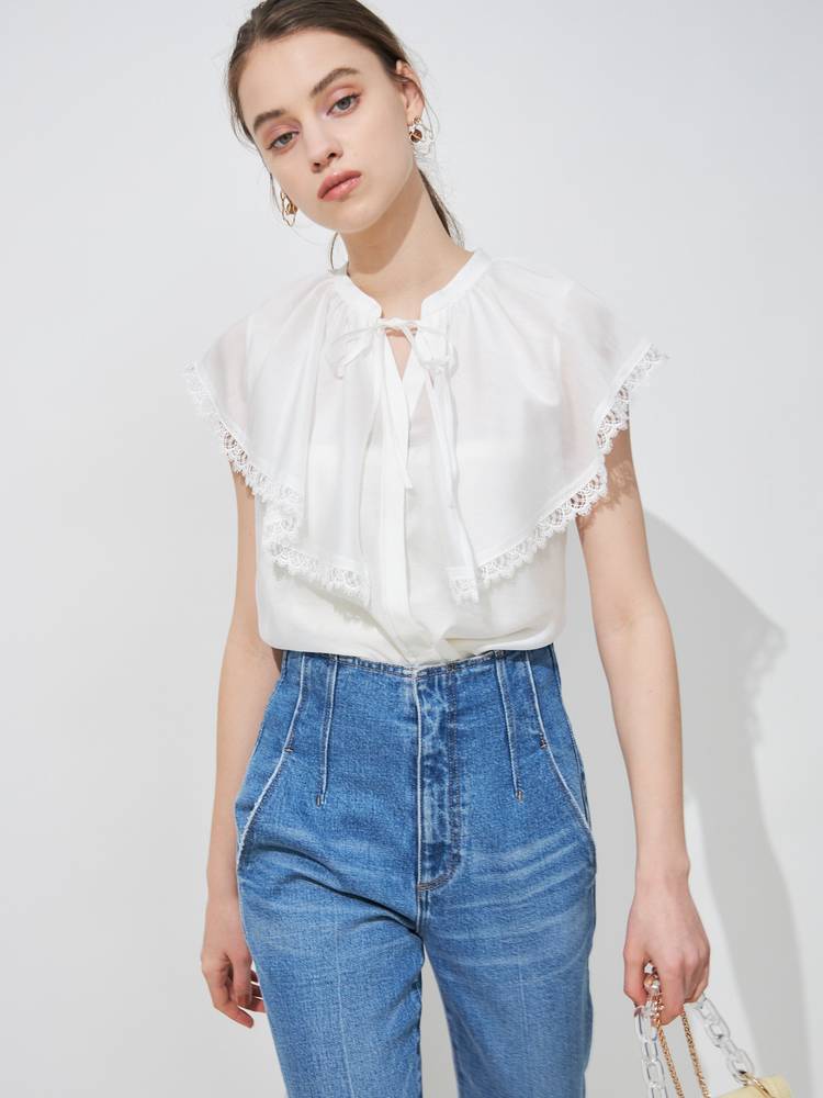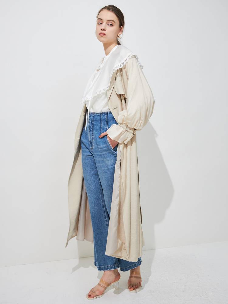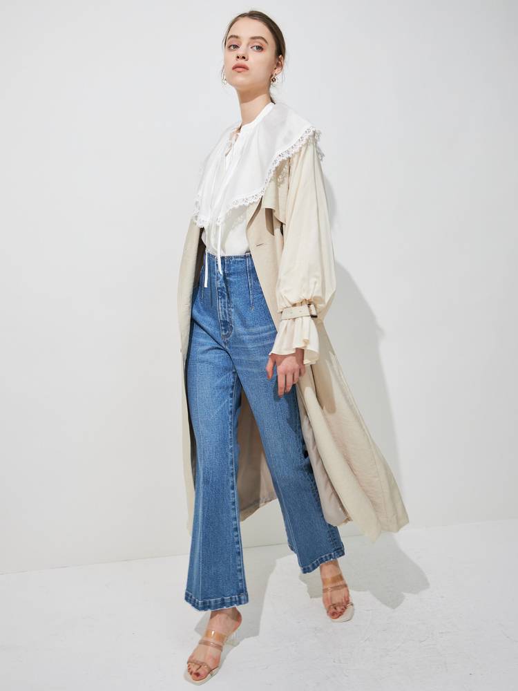 トレンドのボリュームラッフルは、合わせたジャケットやトレンチなどから襟を出して着こなすのが今年っぽいスタイリング。