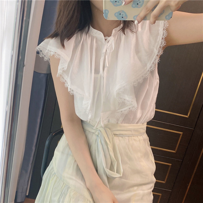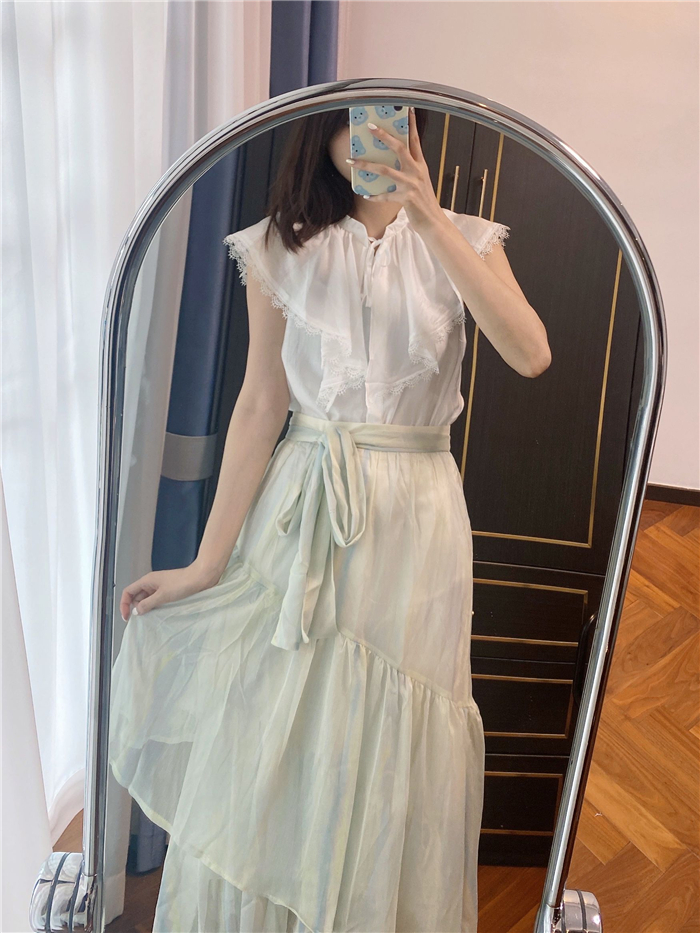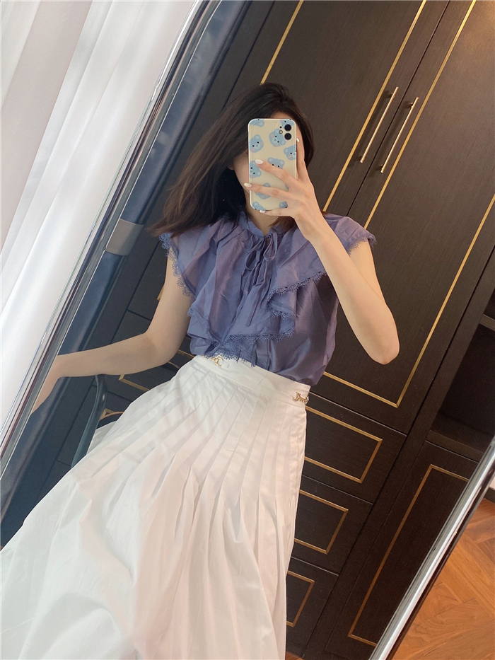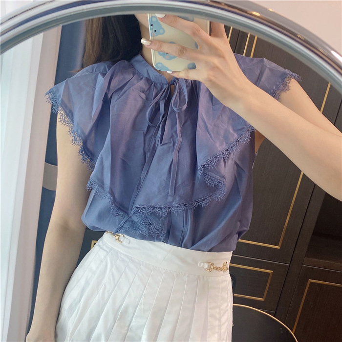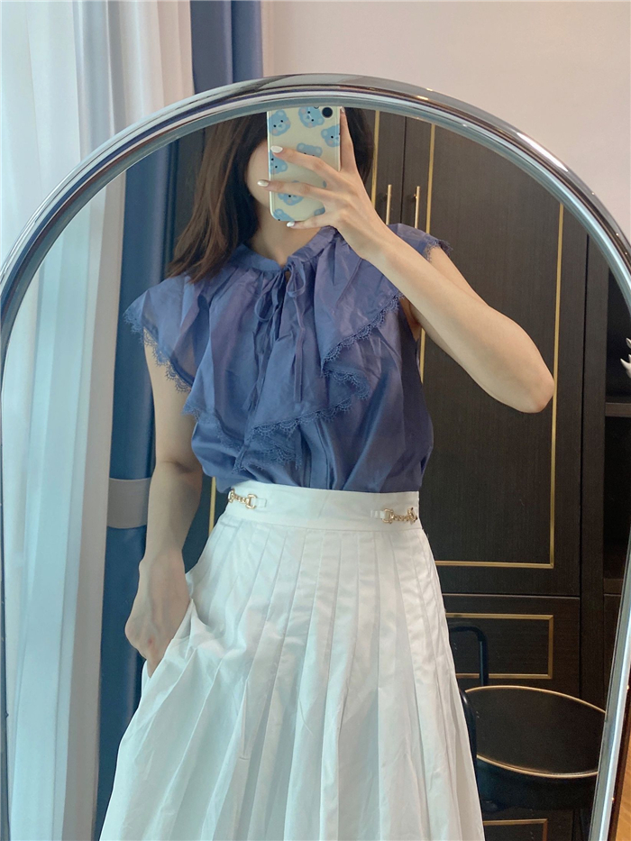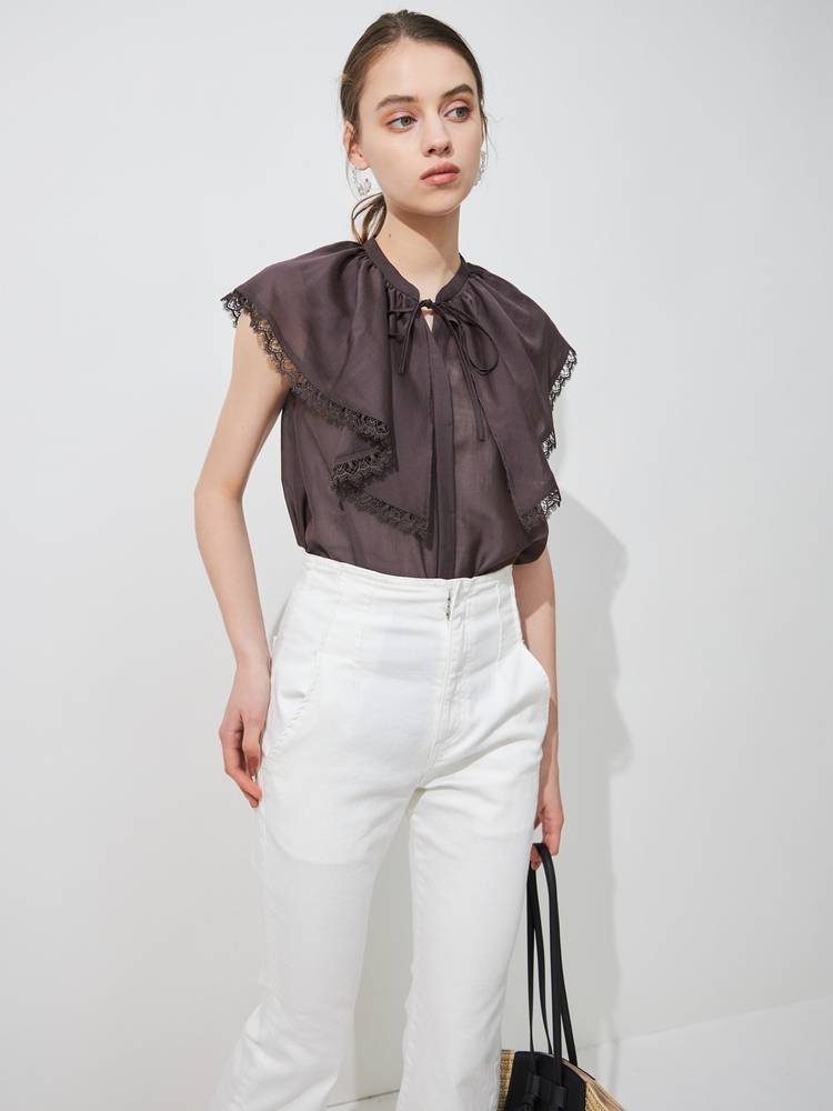 スキッパーの立ち襟でデコルテはすっきり見せつつ、胸元のリボンでフロントにアクセントを。