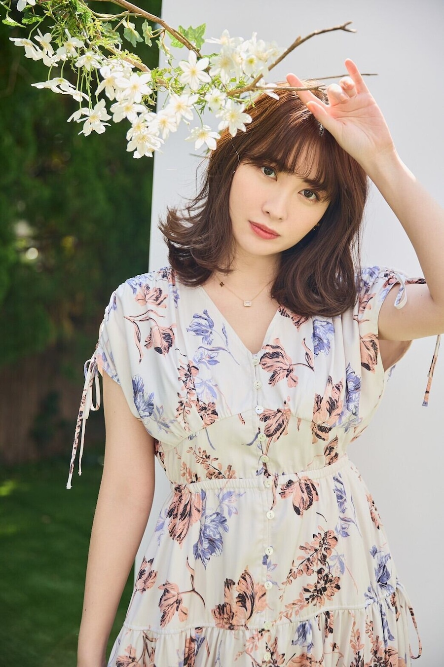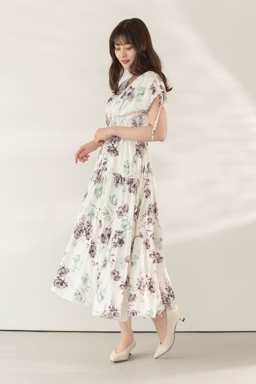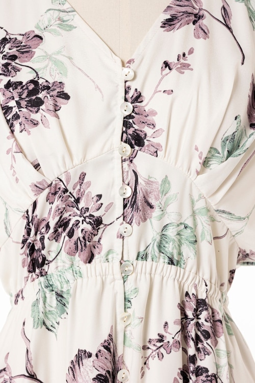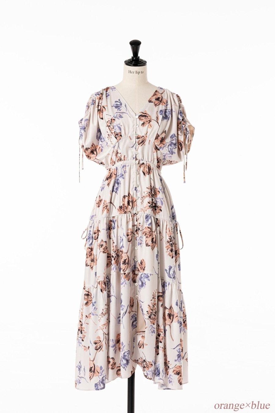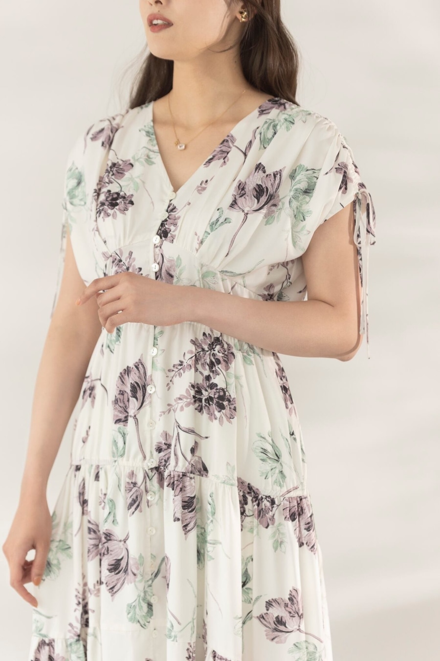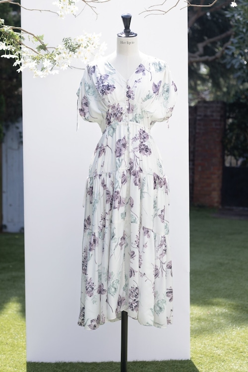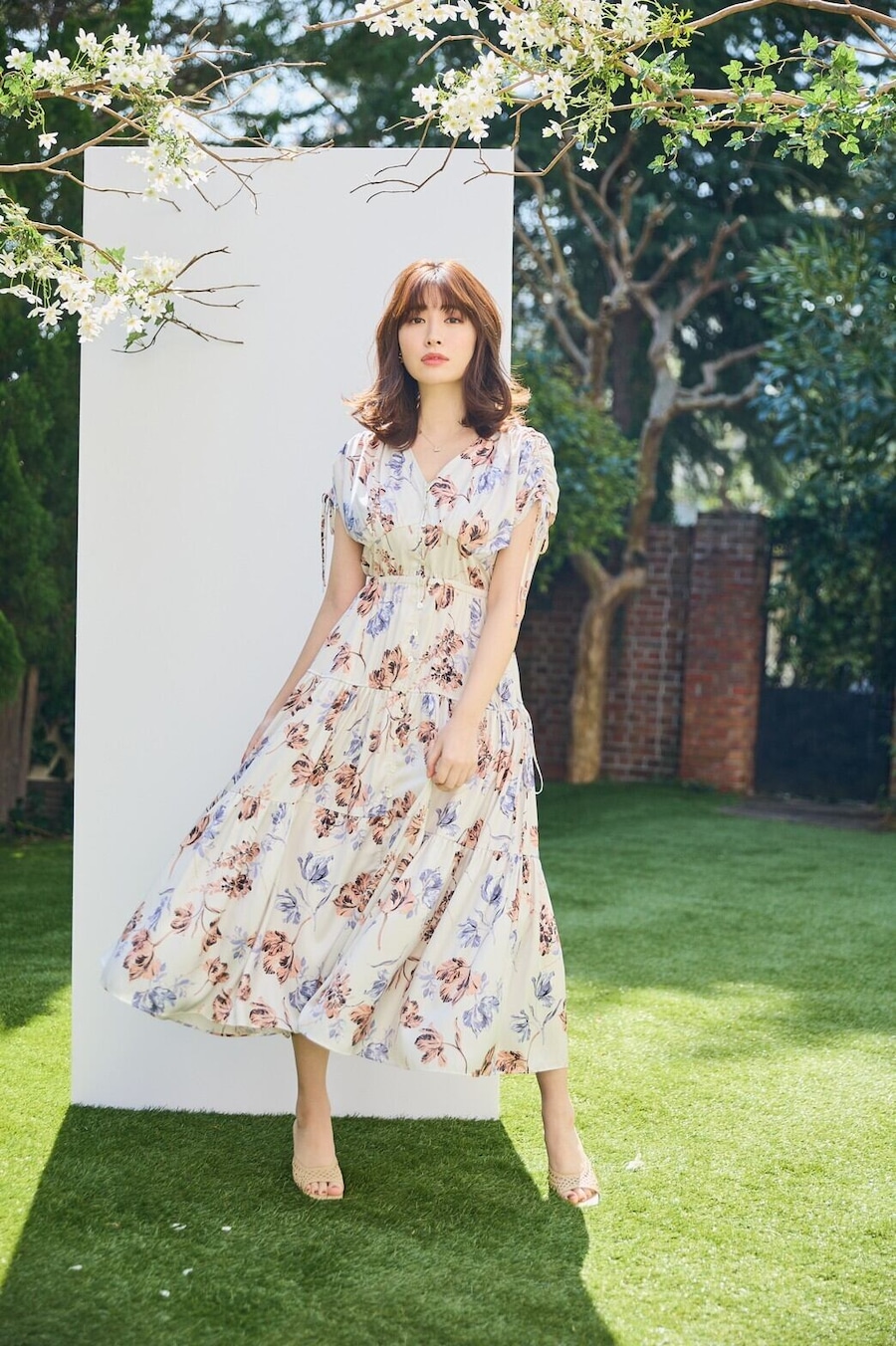 モダンなお花のカラーリングが目を引く、春おすすめのフローラルドレスです。