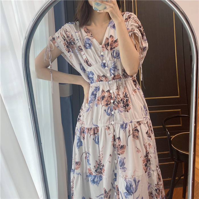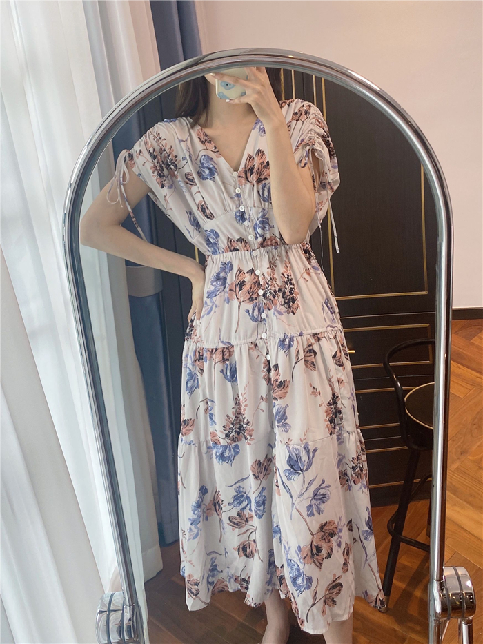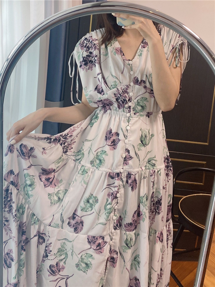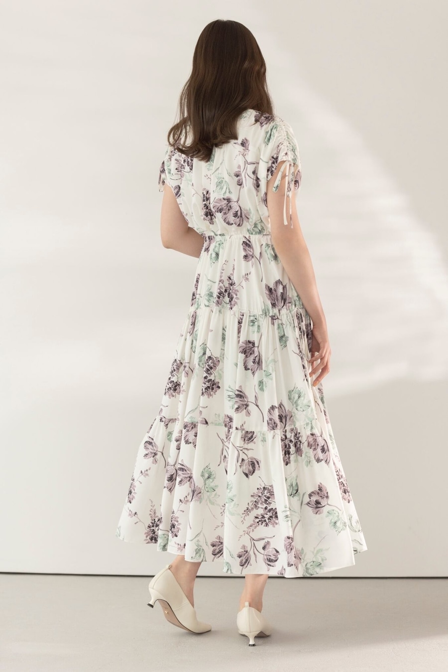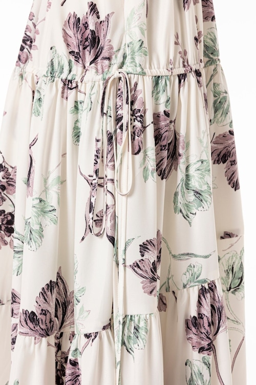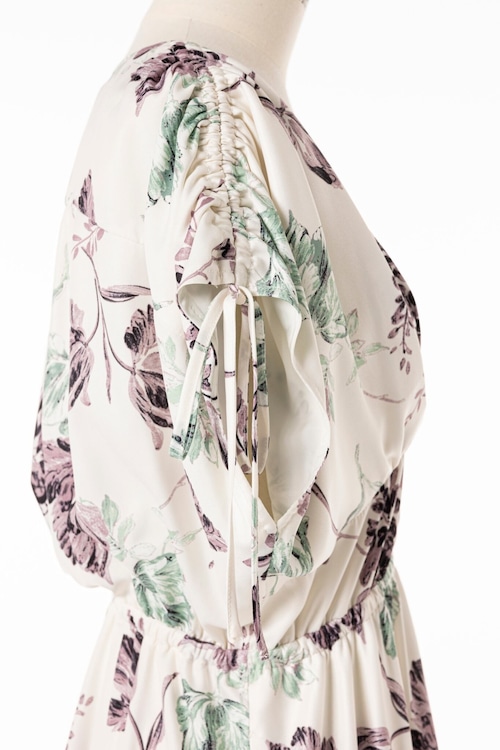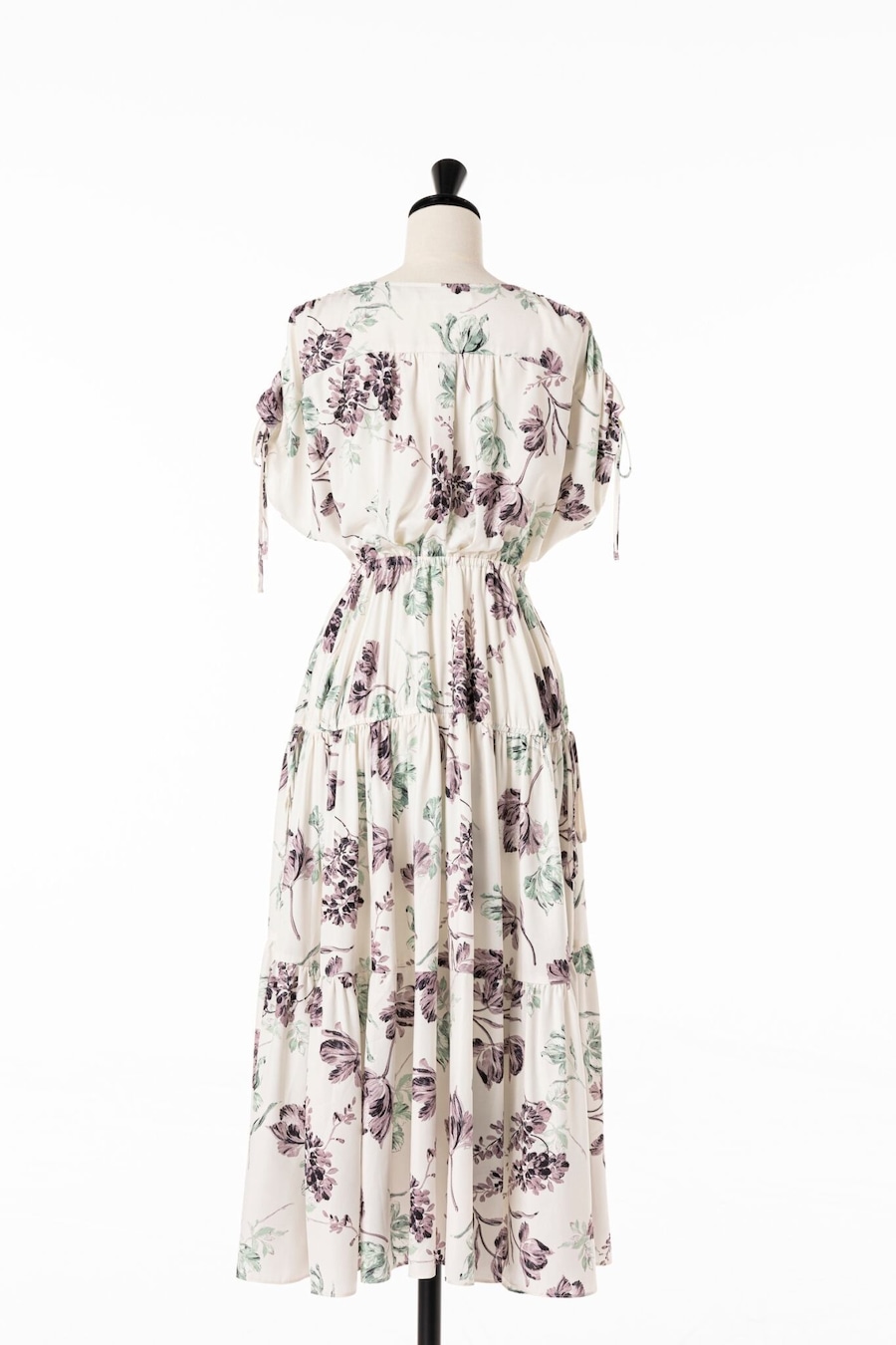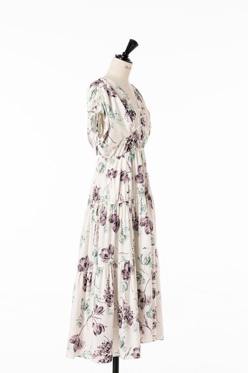 モダンなお花のカラーリングが目を引く、春おすすめのフローラルドレスです。