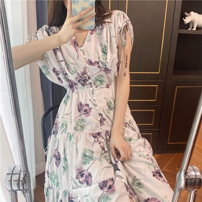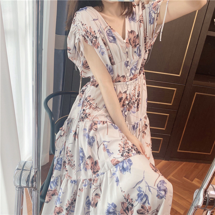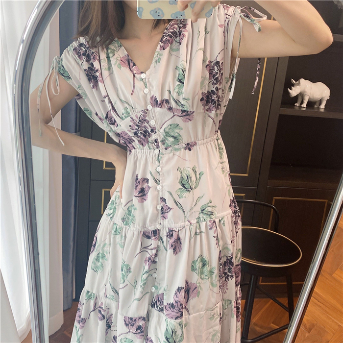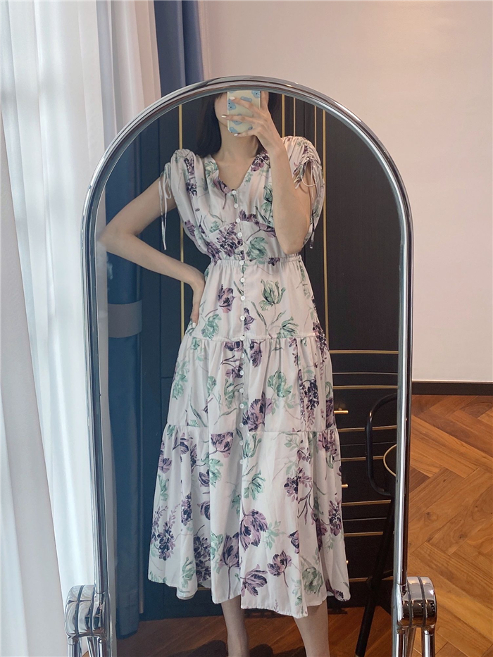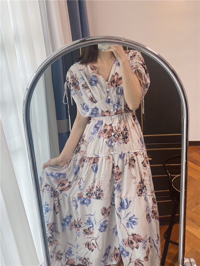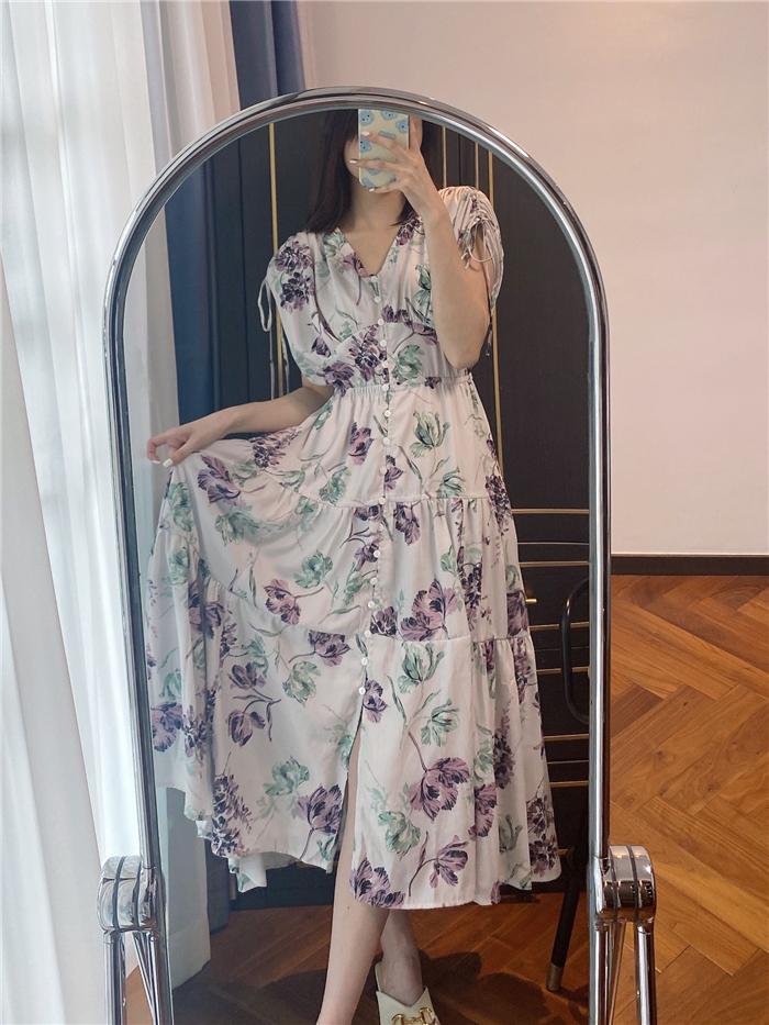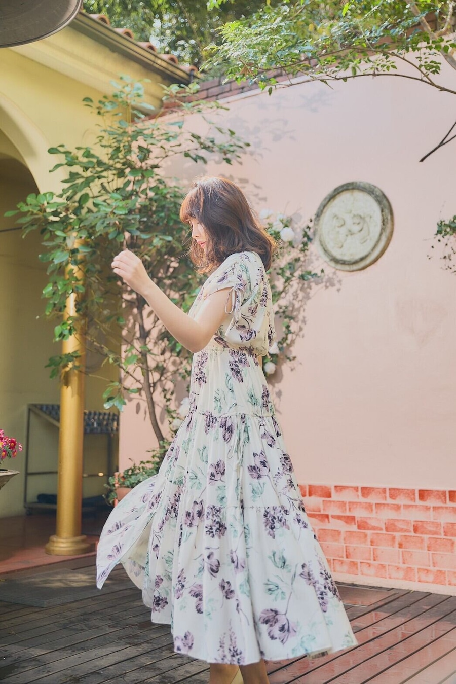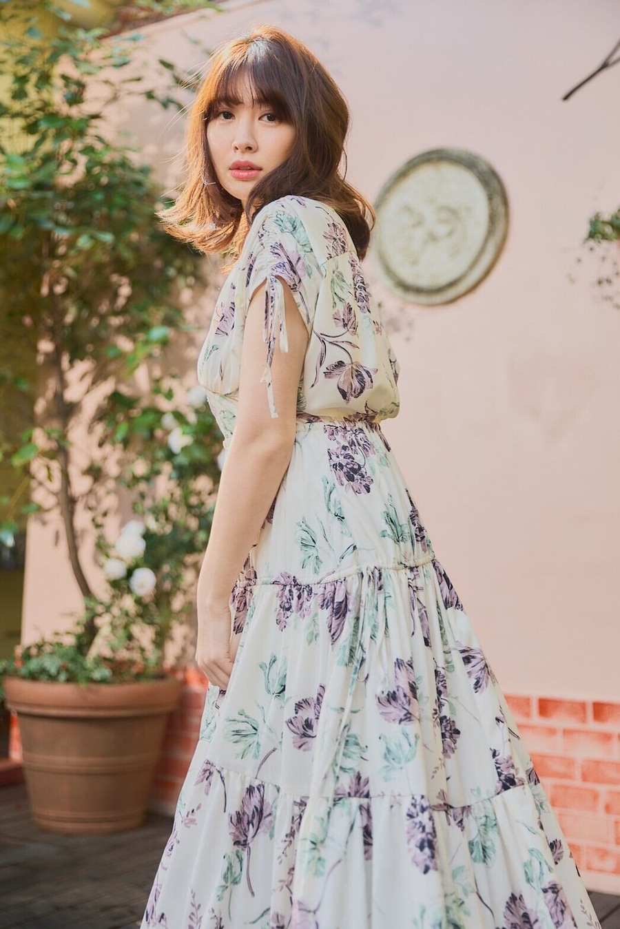 モダンなお花のカラーリングが目を引く、春おすすめのフローラルドレスです。