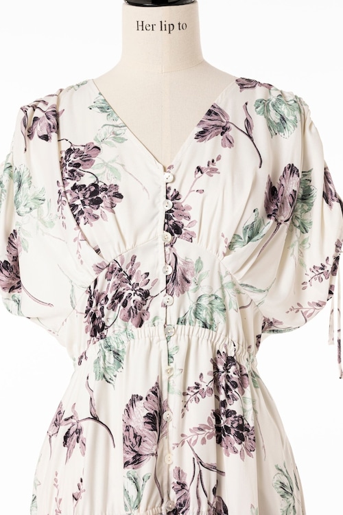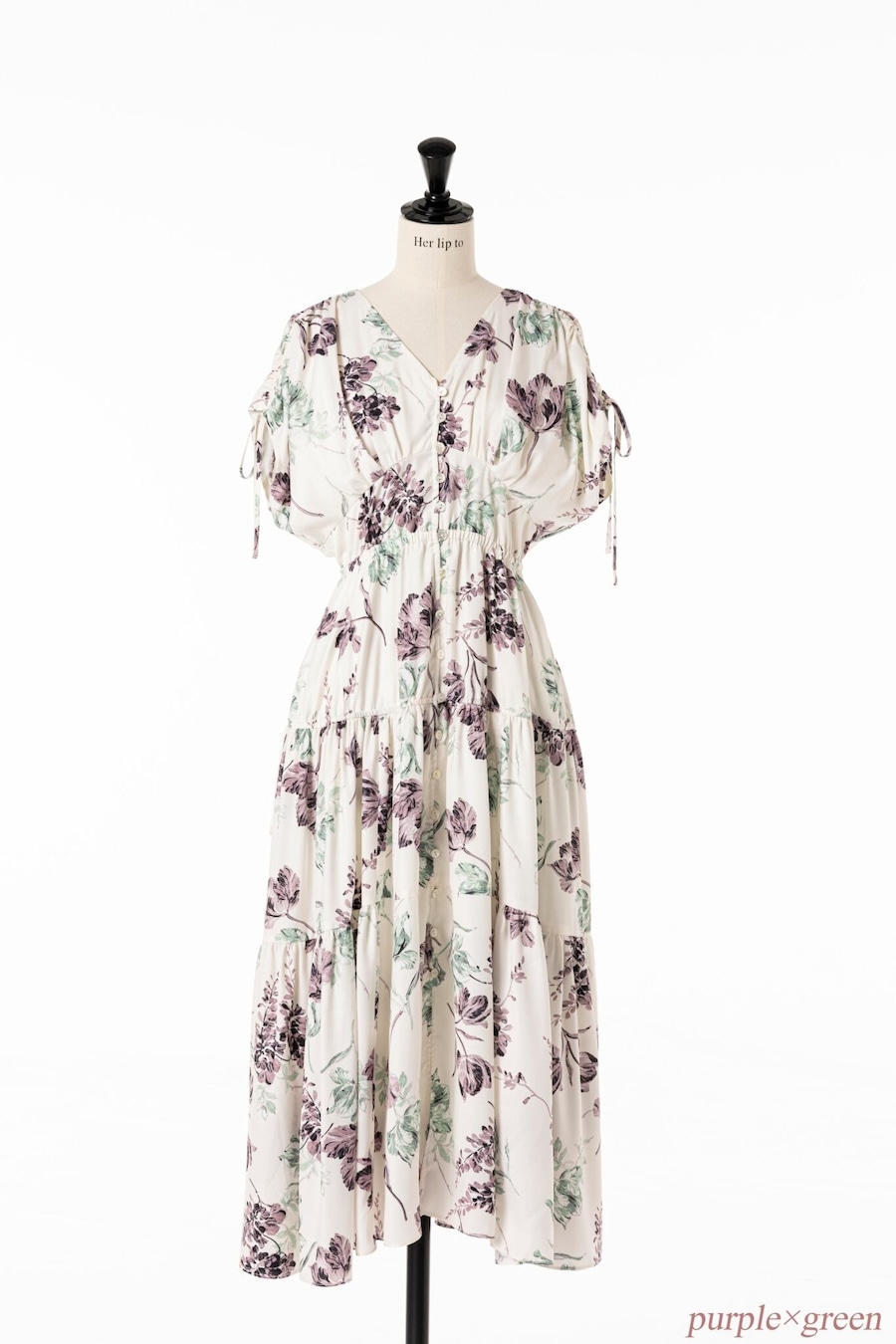 パープルとグリーン、オレンジとブルーの組み合わせが、他にないHer lip toらしいエレガントな花柄です。