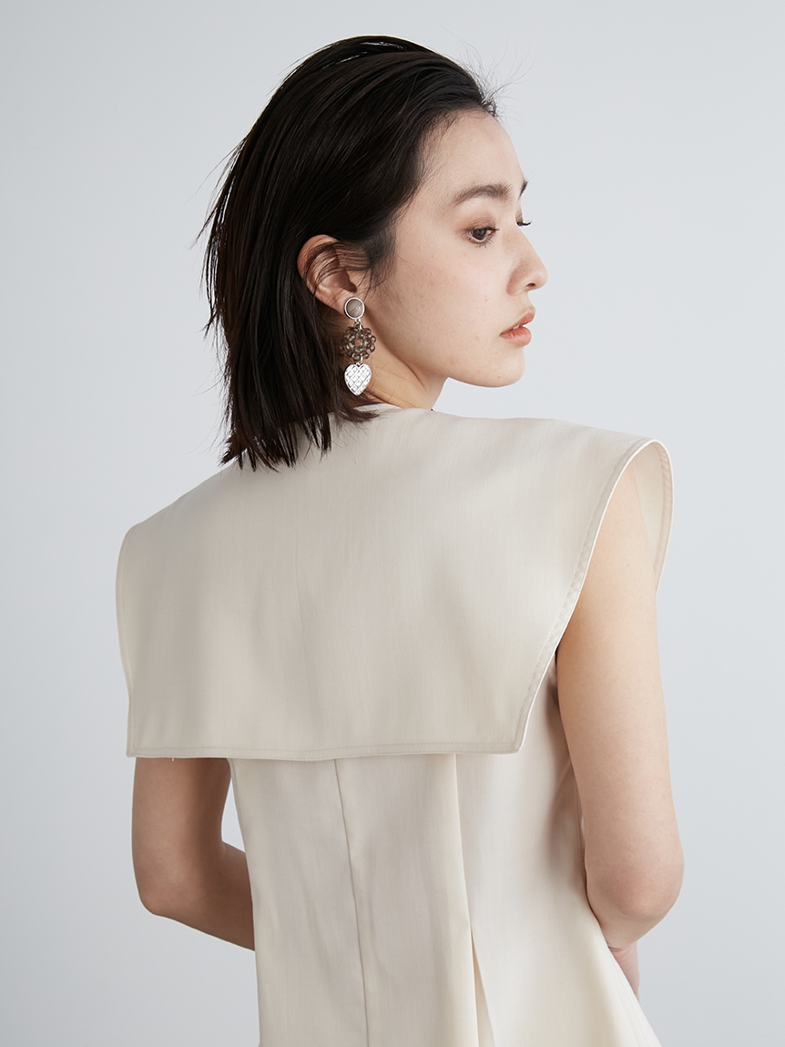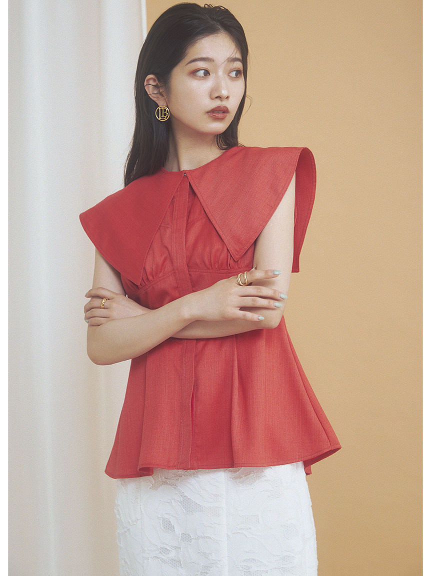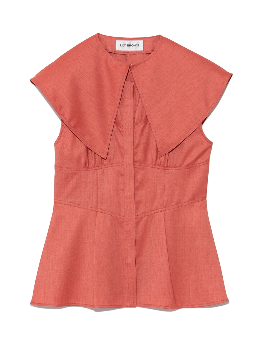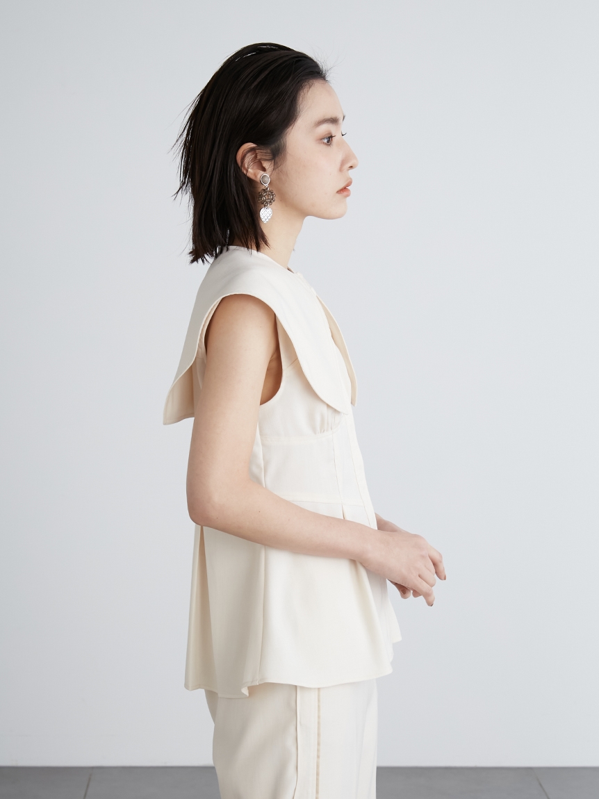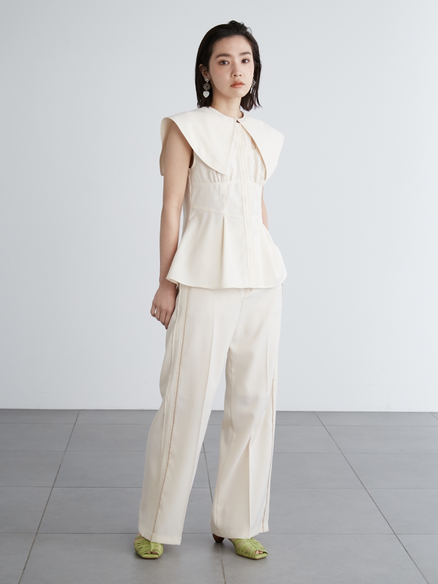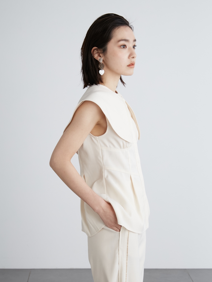 肩を覆うほどのビッグカラーが特徴的な、トレンド感溢れるノースリーブシャツ。身頃部分にビスチェディテールを取り入れステッチを効かせることで、女性らしいメリハリ感を演出しています。襟は取り外しできるので、気分やスタイリングに合わせて自由にアレンジが可能。同素材を用いたパンツ(LWFP222024)とセットアップでの着用がおススメです。