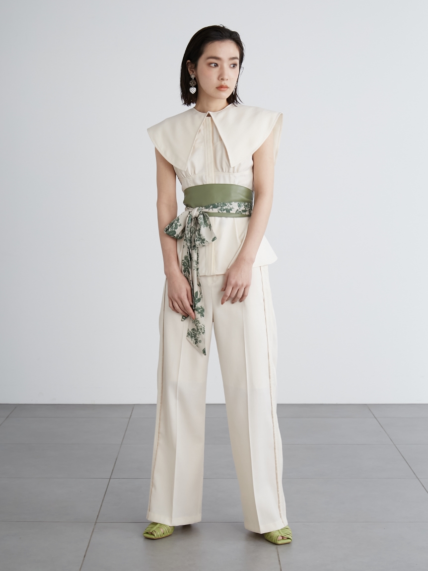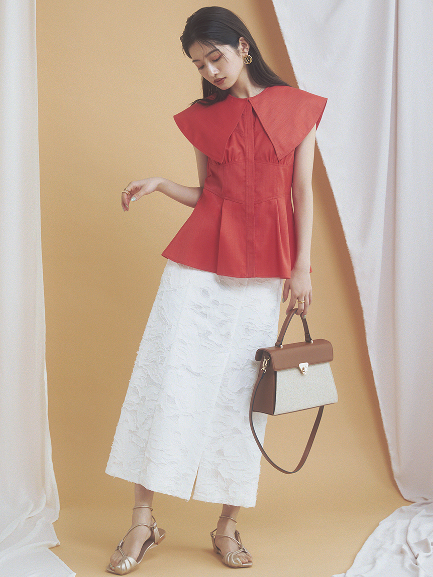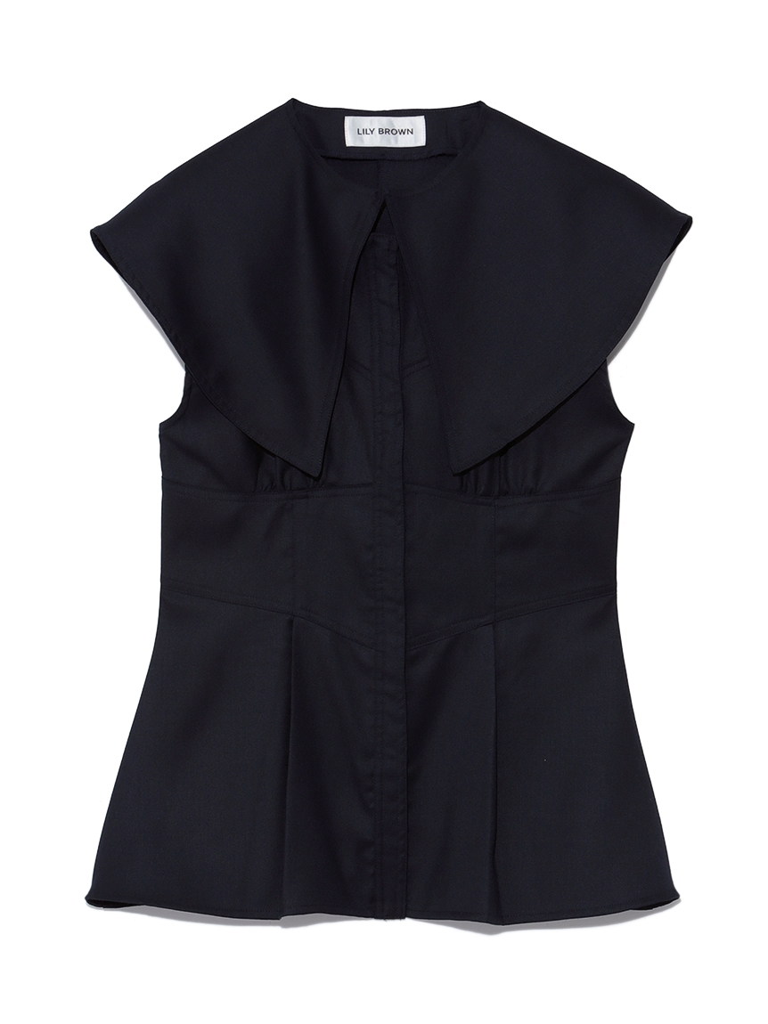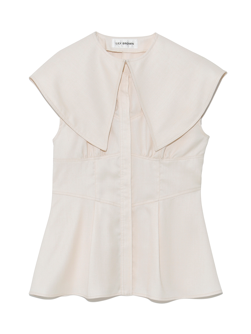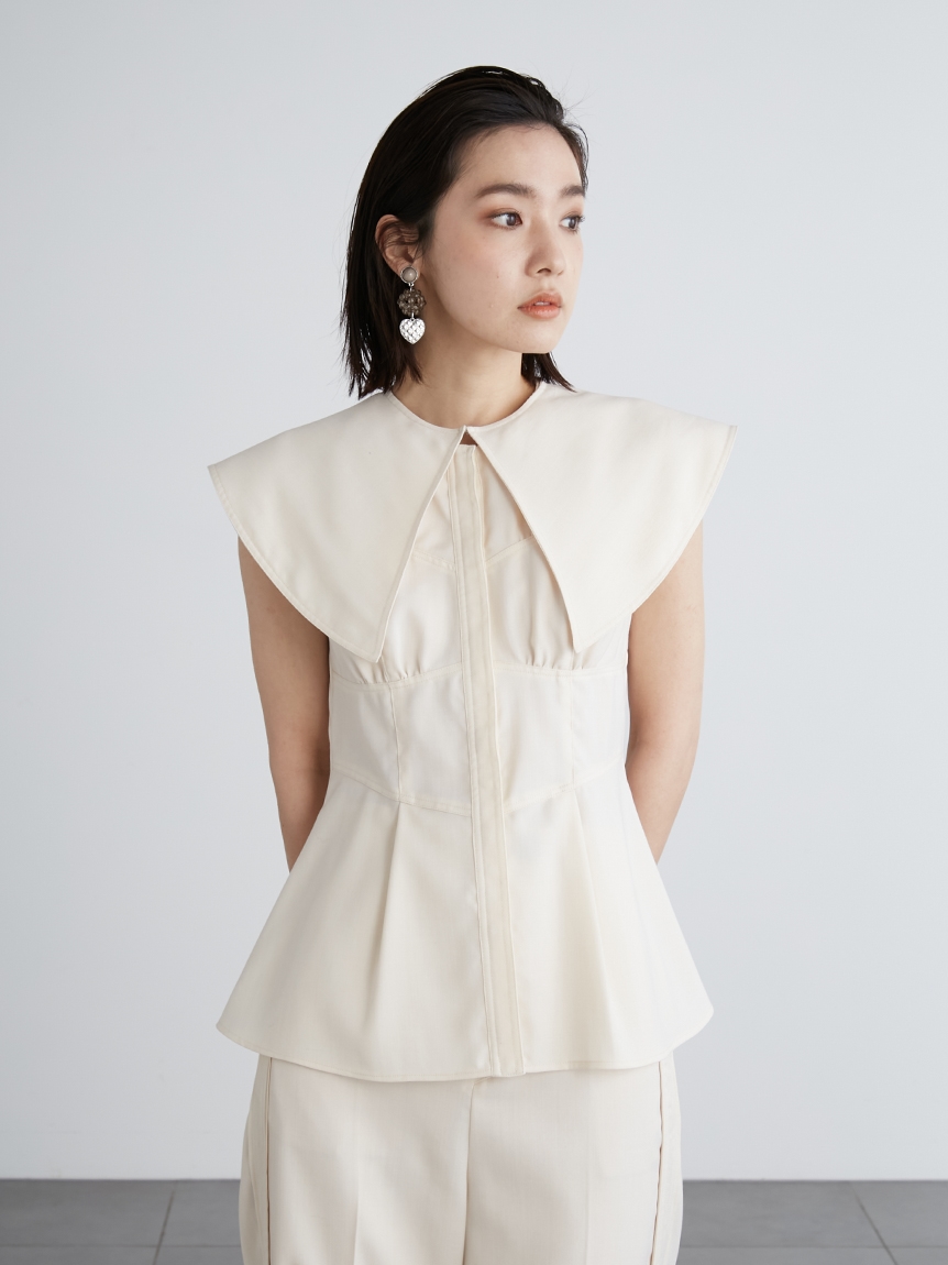 肩を覆うほどのビッグカラーが特徴的な、トレンド感溢れるノースリーブシャツ。身頃部分にビスチェディテールを取り入れステッチを効かせることで、女性らしいメリハリ感を演出しています。襟は取り外しできるので、気分やスタイリングに合わせて自由にアレンジが可能。同素材を用いたパンツ(LWFP222024)とセットアップでの着用がおススメです。