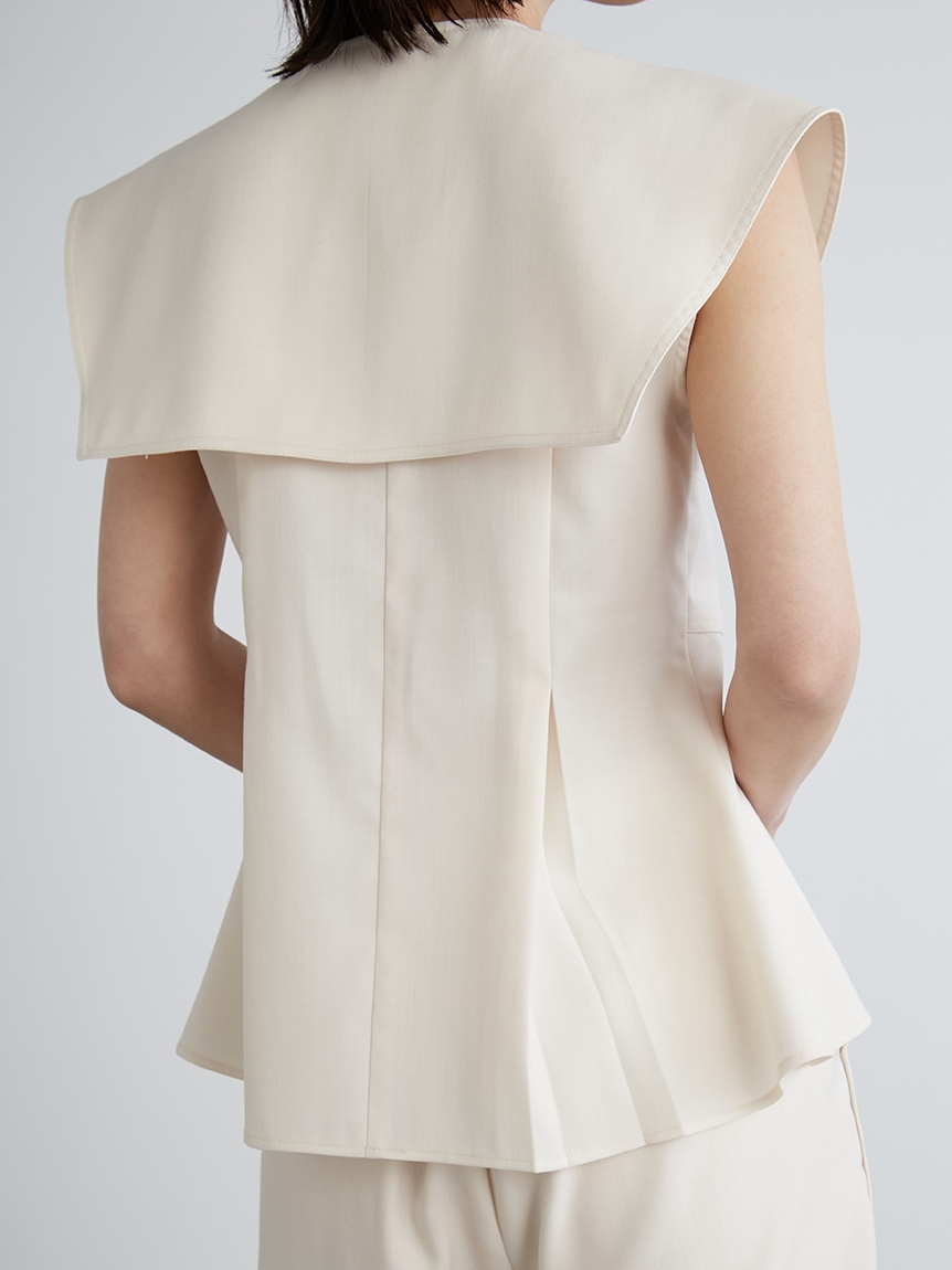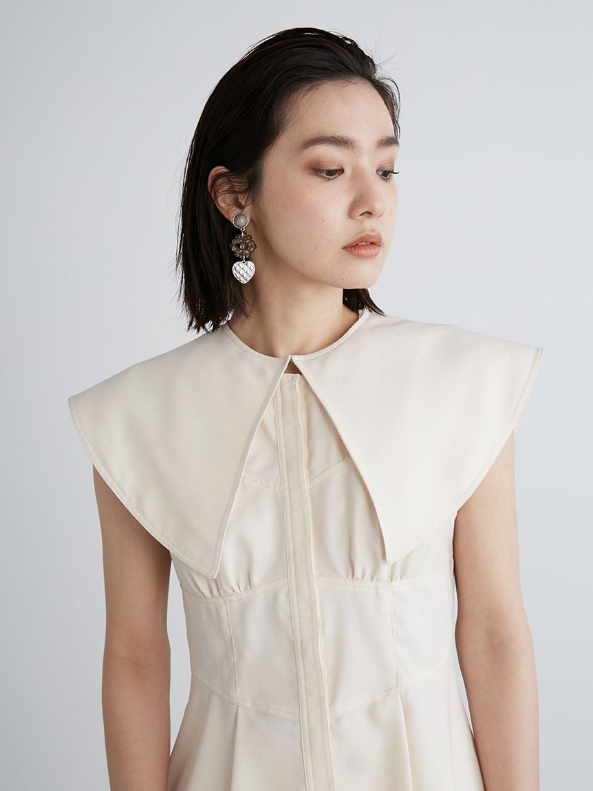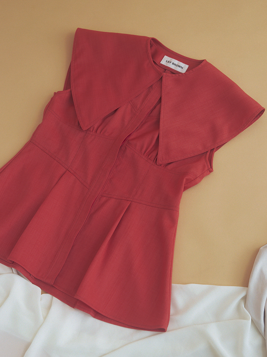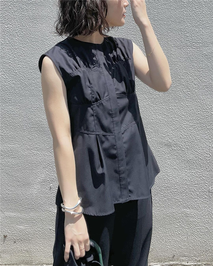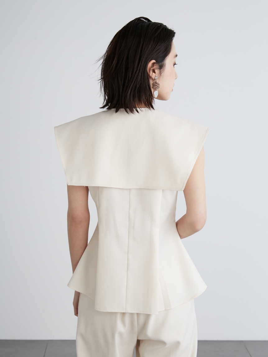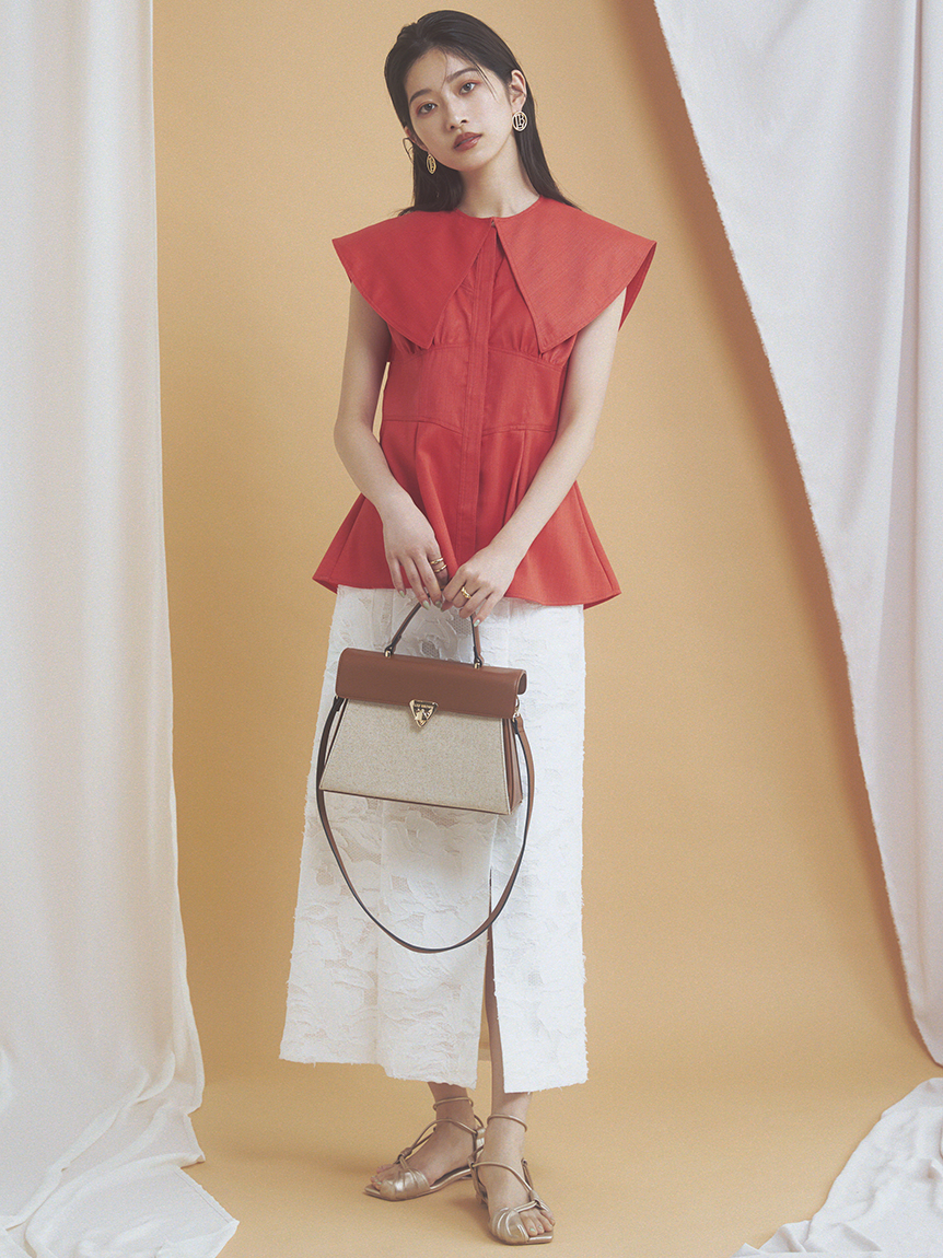 肩を覆うほどのビッグカラーが特徴的な、トレンド感溢れるノースリーブシャツ。身頃部分にビスチェディテールを取り入れステッチを効かせることで、女性らしいメリハリ感を演出しています。襟は取り外しできるので、気分やスタイリングに合わせて自由にアレンジが可能。同素材を用いたパンツ(LWFP222024)とセットアップでの着用がおススメです。