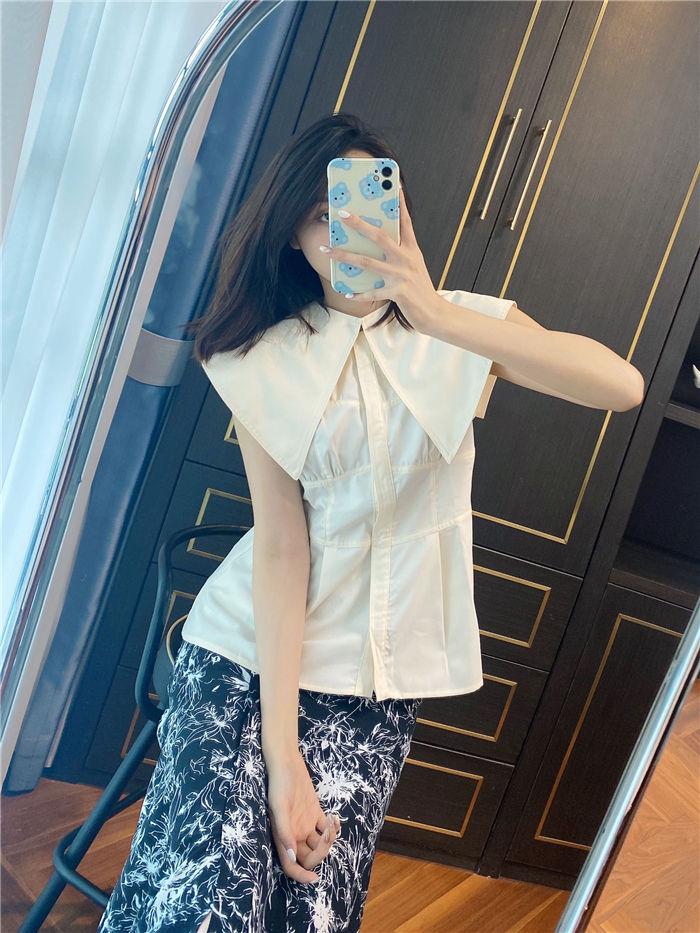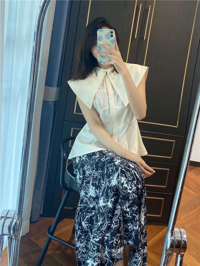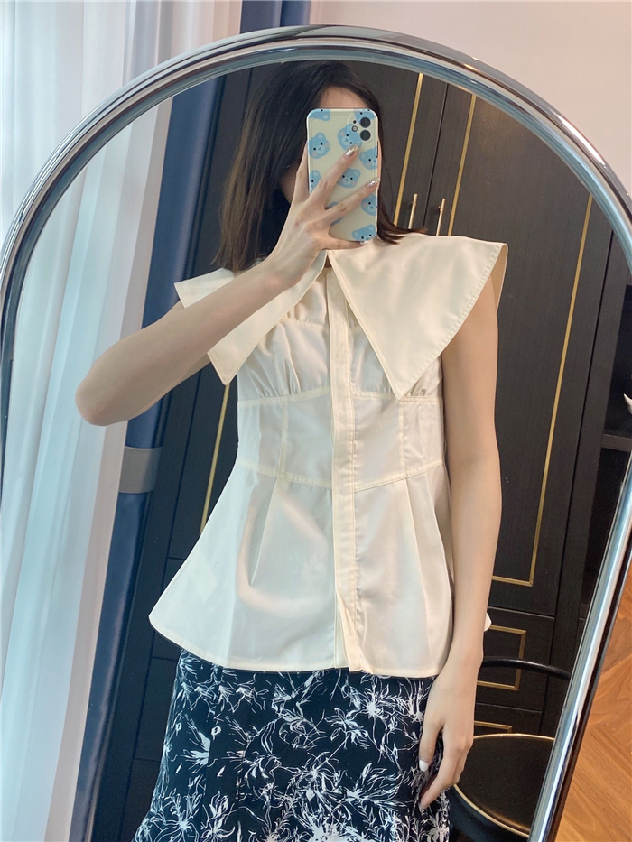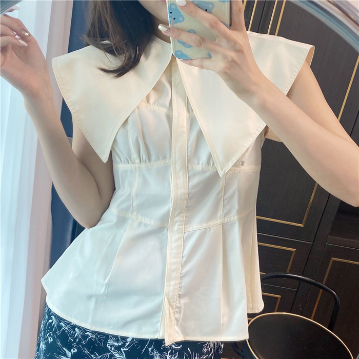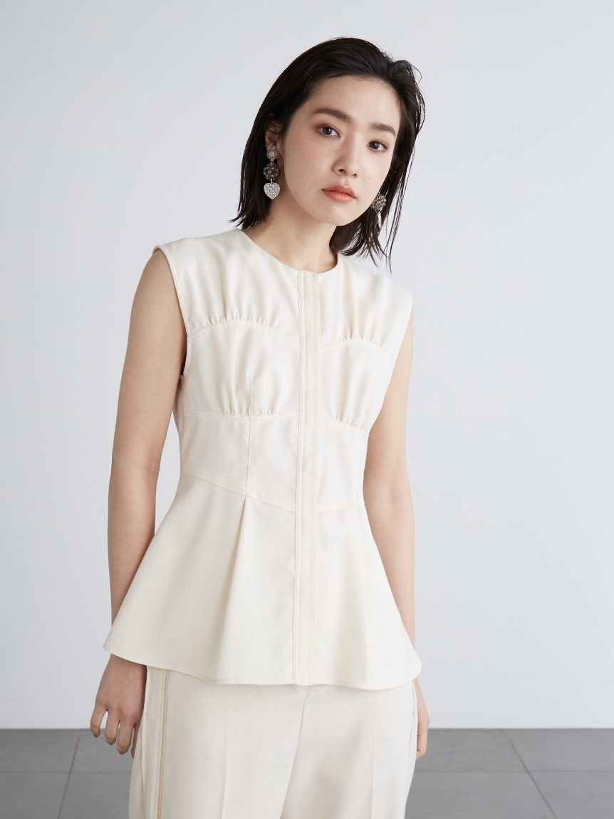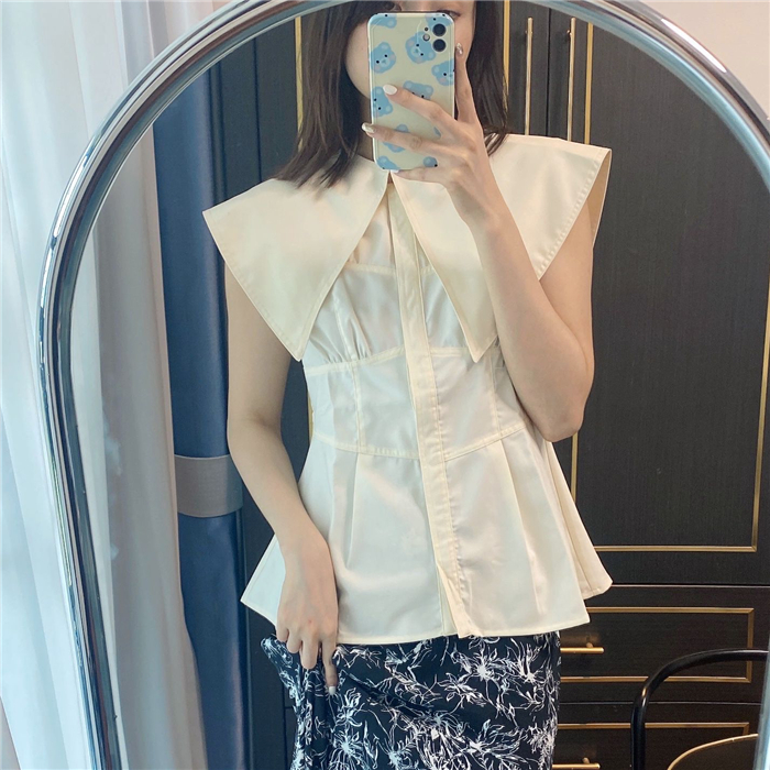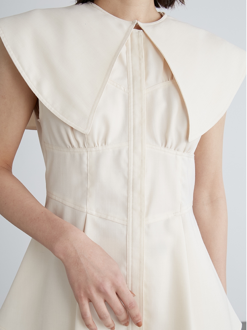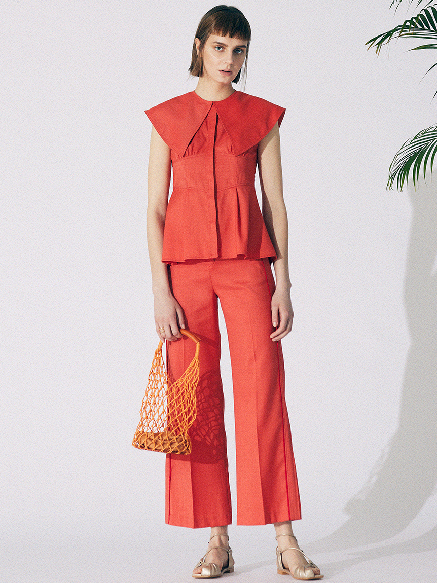 肩を覆うほどのビッグカラーが特徴的な、トレンド感溢れるノースリーブシャツ。身頃部分にビスチェディテールを取り入れステッチを効かせることで、女性らしいメリハリ感を演出しています。襟は取り外しできるので、気分やスタイリングに合わせて自由にアレンジが可能。同素材を用いたパンツ(LWFP222024)とセットアップでの着用がおススメです。