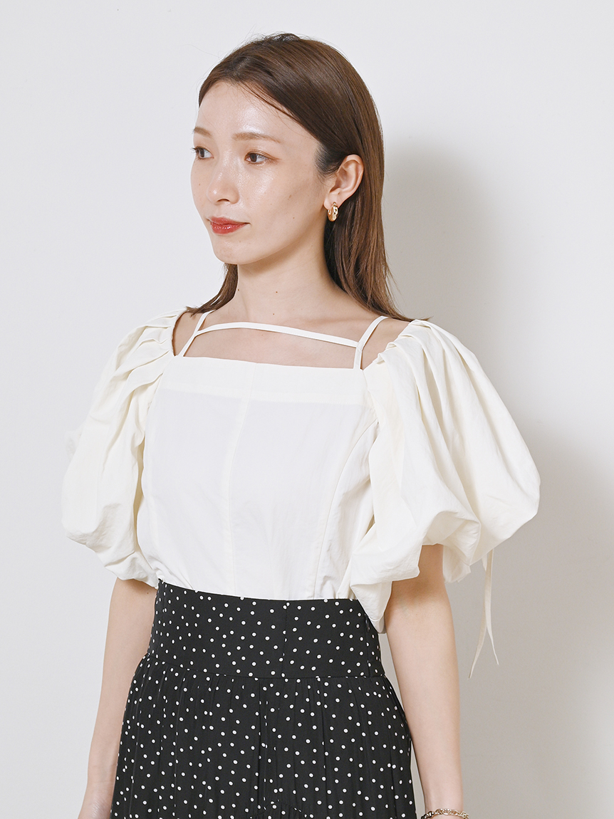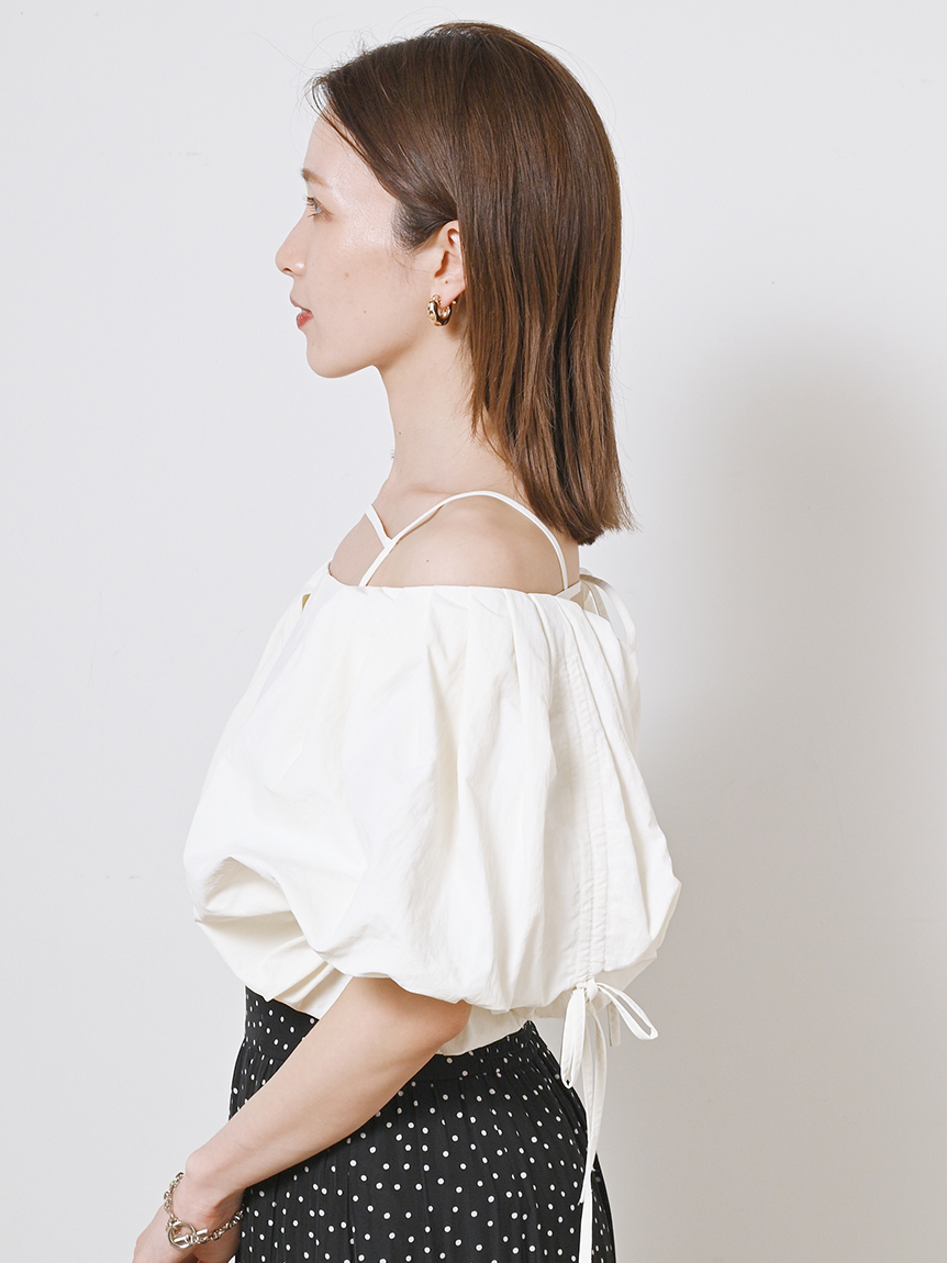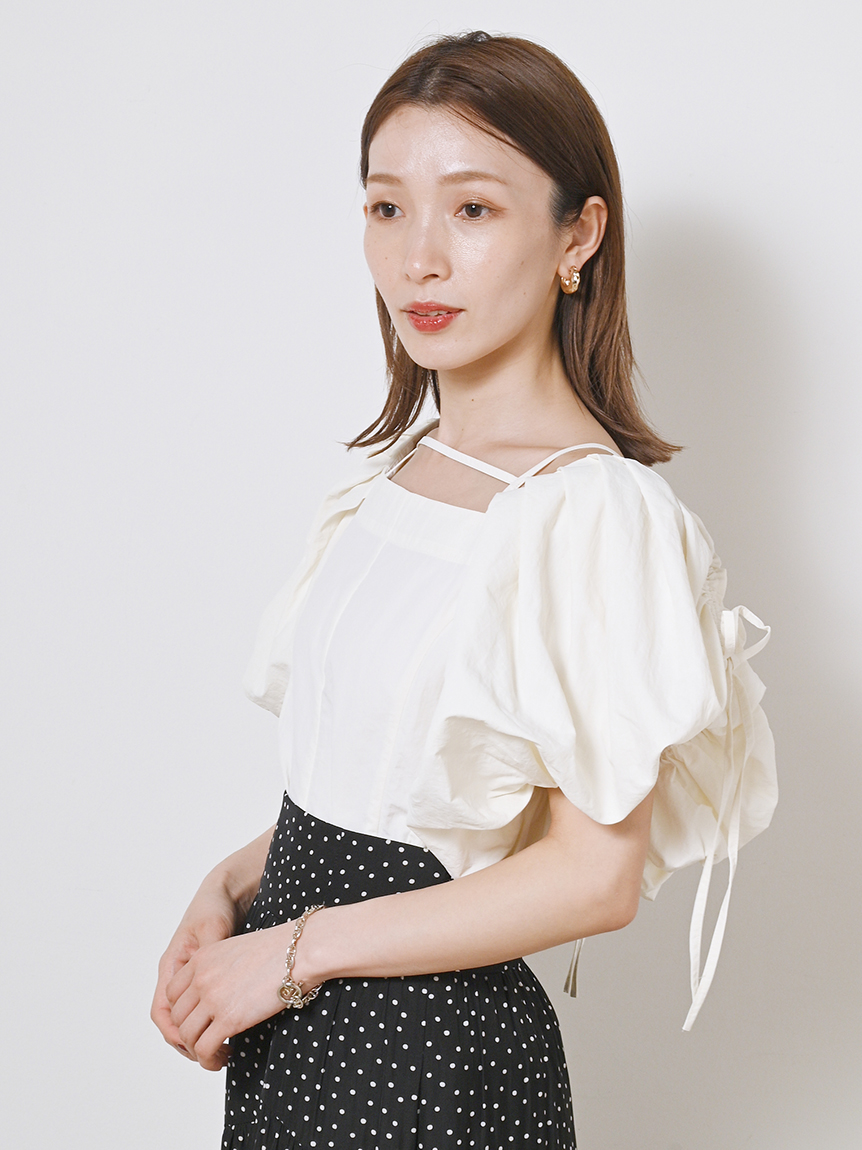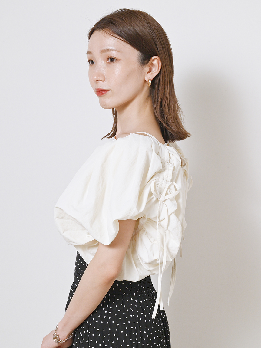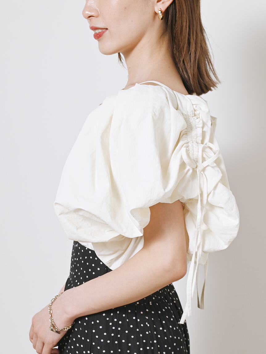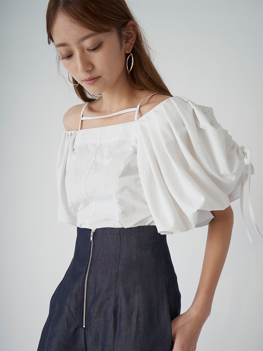 たっぷりとタックを施しボリューミーに仕上げたパフスリーブが印象的。モード感と女性らしさが相まったトレンドライクなブラウスが届きました。袖山にはドロストを備えているのでスリーブのフォルムはアレンジ可能。バックネックの紐の長さを調整することでオフショルにもできる2WAYデザインです。身頃はウエストをやや絞り、ペプラムライクなシルエットに。パンツともスカートとも相性が良く、様々なスタイリングに活躍してくれます。