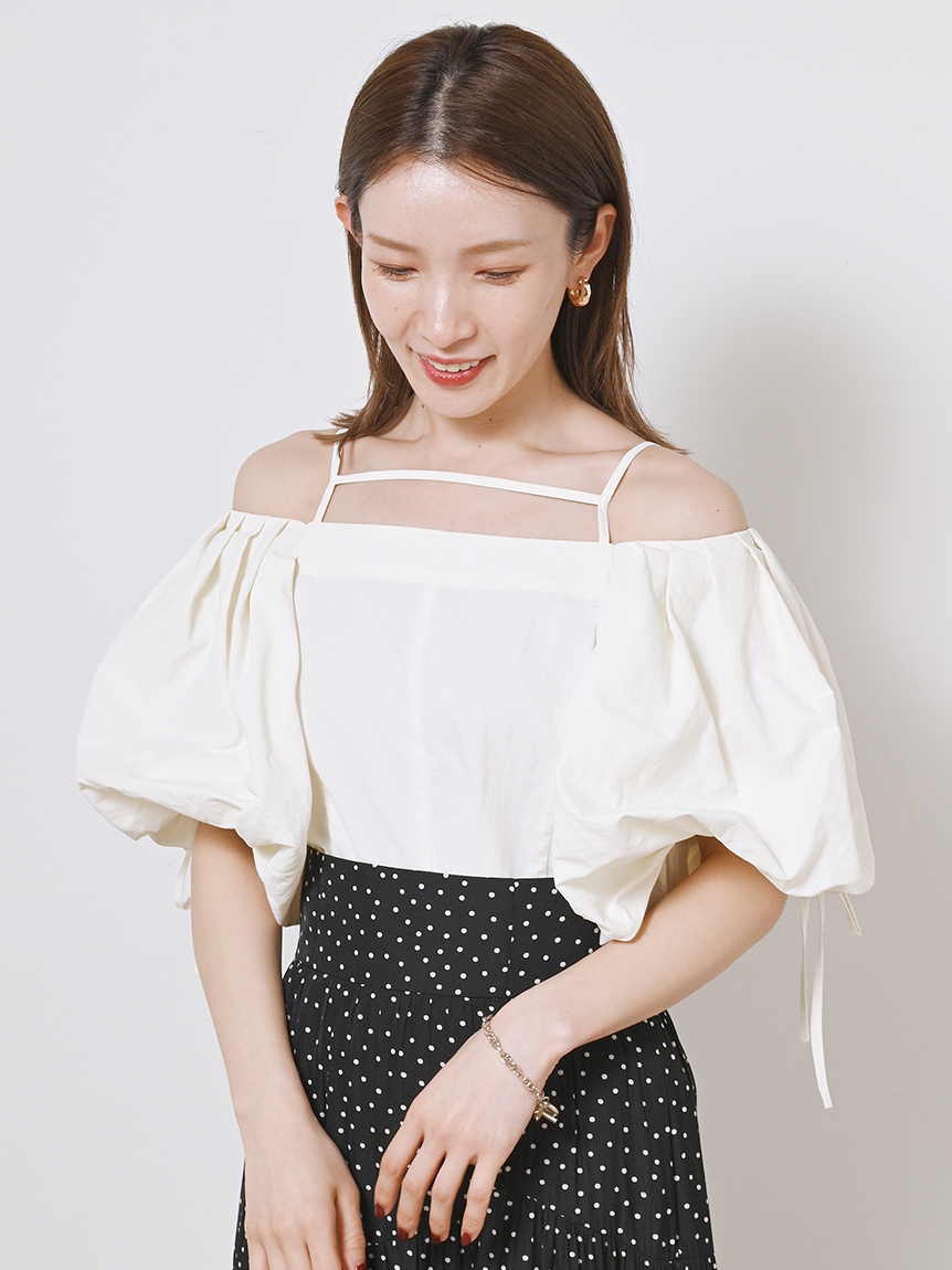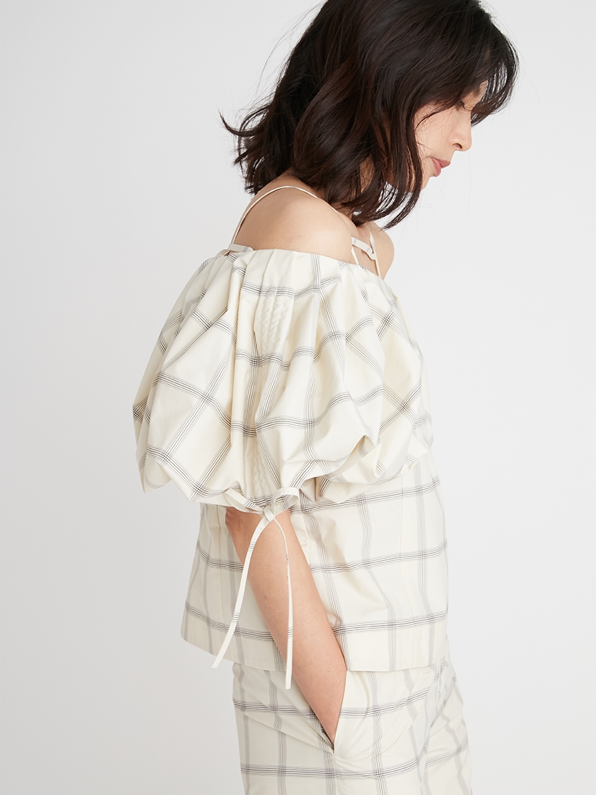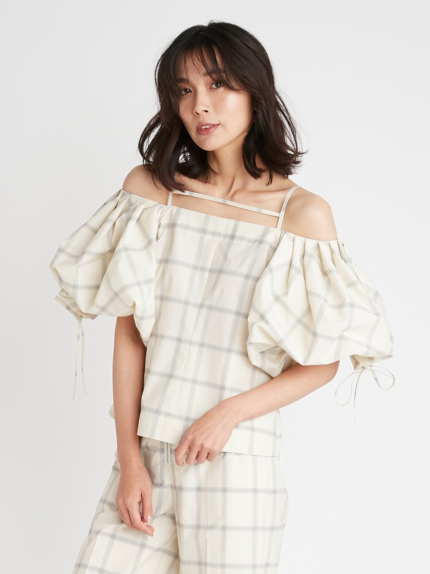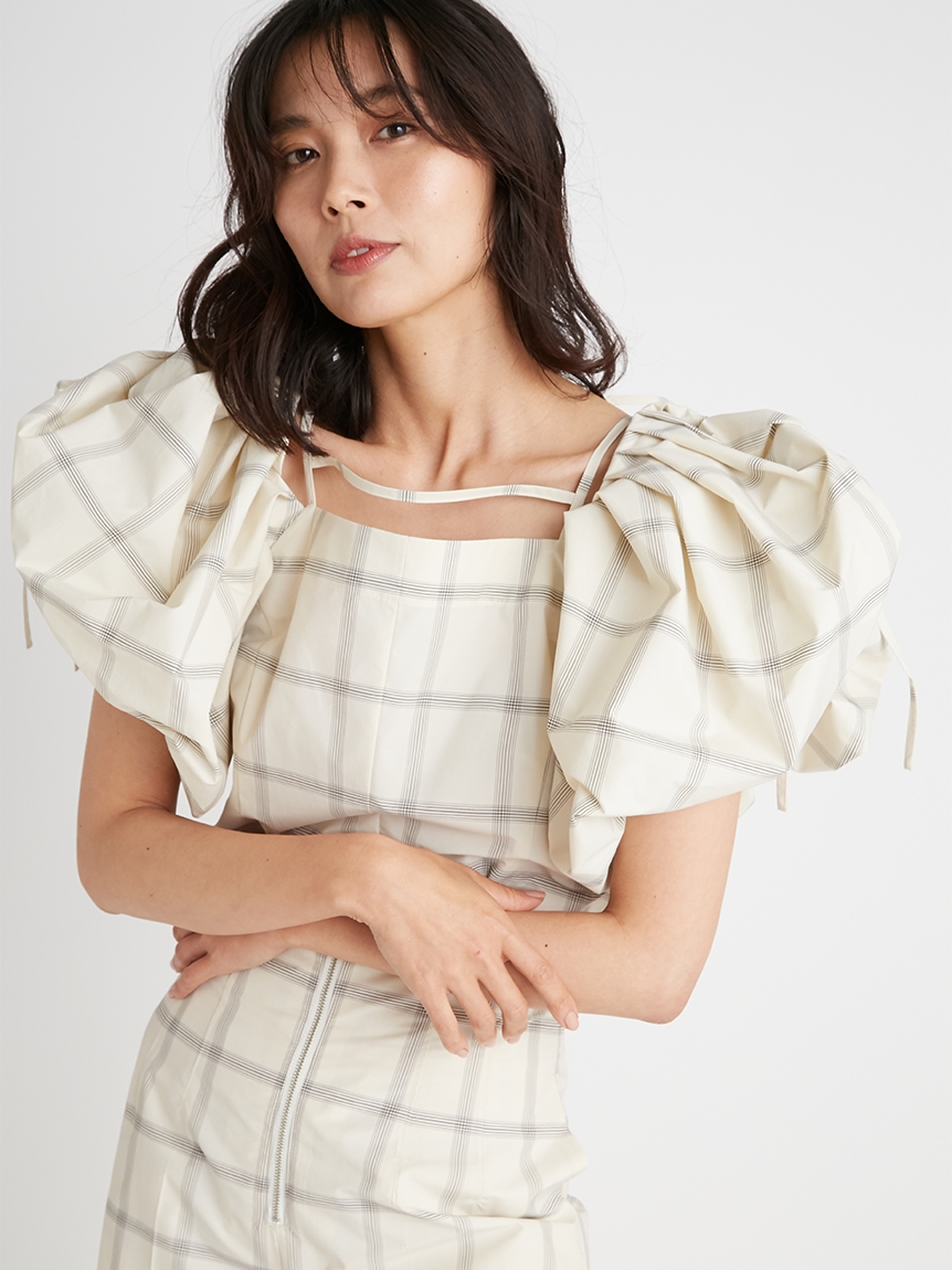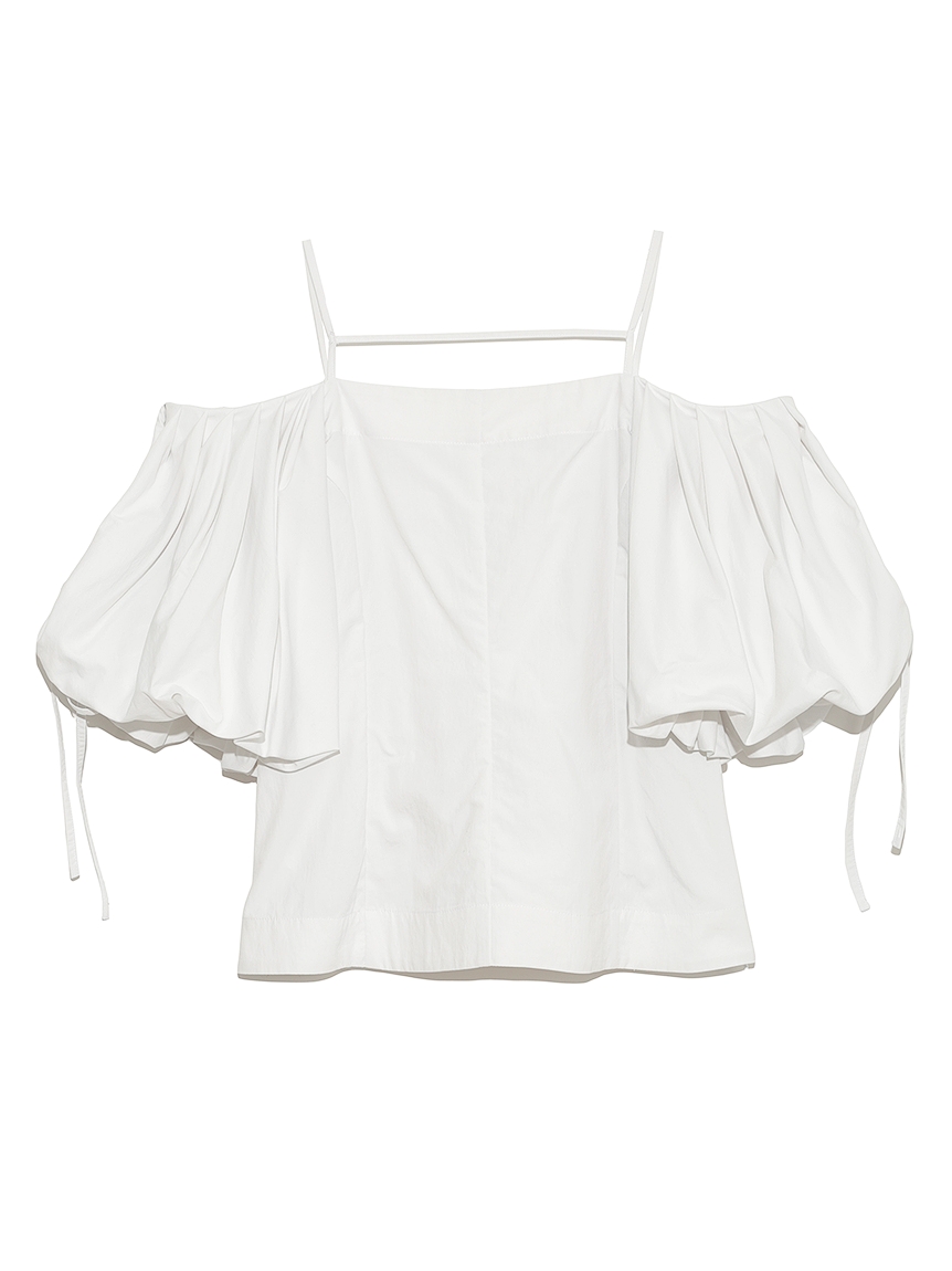 たっぷりとタックを施しボリューミーに仕上げたパフスリーブが印象的。モード感と女性らしさが相まったトレンドライクなブラウスが届きました。袖山にはドロストを備えているのでスリーブのフォルムはアレンジ可能。バックネックの紐の長さを調整することでオフショルにもできる2WAYデザインです。身頃はウエストをやや絞り、ペプラムライクなシルエットに。パンツともスカートとも相性が良く、様々なスタイリングに活躍してくれます。