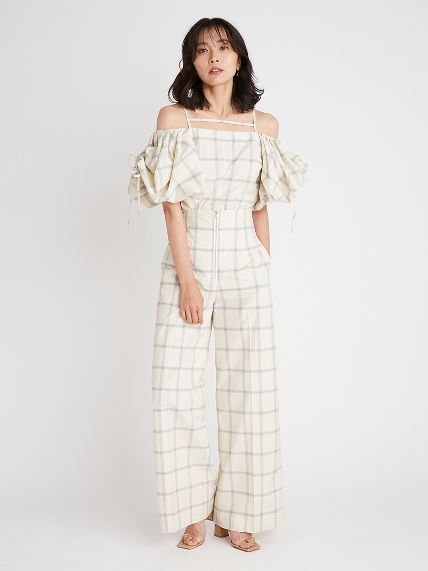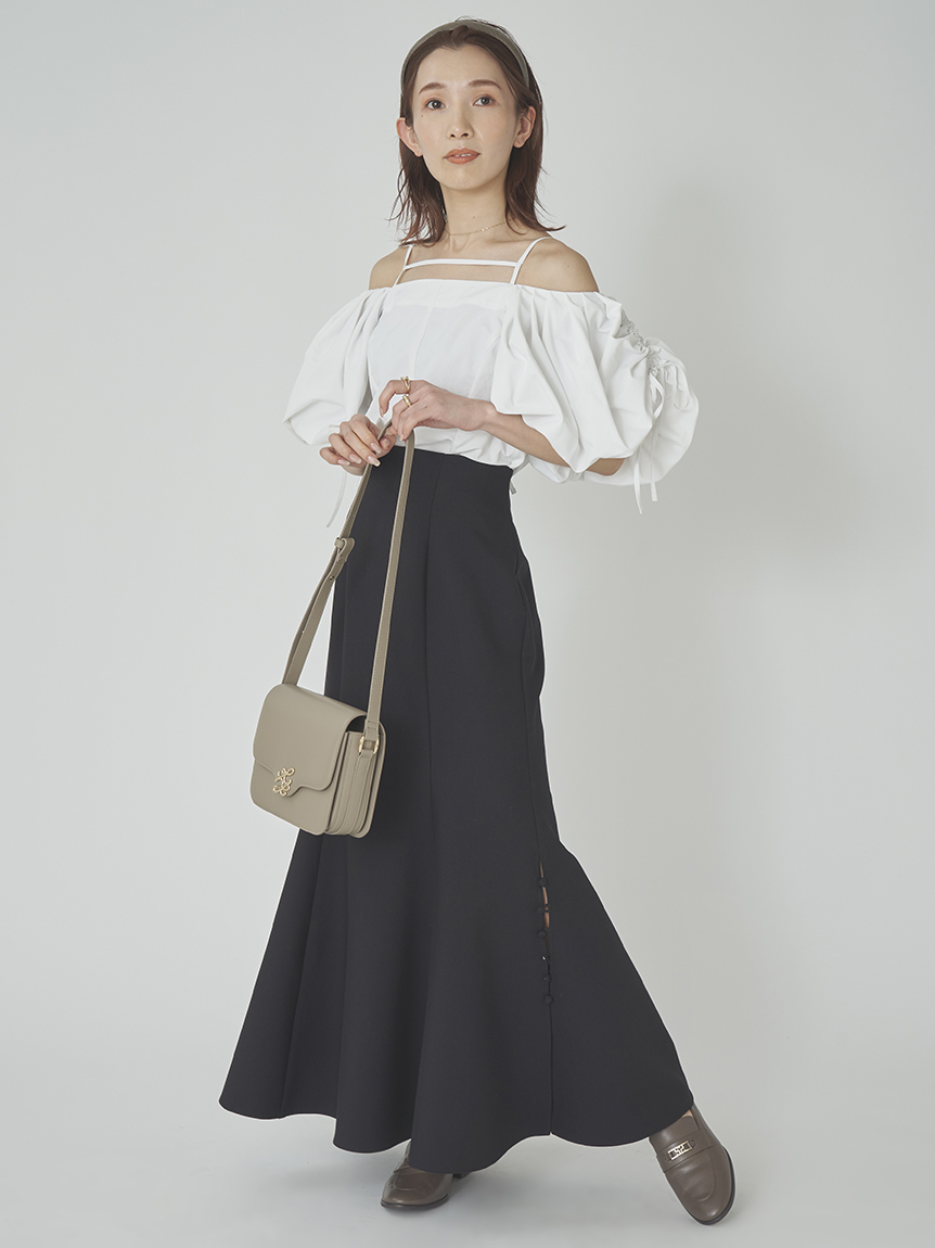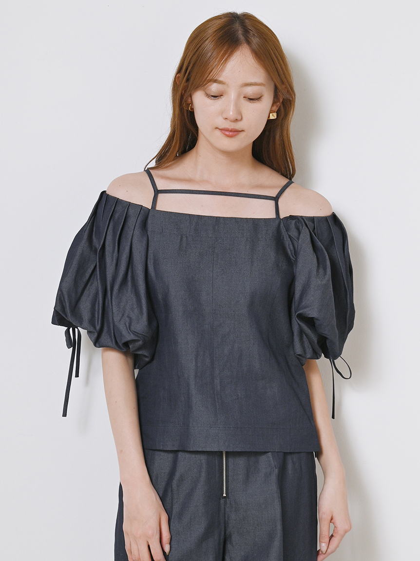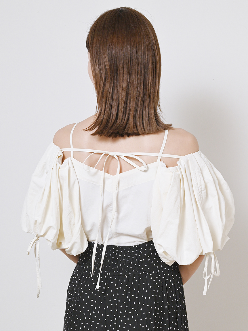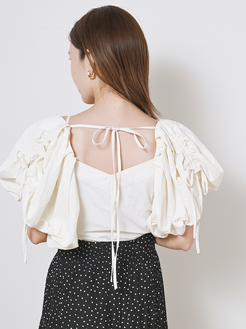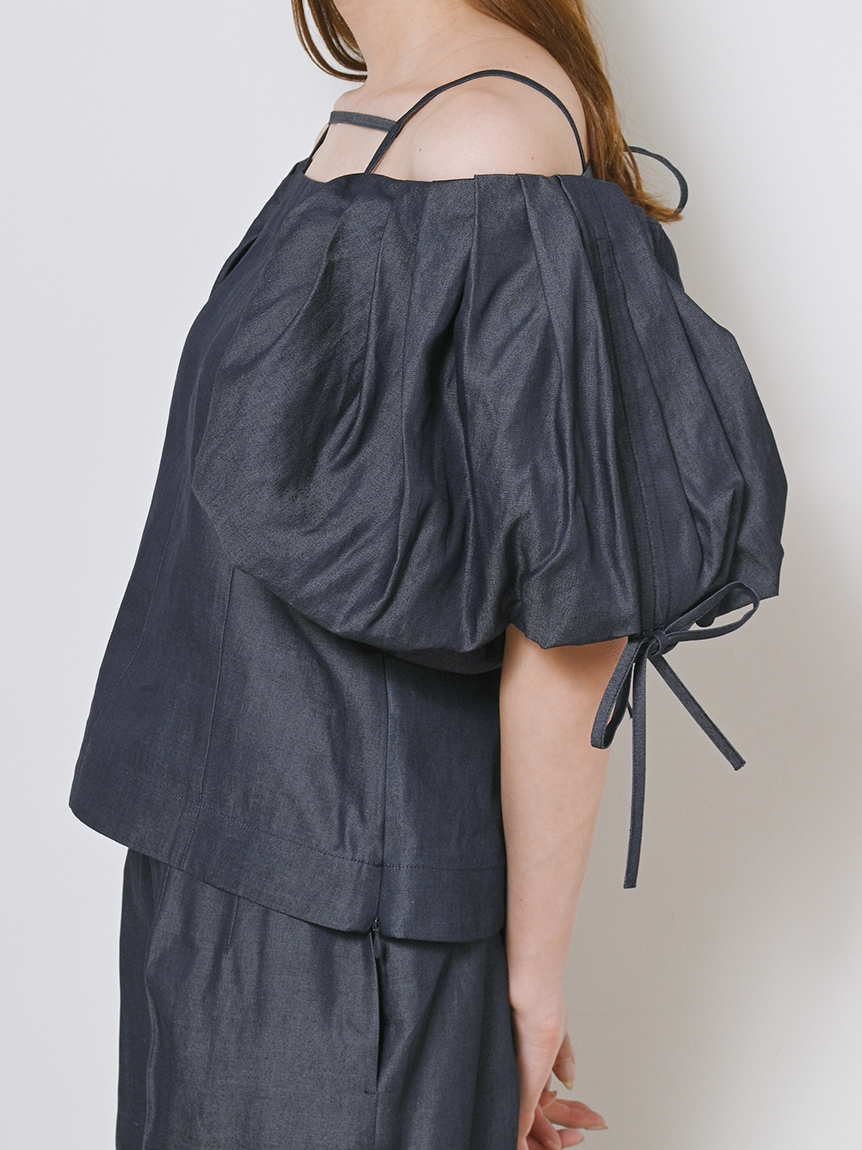 たっぷりとタックを施しボリューミーに仕上げたパフスリーブが印象的。モード感と女性らしさが相まったトレンドライクなブラウスが届きました。袖山にはドロストを備えているのでスリーブのフォルムはアレンジ可能。バックネックの紐の長さを調整することでオフショルにもできる2WAYデザインです。身頃はウエストをやや絞り、ペプラムライクなシルエットに。パンツともスカートとも相性が良く、様々なスタイリングに活躍してくれます。
