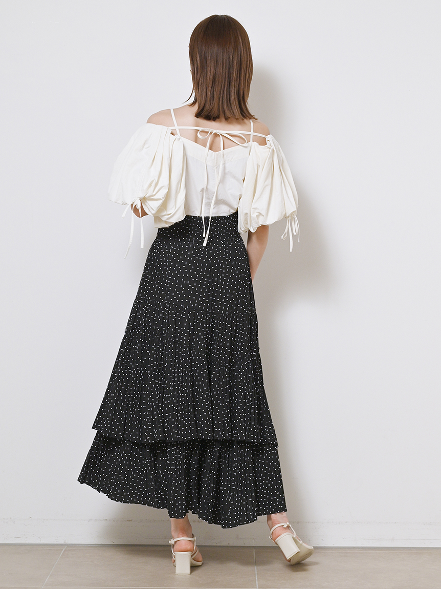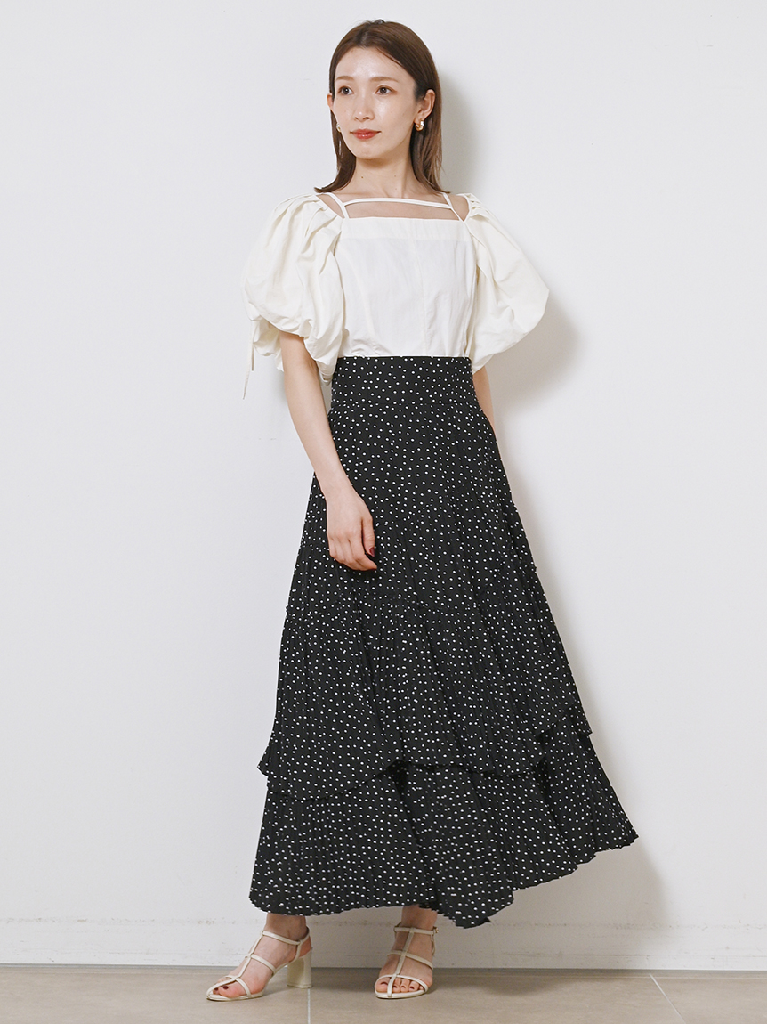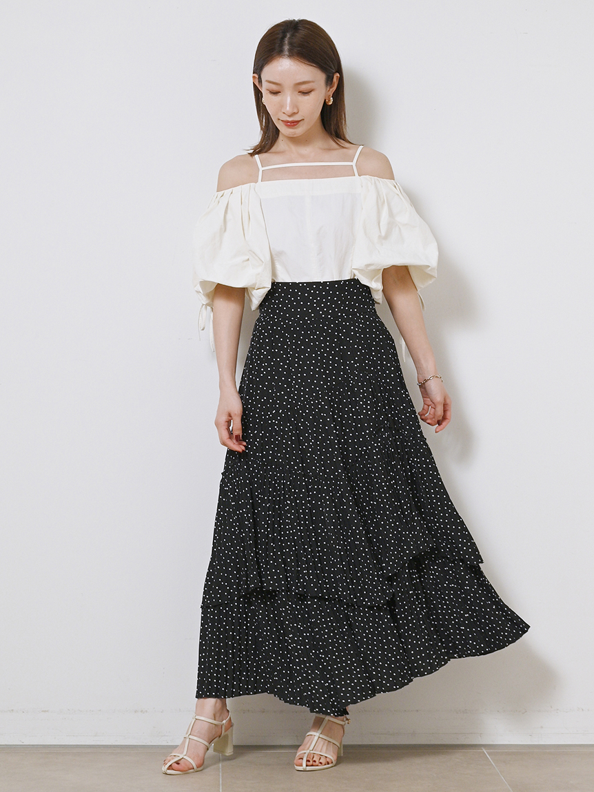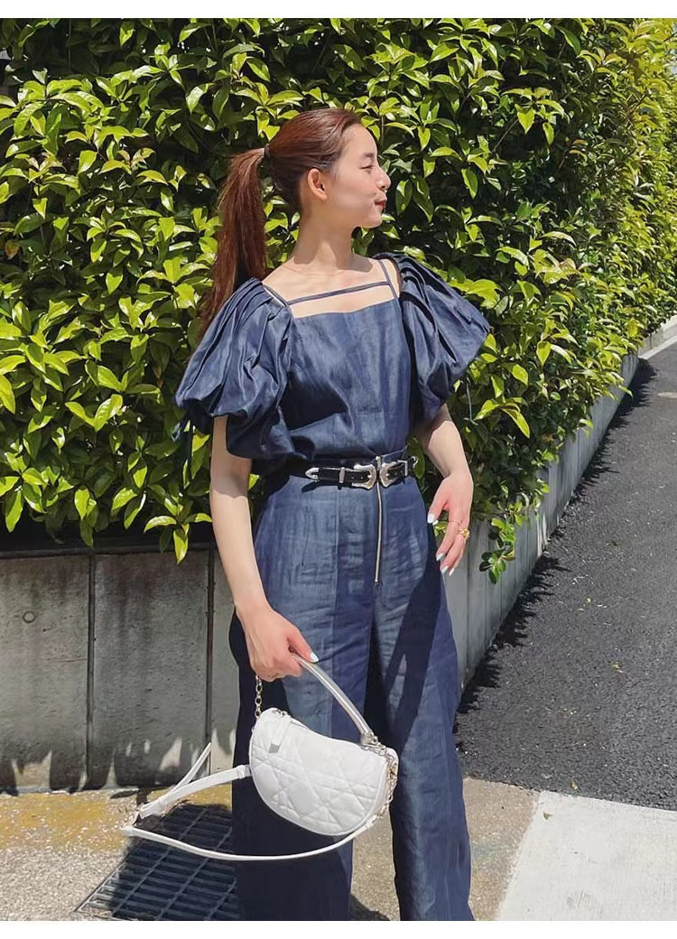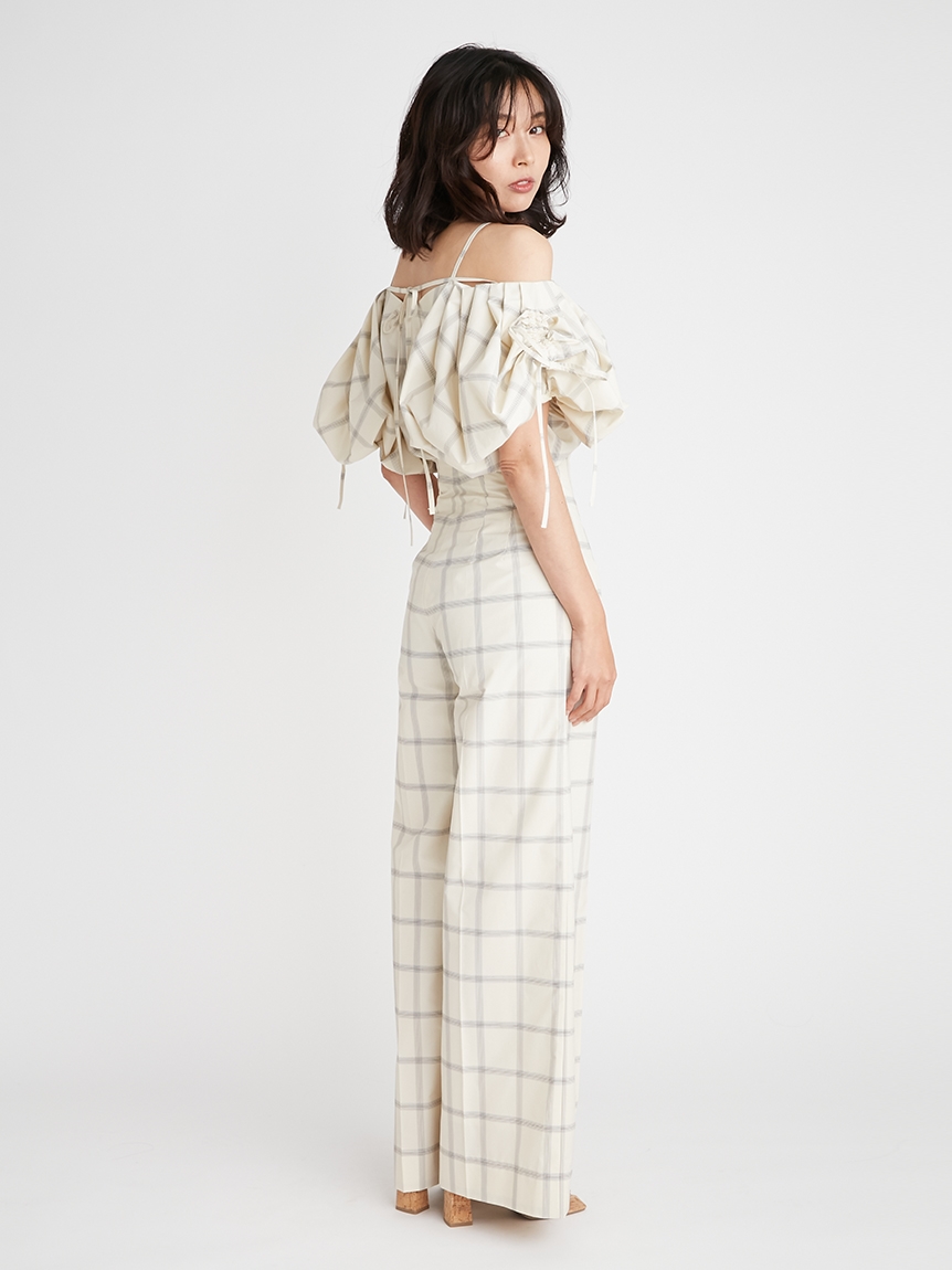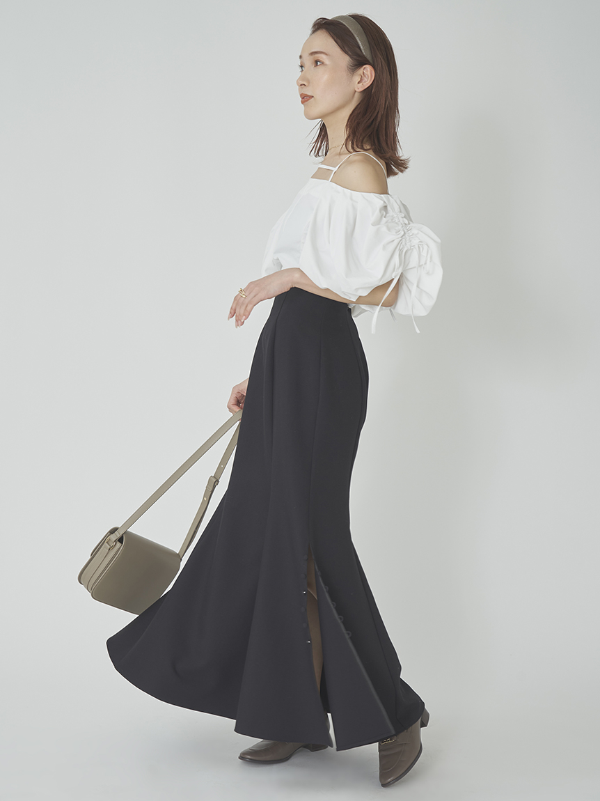 たっぷりとタックを施しボリューミーに仕上げたパフスリーブが印象的。モード感と女性らしさが相まったトレンドライクなブラウスが届きました。袖山にはドロストを備えているのでスリーブのフォルムはアレンジ可能。バックネックの紐の長さを調整することでオフショルにもできる2WAYデザインです。身頃はウエストをやや絞り、ペプラムライクなシルエットに。パンツともスカートとも相性が良く、様々なスタイリングに活躍してくれます。