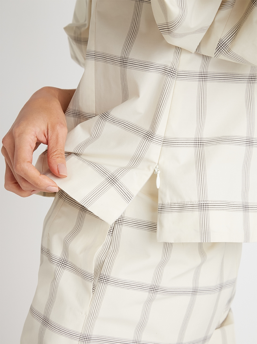 無地のホワイトにはリサイクルナイロン、甘くなり過ぎない格子柄のチェックはリサイクルポリ、インディゴは薄手のデニム素材を使用。リサイクルナイロンは、生産時に発生する繊維廃棄物から再生されたナイロンで、ナイロンの特徴である軽さと耐久性・強度を保ち、捨てられてしまう物を原料に新しく生まれ変わった、環境と人の未来をつなぐサステナブルファブリックです。