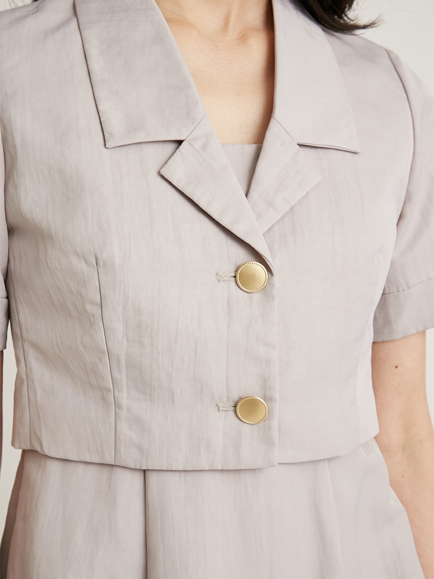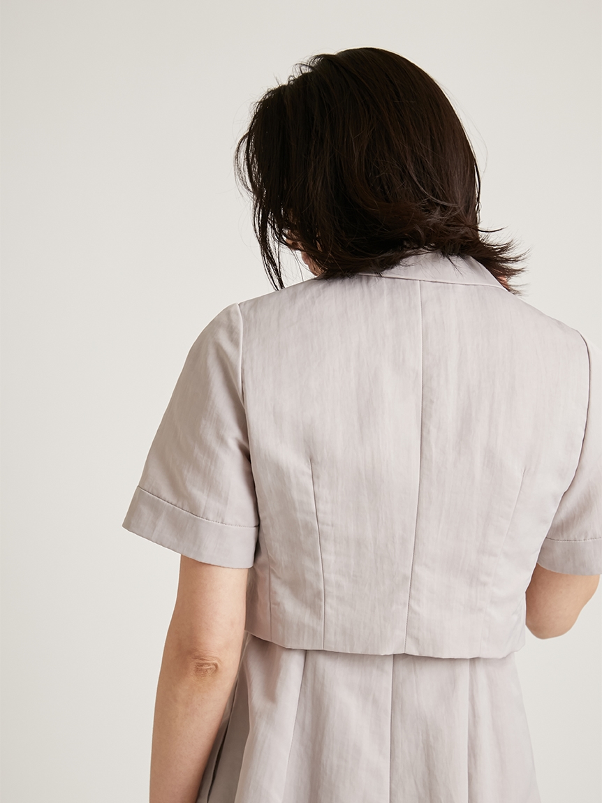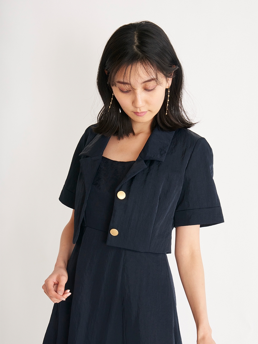 ショート丈のコンパクトなシルエットでトレンドライクに仕上げたハーフスリーブジャケット。小さめの襟や金ボタンを採用したきちんと感のあるルックスが、大人の洗練ムードを高めてくれます。同素材を用いたワンピース(SWFO222047)とのセットアップスタイルがオススメ。品の良さを感じさせるコーディネートで、オケージョンシーンやフォーマルな場でも活躍してくれます。