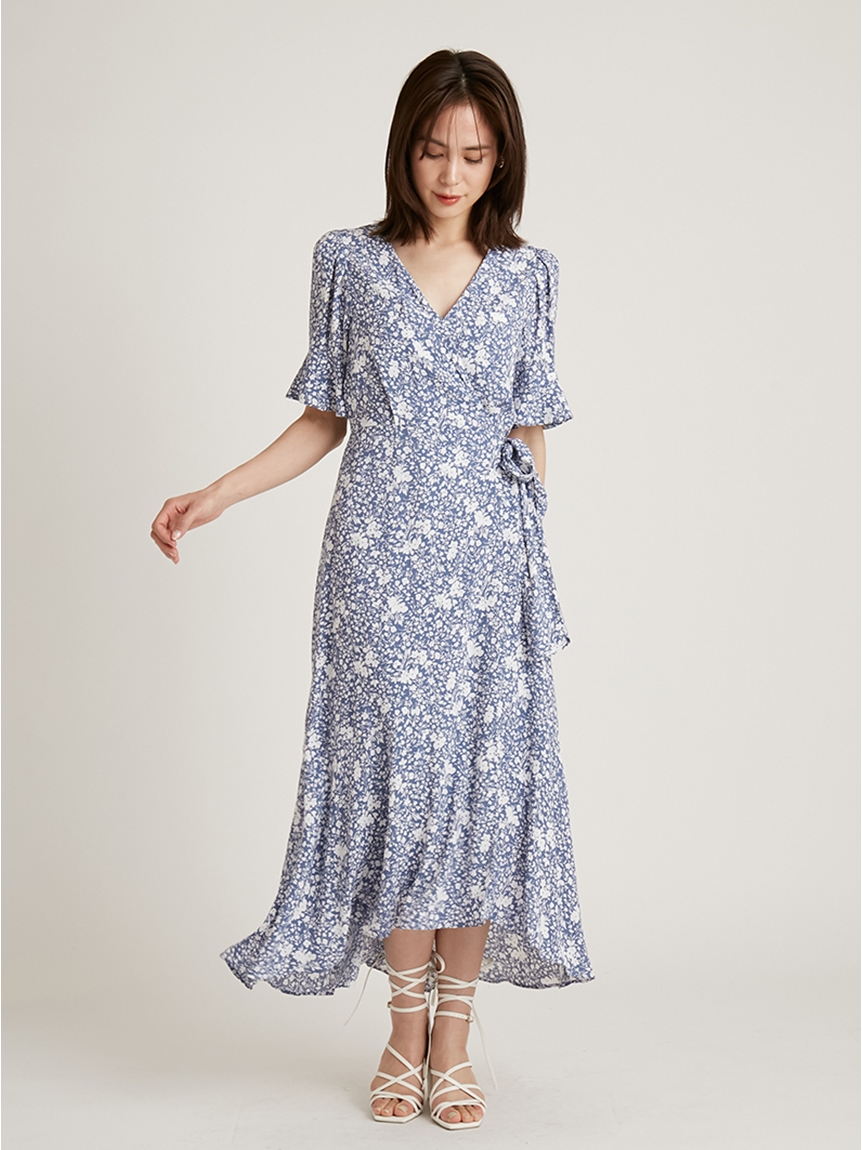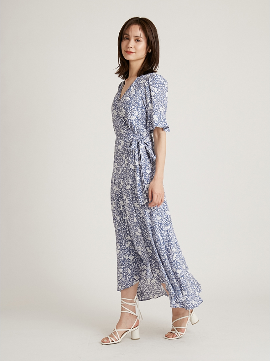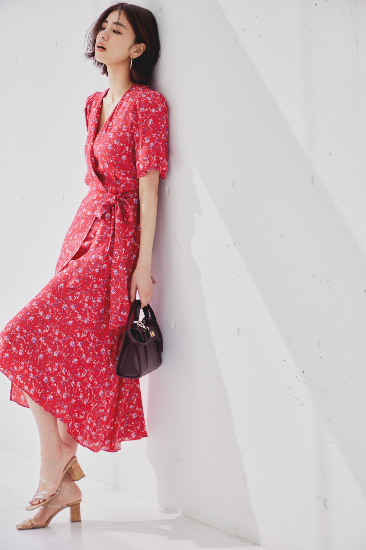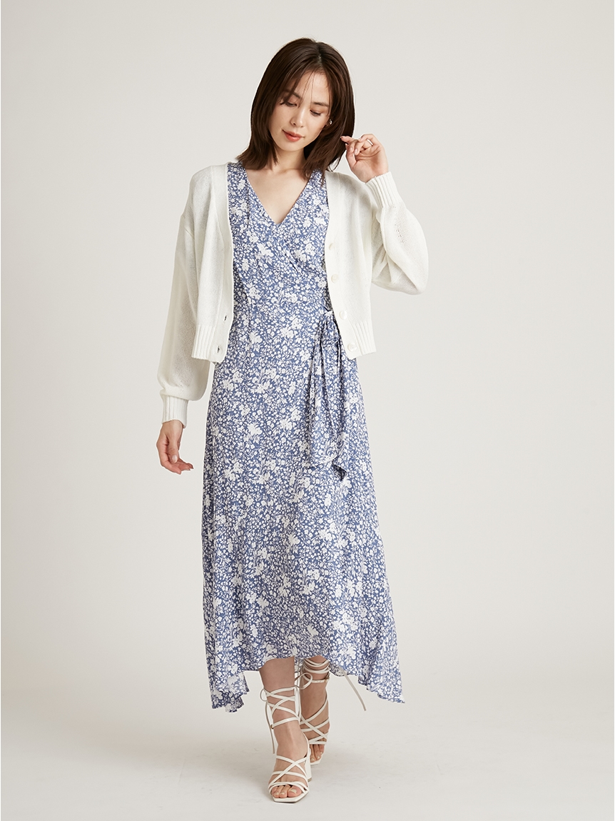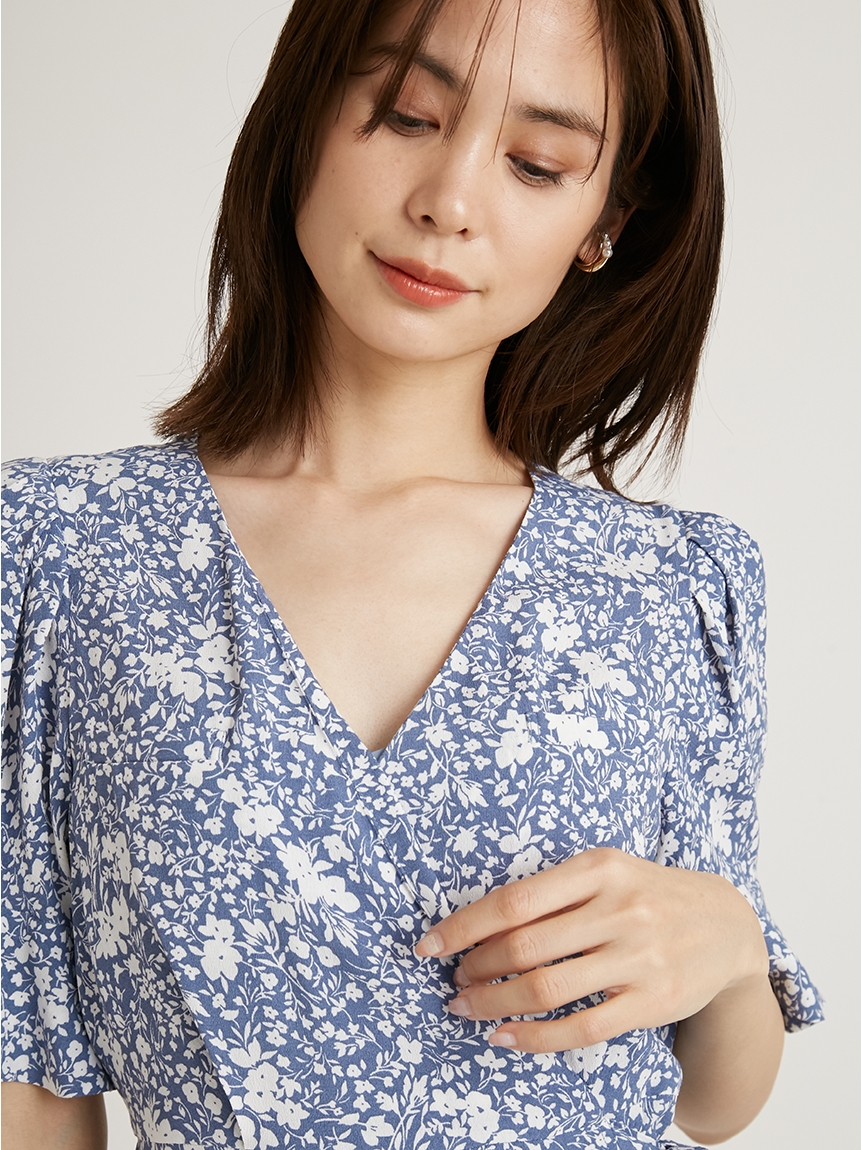 サイドでリボンを結んだカシュクールデザインで大人な雰囲気に仕上げたワンピース。切り替えを入れくびれを作った丸みのあるスリーブが愛らしさをぐっと高めています。上品に広がるナローマーメイドシルエットは、バックウエストにゴムギャザーを効かせることでスタイルアップ効果◎。存在感たっぷりのプリントなので1枚でもサマになり、夏らしいスタイリングが完成します。