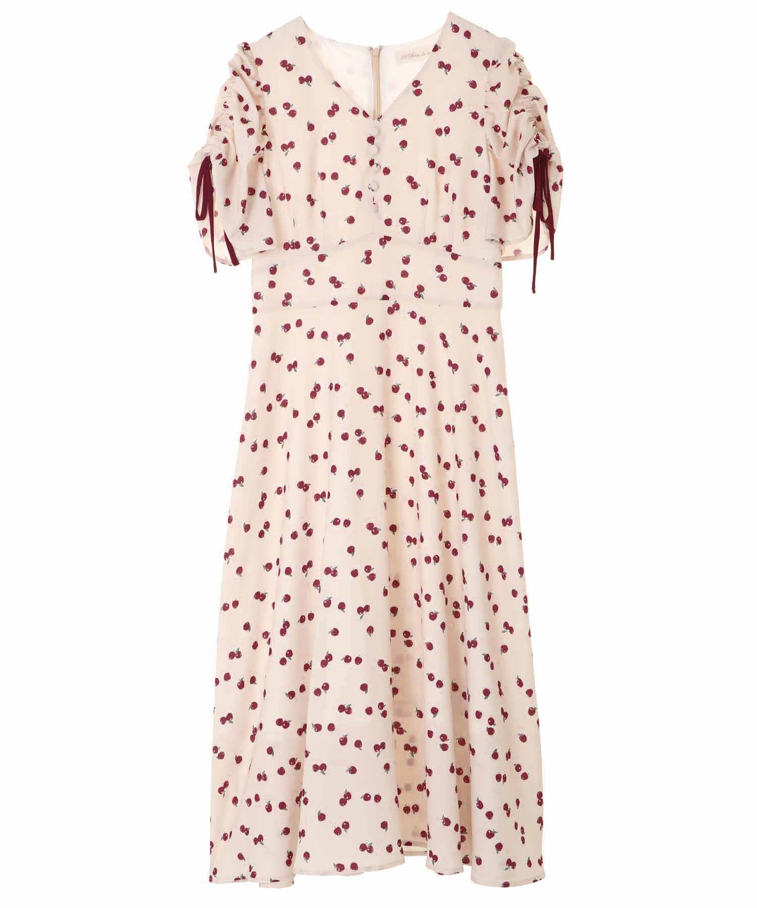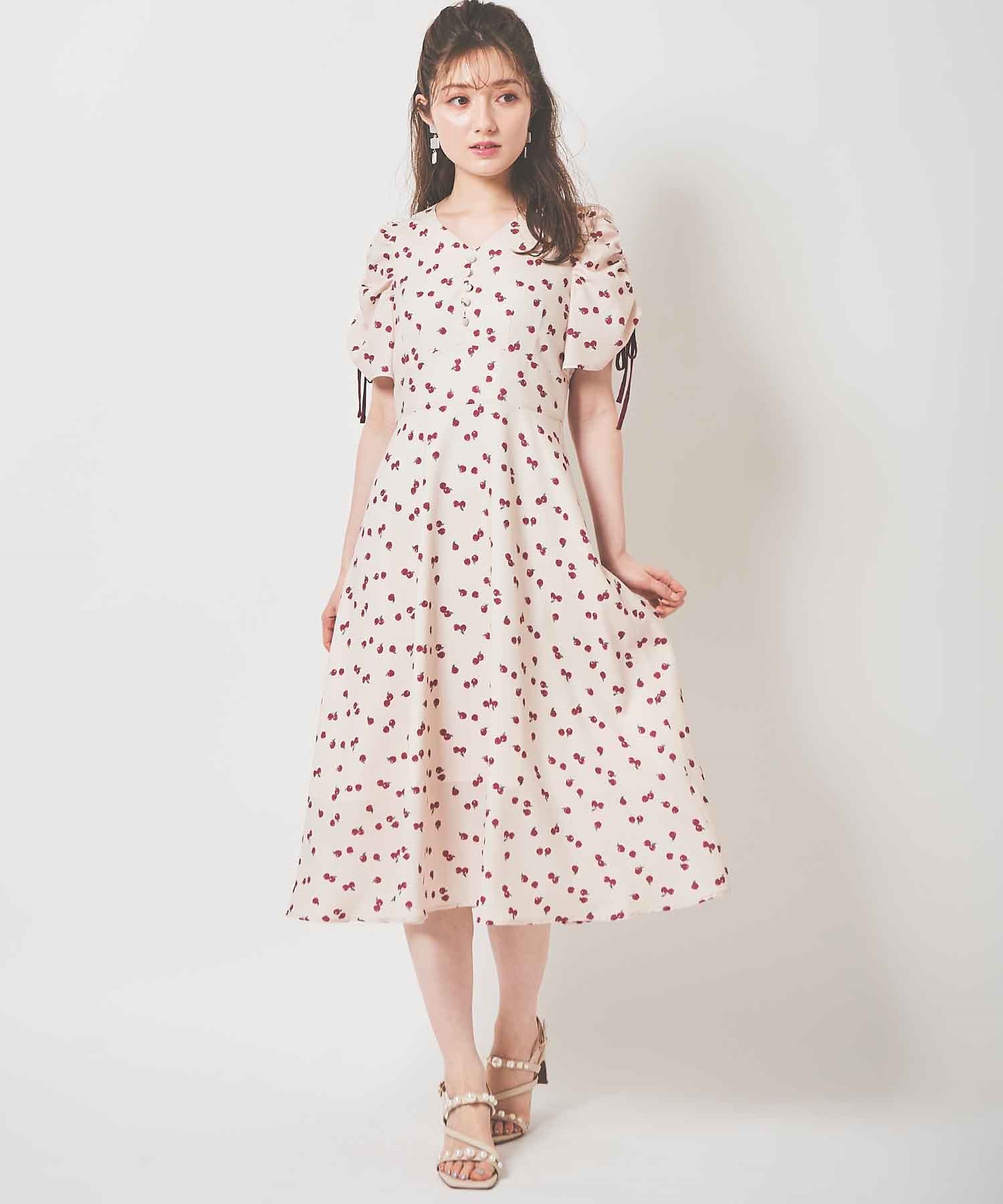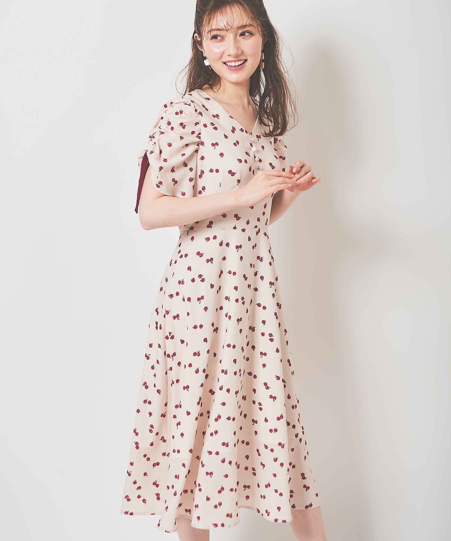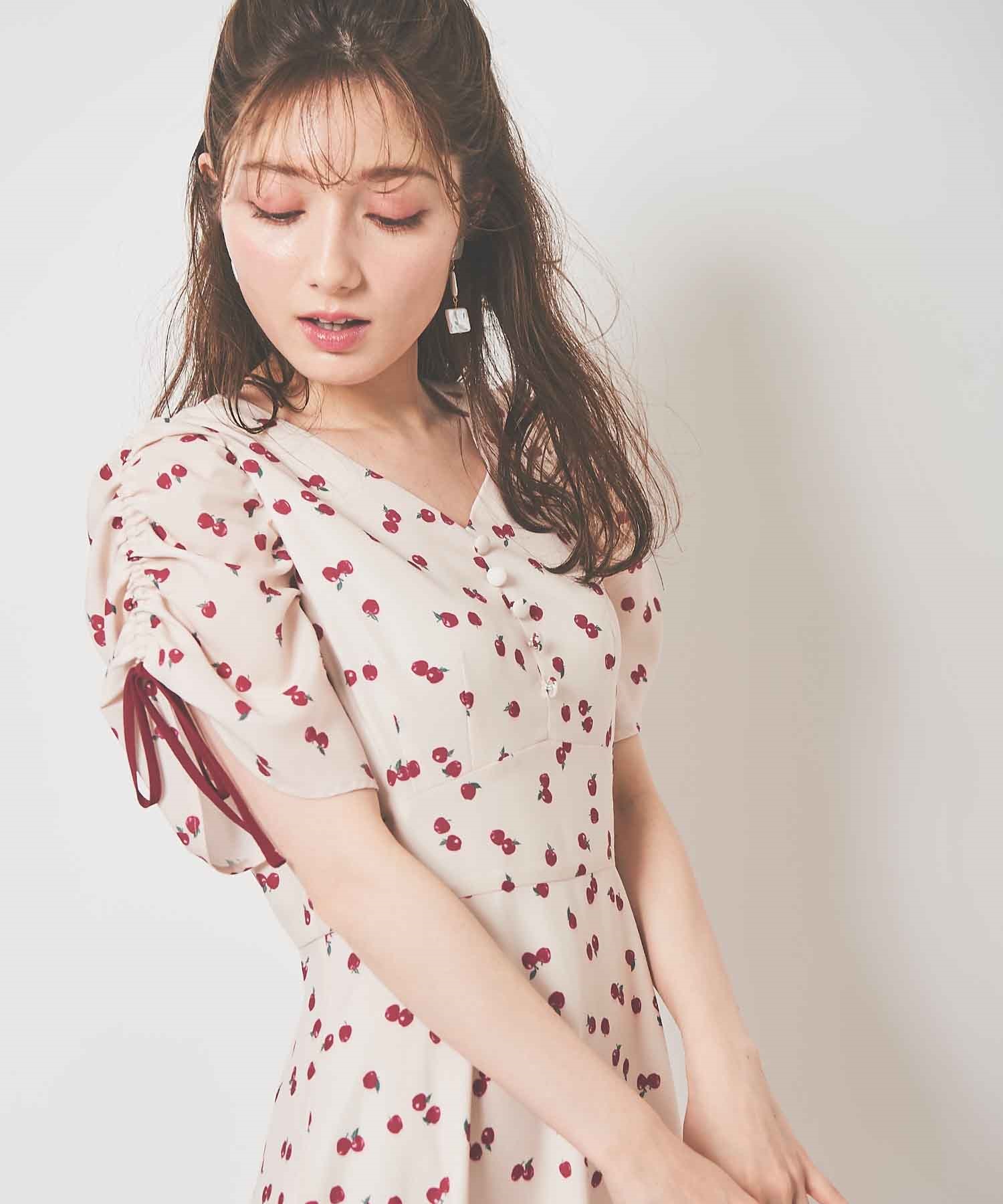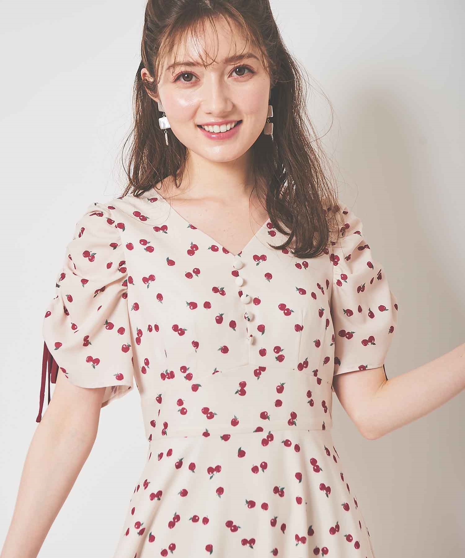 ランダムなリンゴ柄がドット柄見えするPOPなプリントワンピース。袖山シャーリングで袖口にはリンゴと同色のリボン付き。ハイウエスト切り替えでスタイルよく見せてくれる、夏らしく華やかなワンピース。