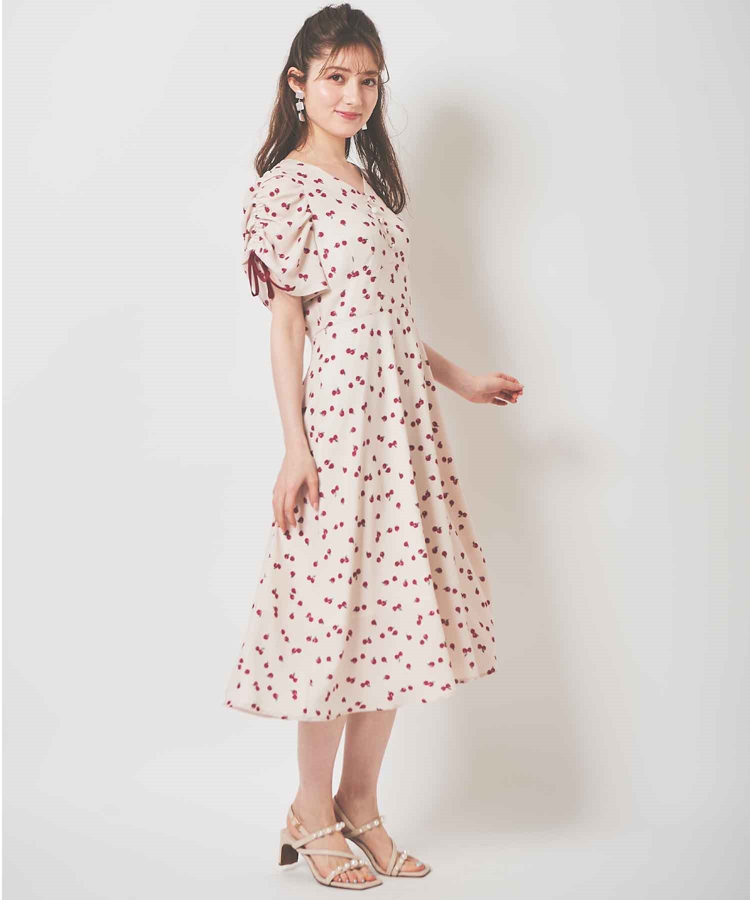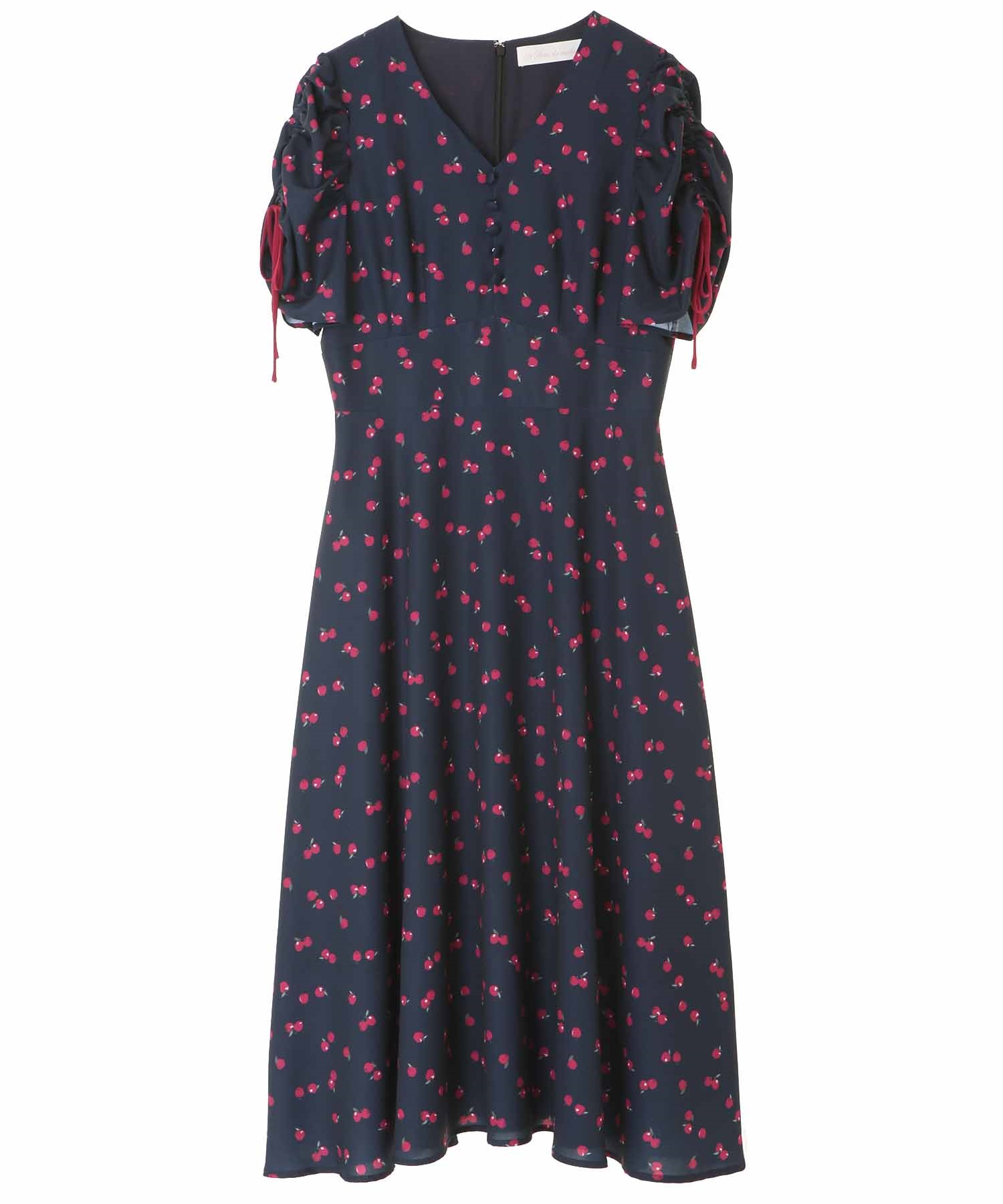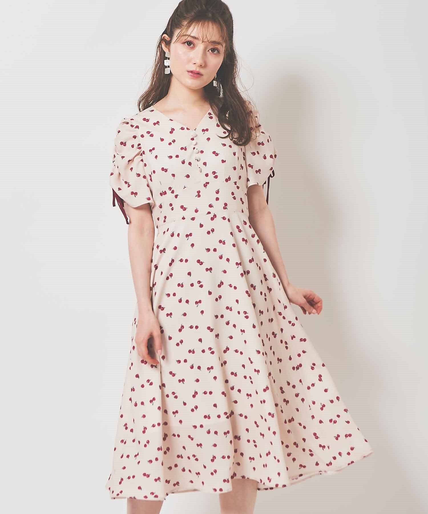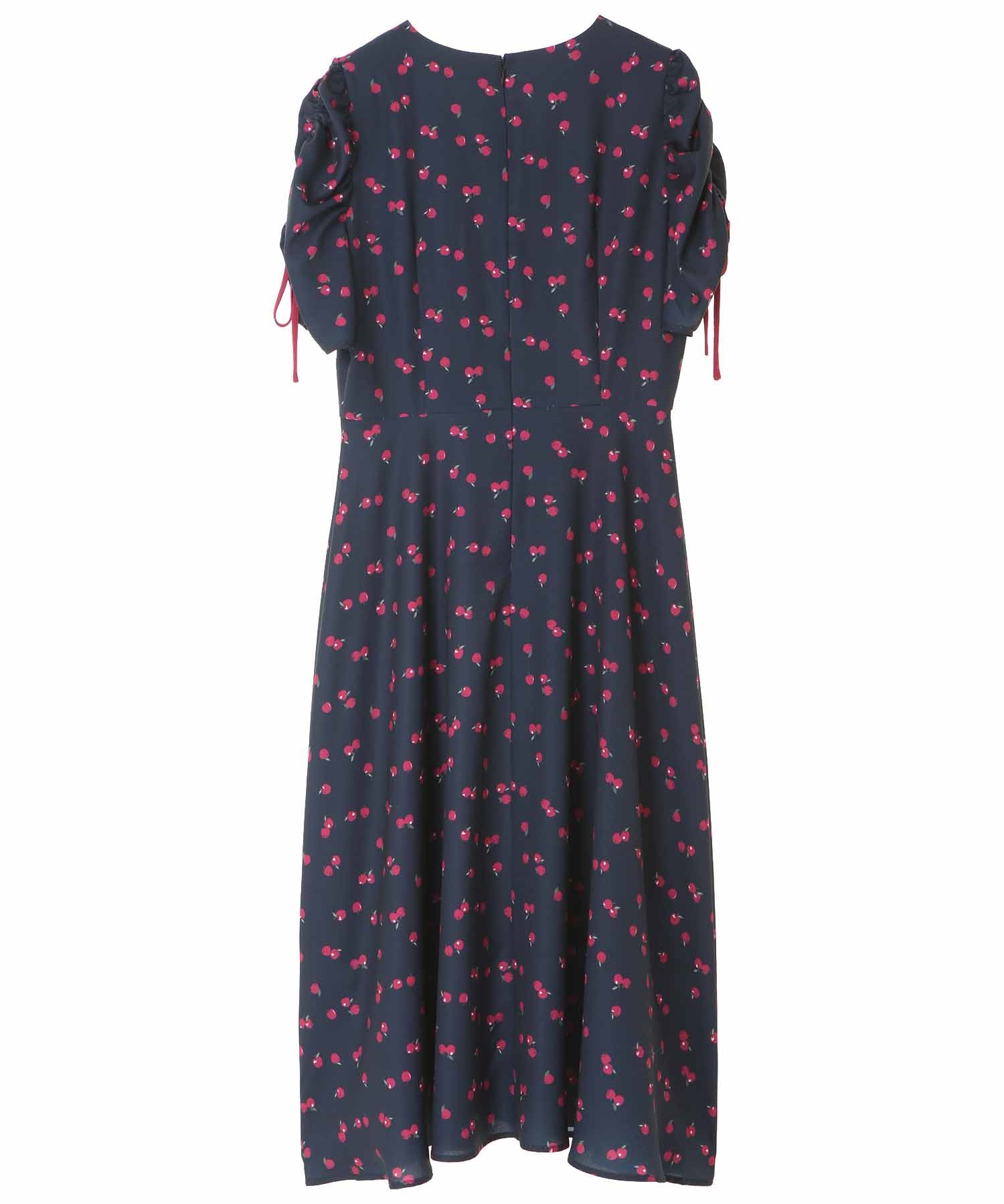 ランダムなリンゴ柄がドット柄見えするPOPなプリントワンピース。袖山シャーリングで袖口にはリンゴと同色のリボン付き。ハイウエスト切り替えでスタイルよく見せてくれる、夏らしく華やかなワンピース。