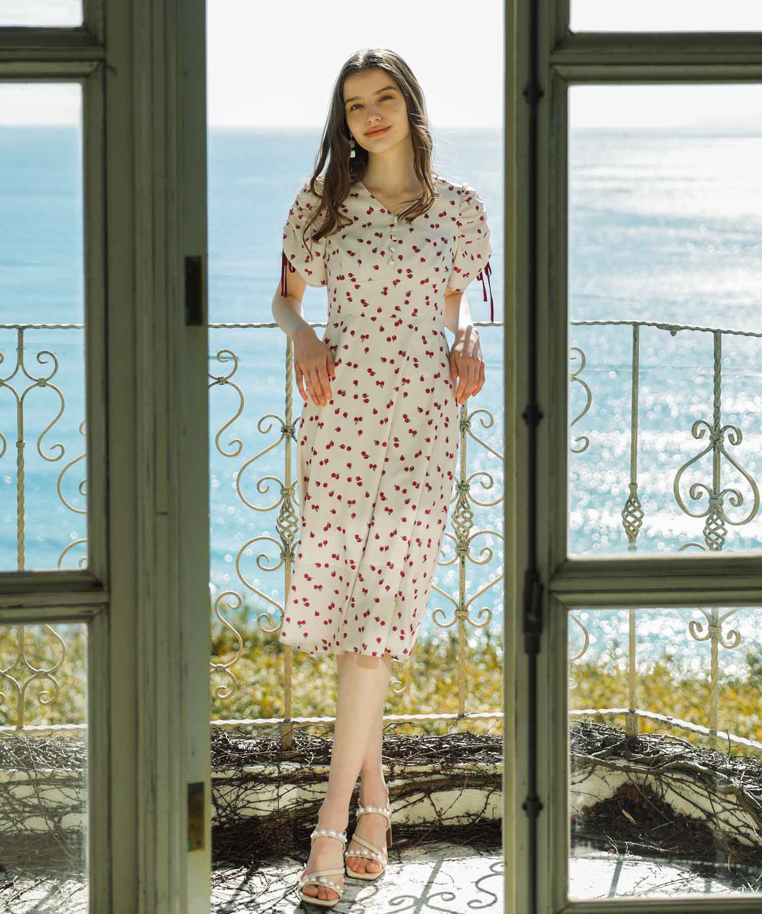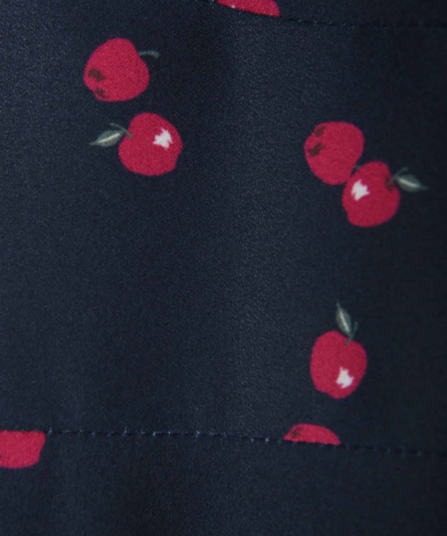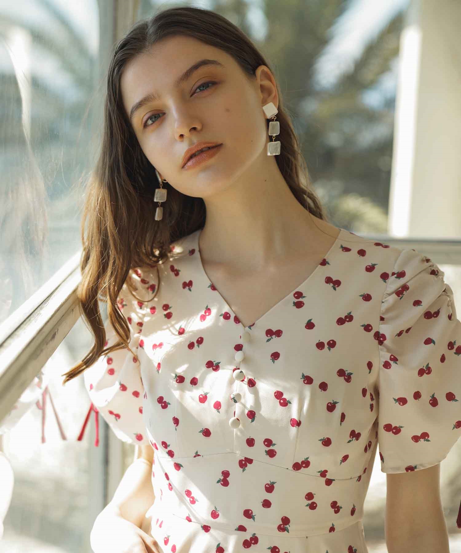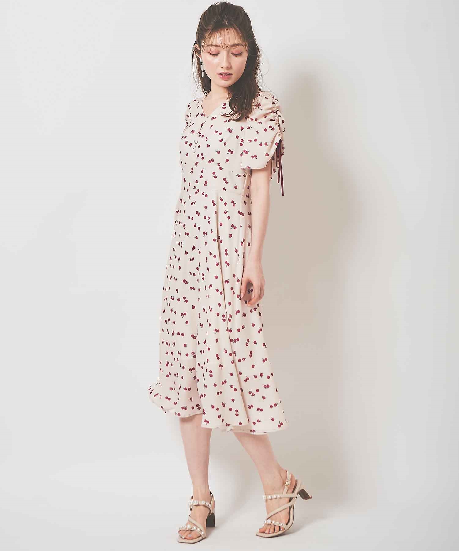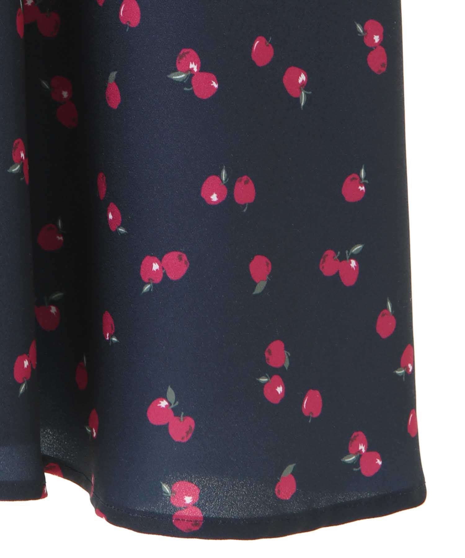 ランダムなリンゴ柄がドット柄見えするPOPなプリントワンピース。袖山シャーリングで袖口にはリンゴと同色のリボン付き。ハイウエスト切り替えでスタイルよく見せてくれる、夏らしく華やかなワンピース。