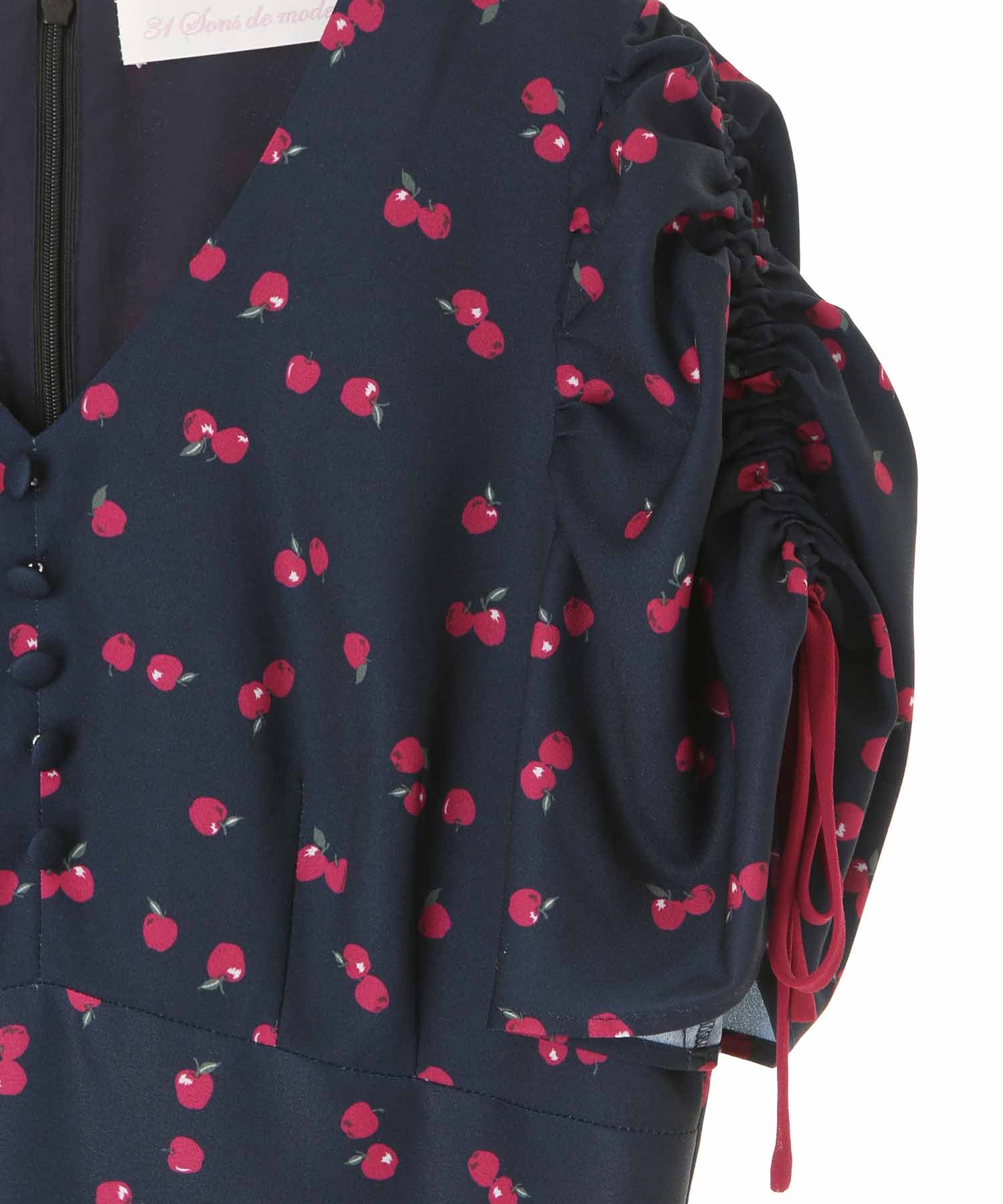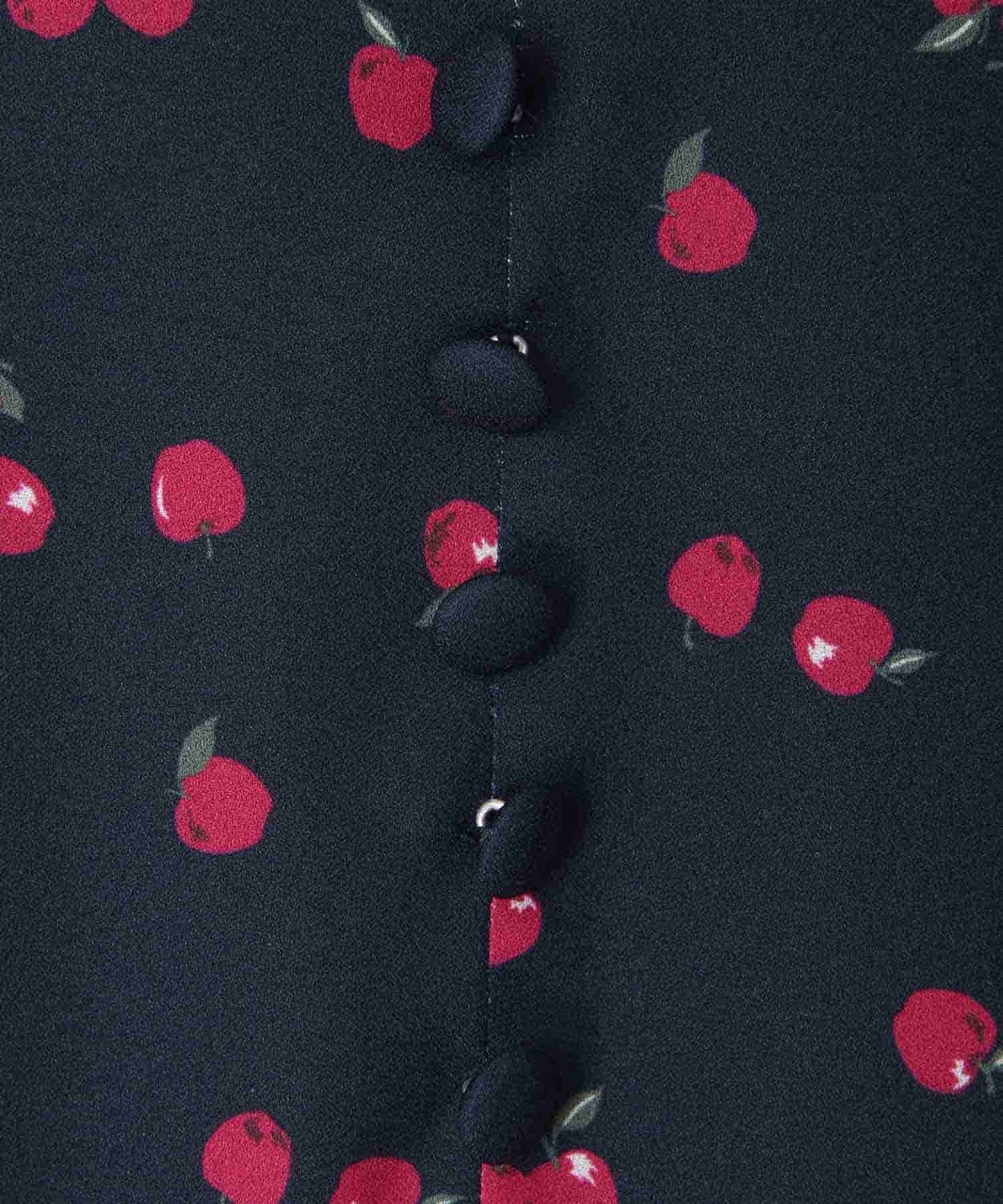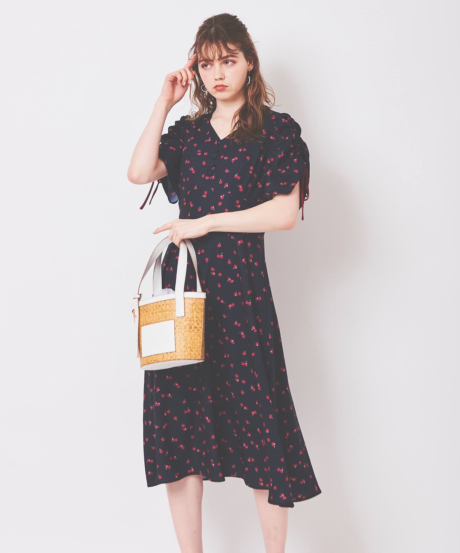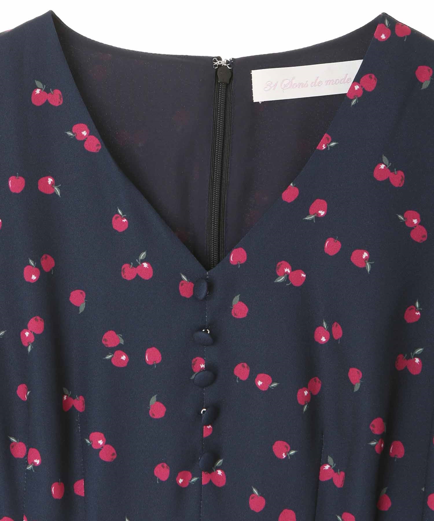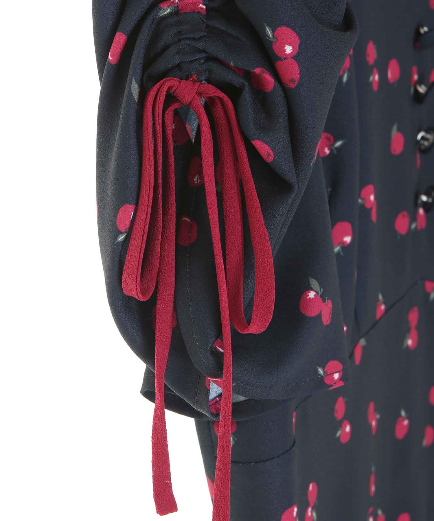 ランダムなリンゴ柄がドット柄見えするPOPなプリントワンピース。袖山シャーリングで袖口にはリンゴと同色のリボン付き。ハイウエスト切り替えでスタイルよく見せてくれる、夏らしく華やかなワンピース。