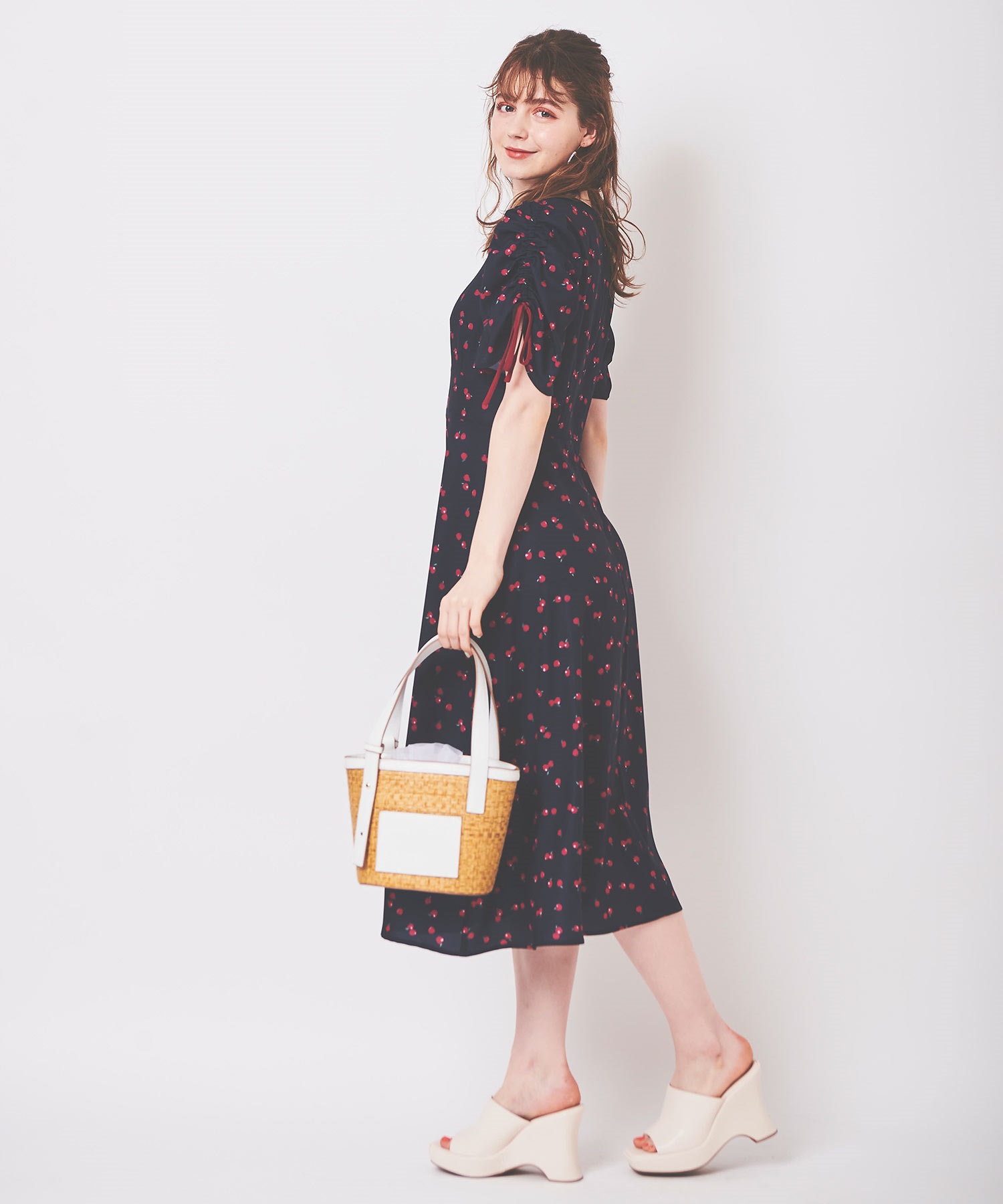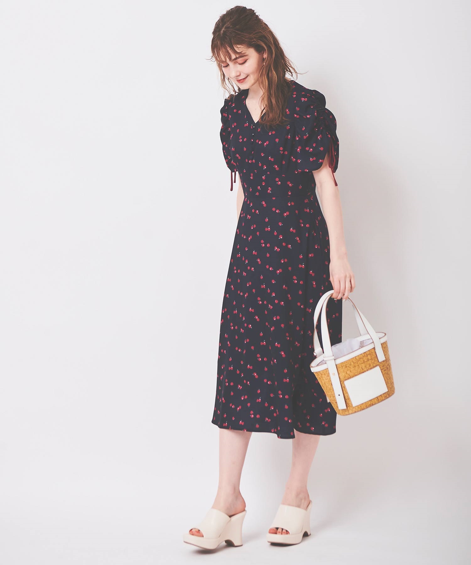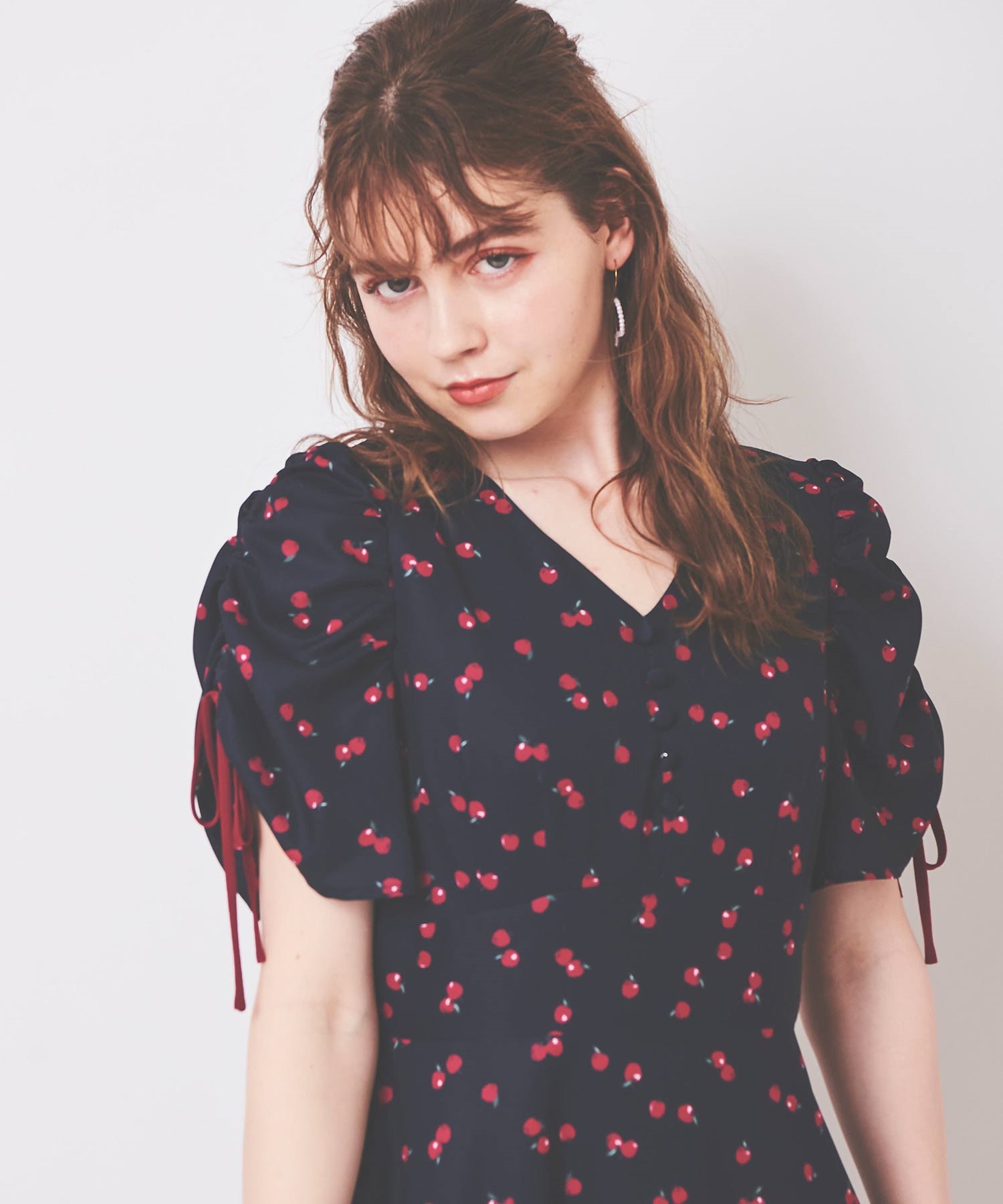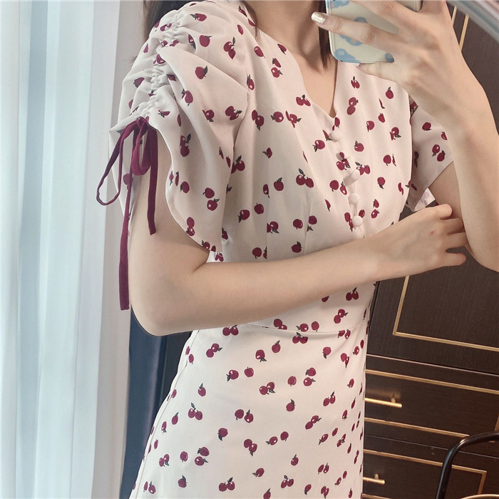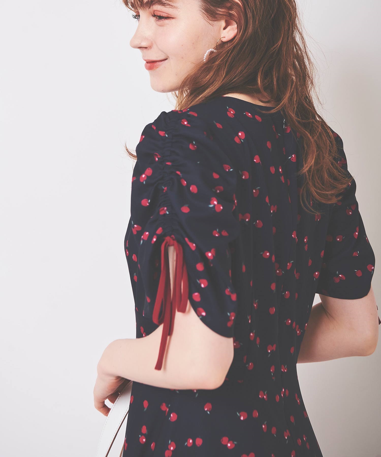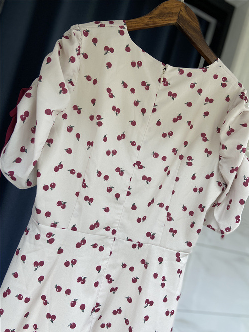 ランダムなリンゴ柄がドット柄見えするPOPなプリントワンピース。袖山シャーリングで袖口にはリンゴと同色のリボン付き。ハイウエスト切り替えでスタイルよく見せてくれる、夏らしく華やかなワンピース。