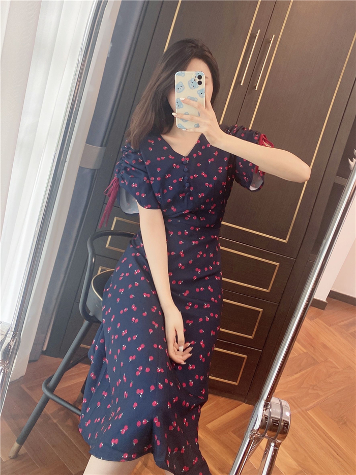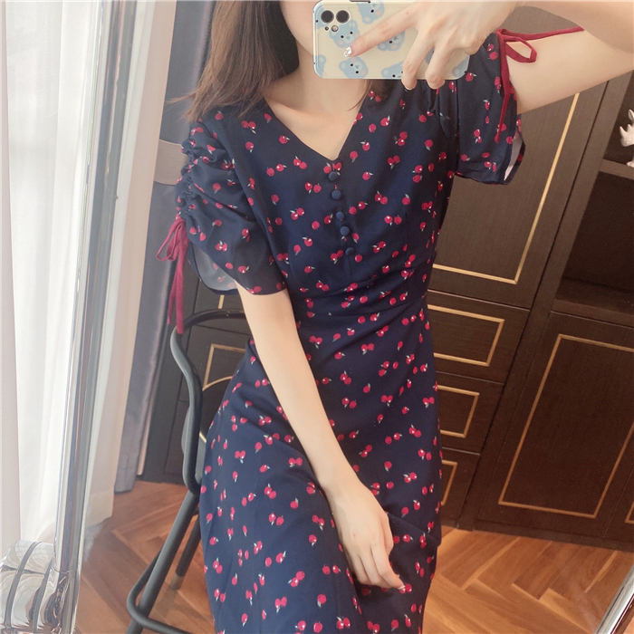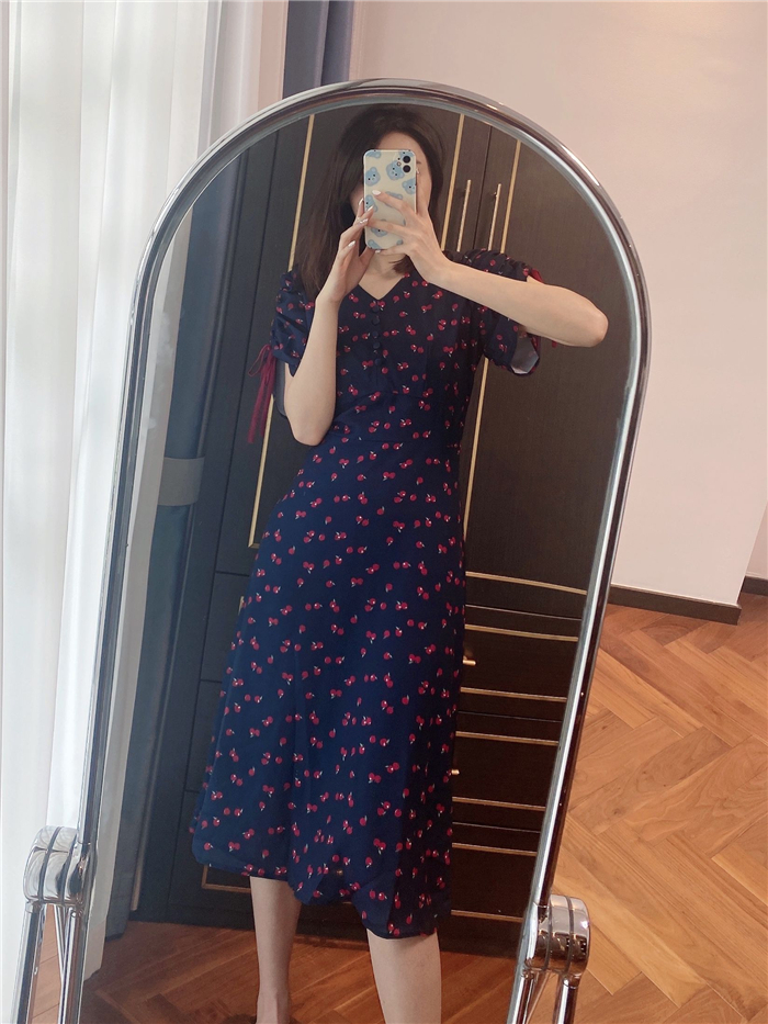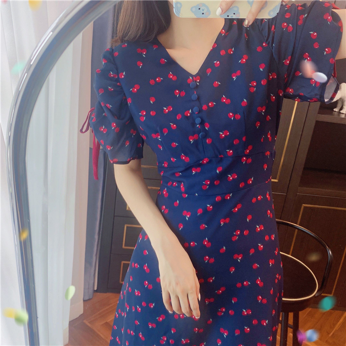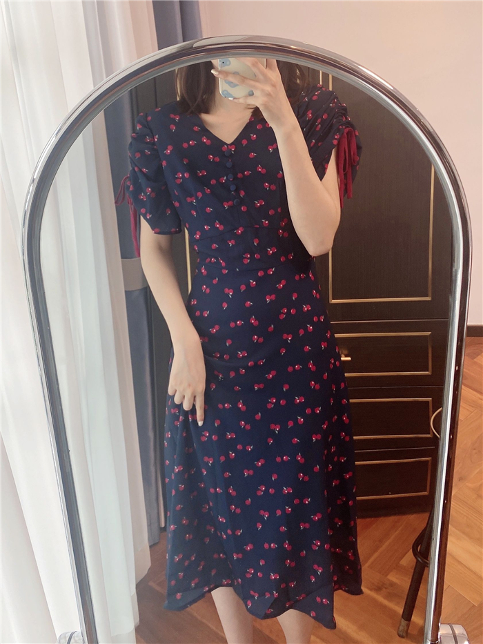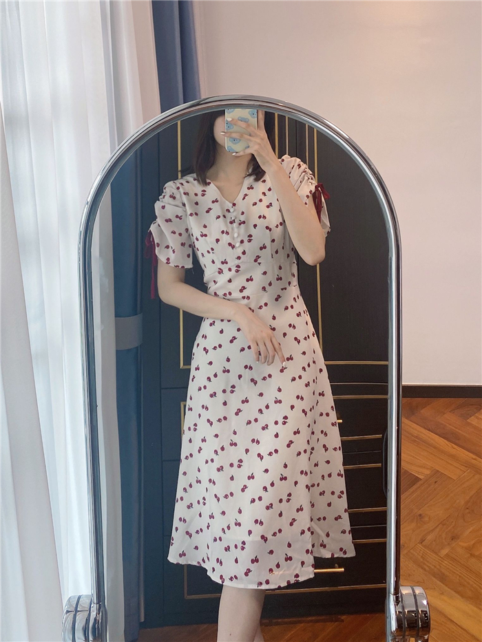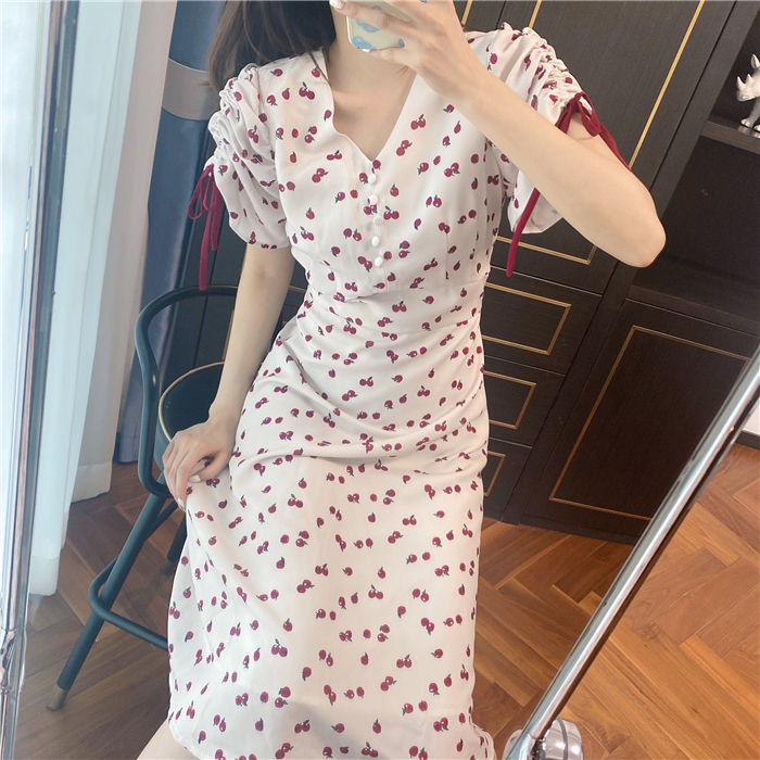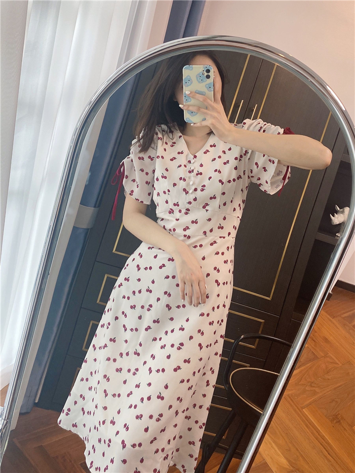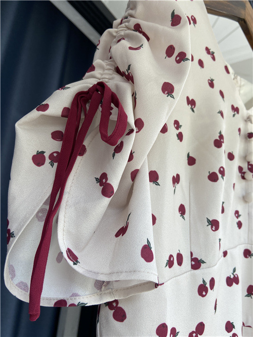 ランダムなリンゴ柄がドット柄見えするPOPなプリントワンピース。袖山シャーリングで袖口にはリンゴと同色のリボン付き。ハイウエスト切り替えでスタイルよく見せてくれる、夏らしく華やかなワンピース。