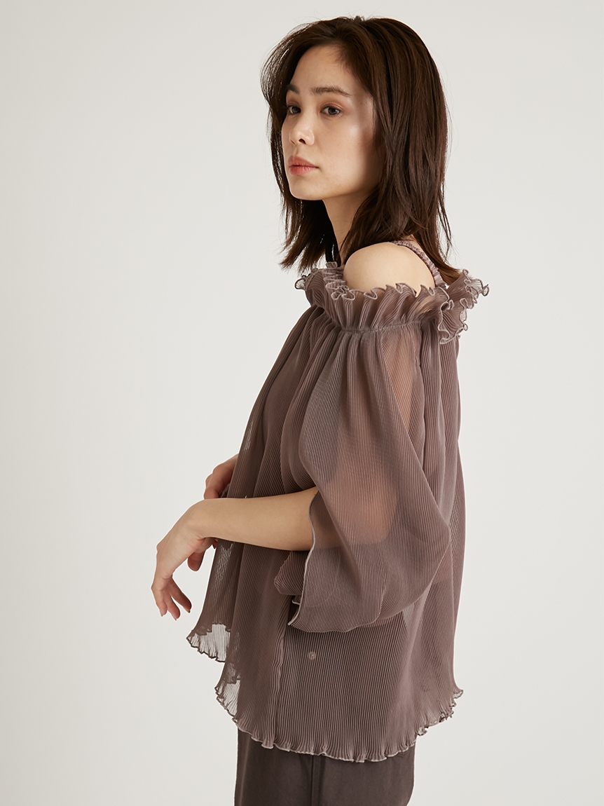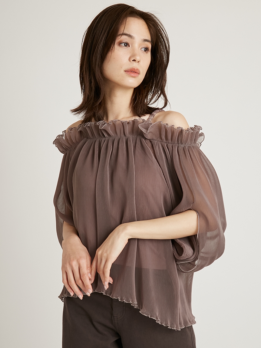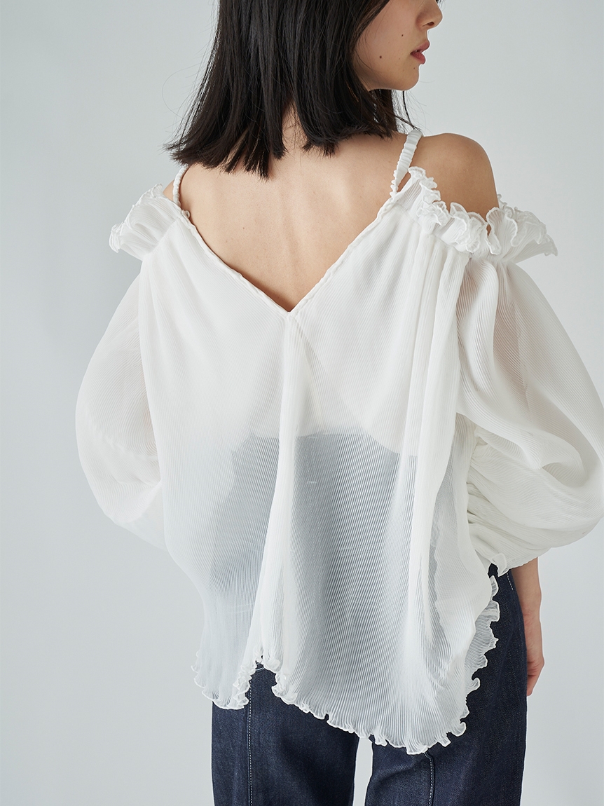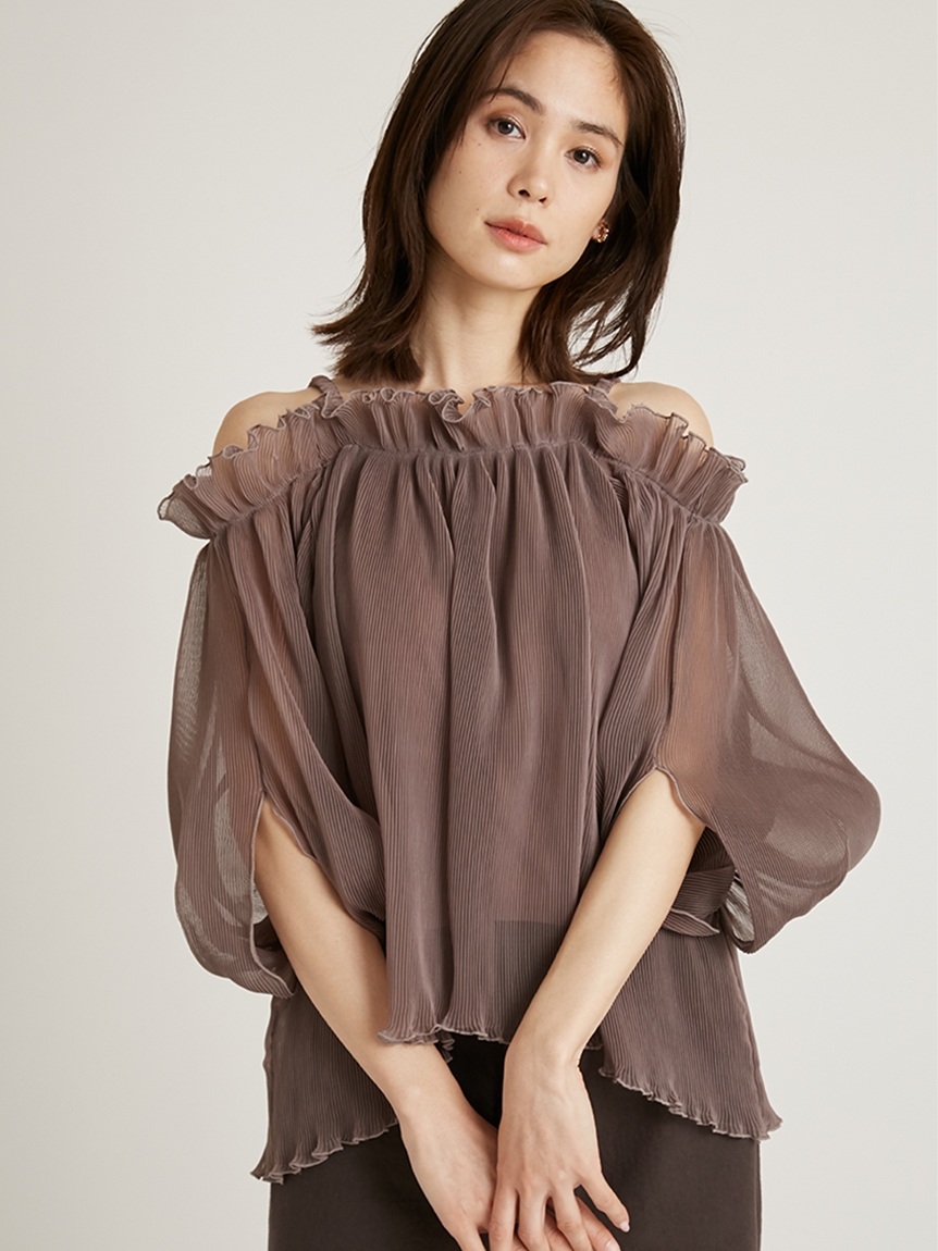 全体に細かなプリーツを畳んだ軽やかな素材感で、シーズンスタイルにぴったりのブラウス。軽やかな素材ながらハリ感のある素材に立体的な袖がモード感を引き立てます。バックに備えたボタンを外せばオフショルにもできる2WAYデザインで、アレンジ力は◎。肩紐があしらわれているのでずり落ちる心配もなく、安心して着られます。