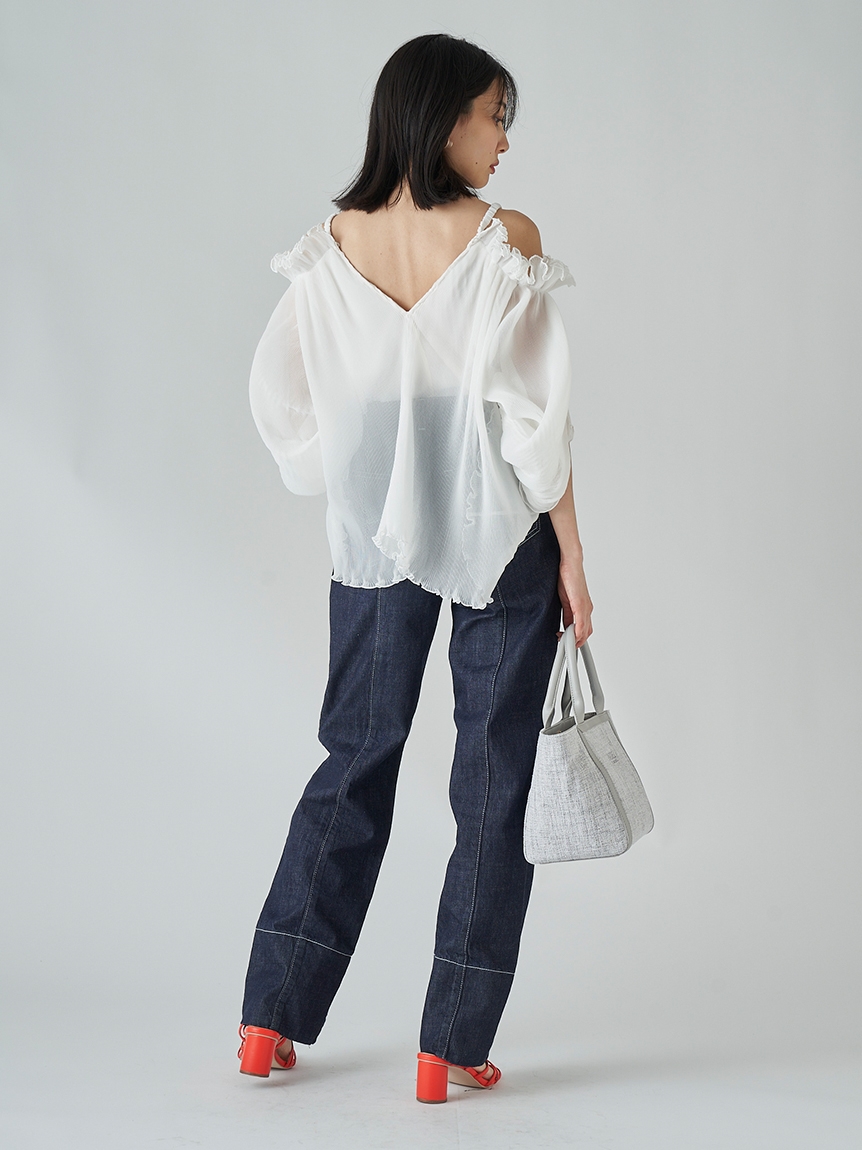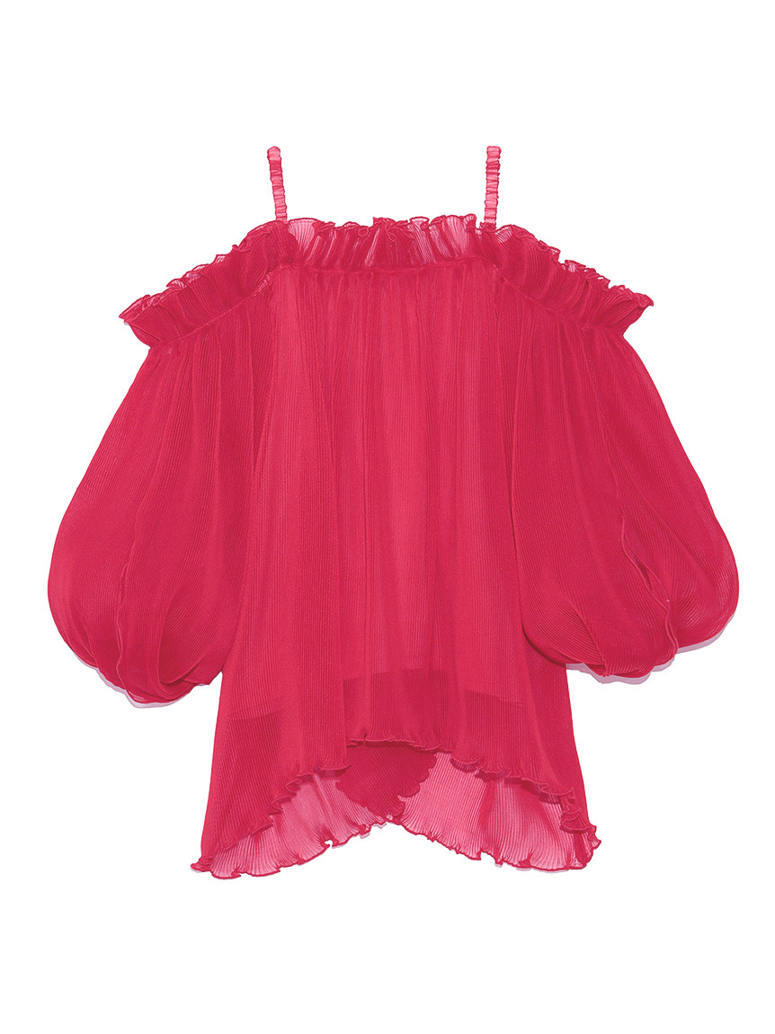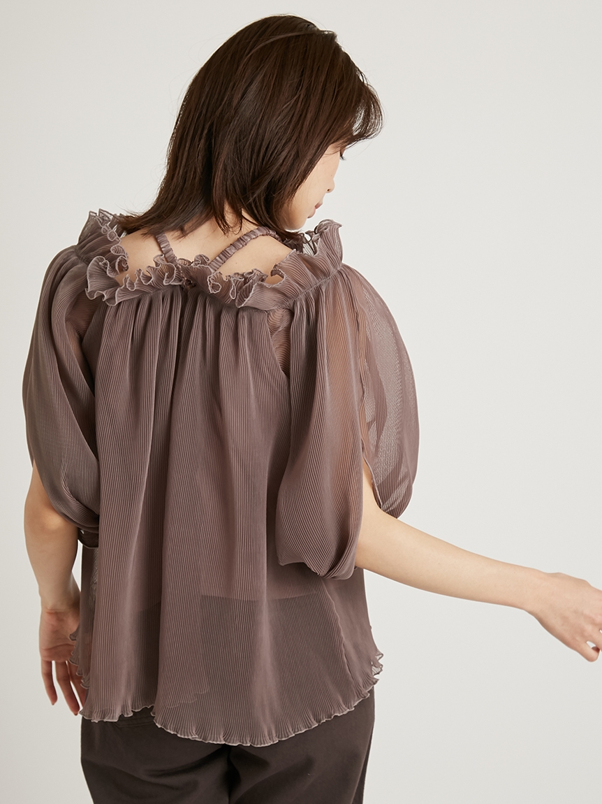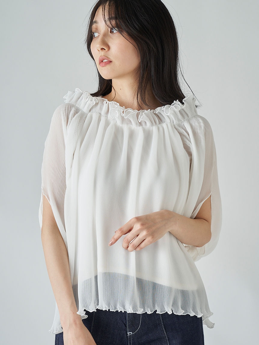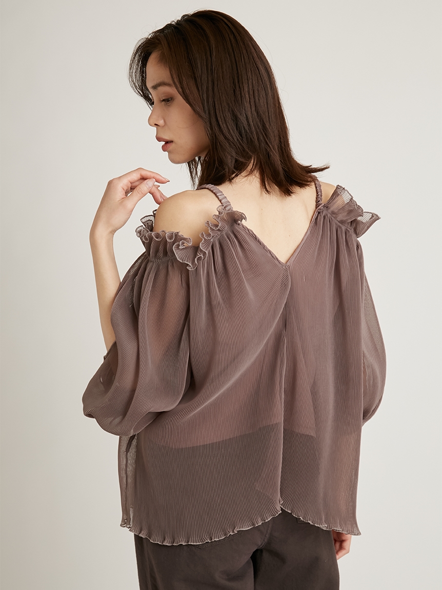 全体に細かなプリーツを畳んだ軽やかな素材感で、シーズンスタイルにぴったりのブラウス。軽やかな素材ながらハリ感のある素材に立体的な袖がモード感を引き立てます。バックに備えたボタンを外せばオフショルにもできる2WAYデザインで、アレンジ力は◎。肩紐があしらわれているのでずり落ちる心配もなく、安心して着られます。