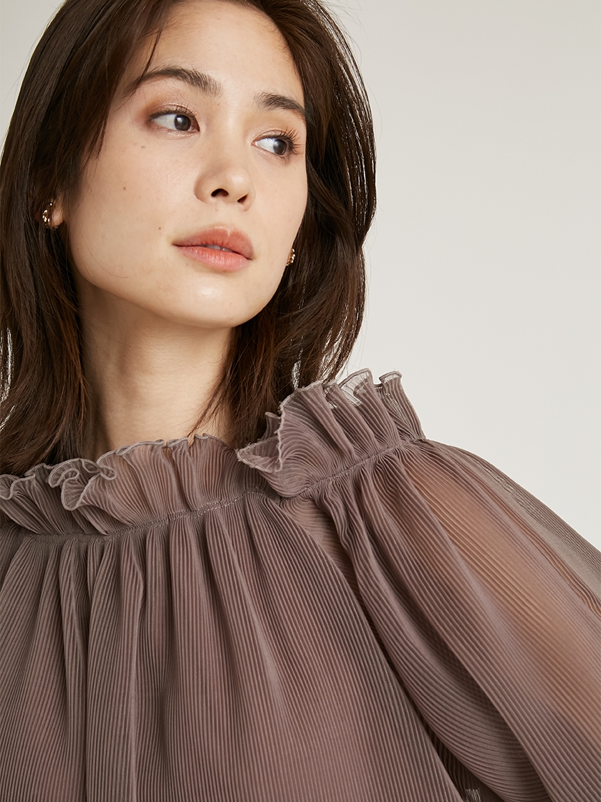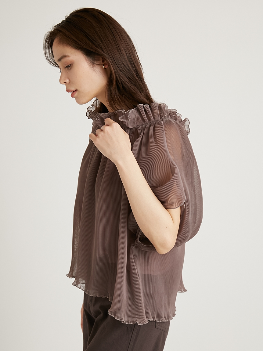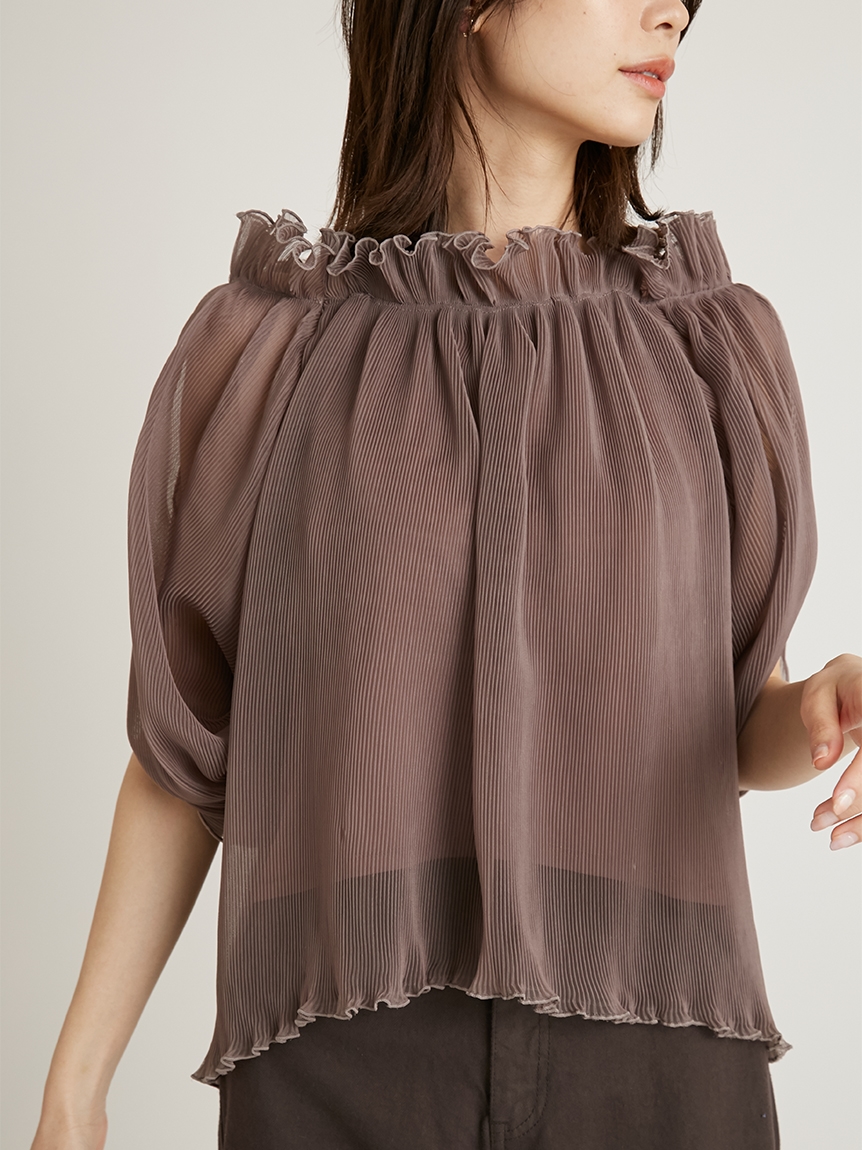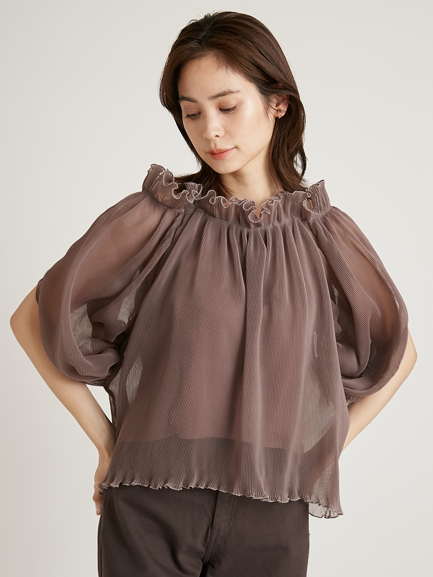 全体に細かなプリーツを畳んだ軽やかな素材感で、シーズンスタイルにぴったりのブラウス。軽やかな素材ながらハリ感のある素材に立体的な袖がモード感を引き立てます。バックに備えたボタンを外せばオフショルにもできる2WAYデザインで、アレンジ力は◎。肩紐があしらわれているのでずり落ちる心配もなく、安心して着られます。